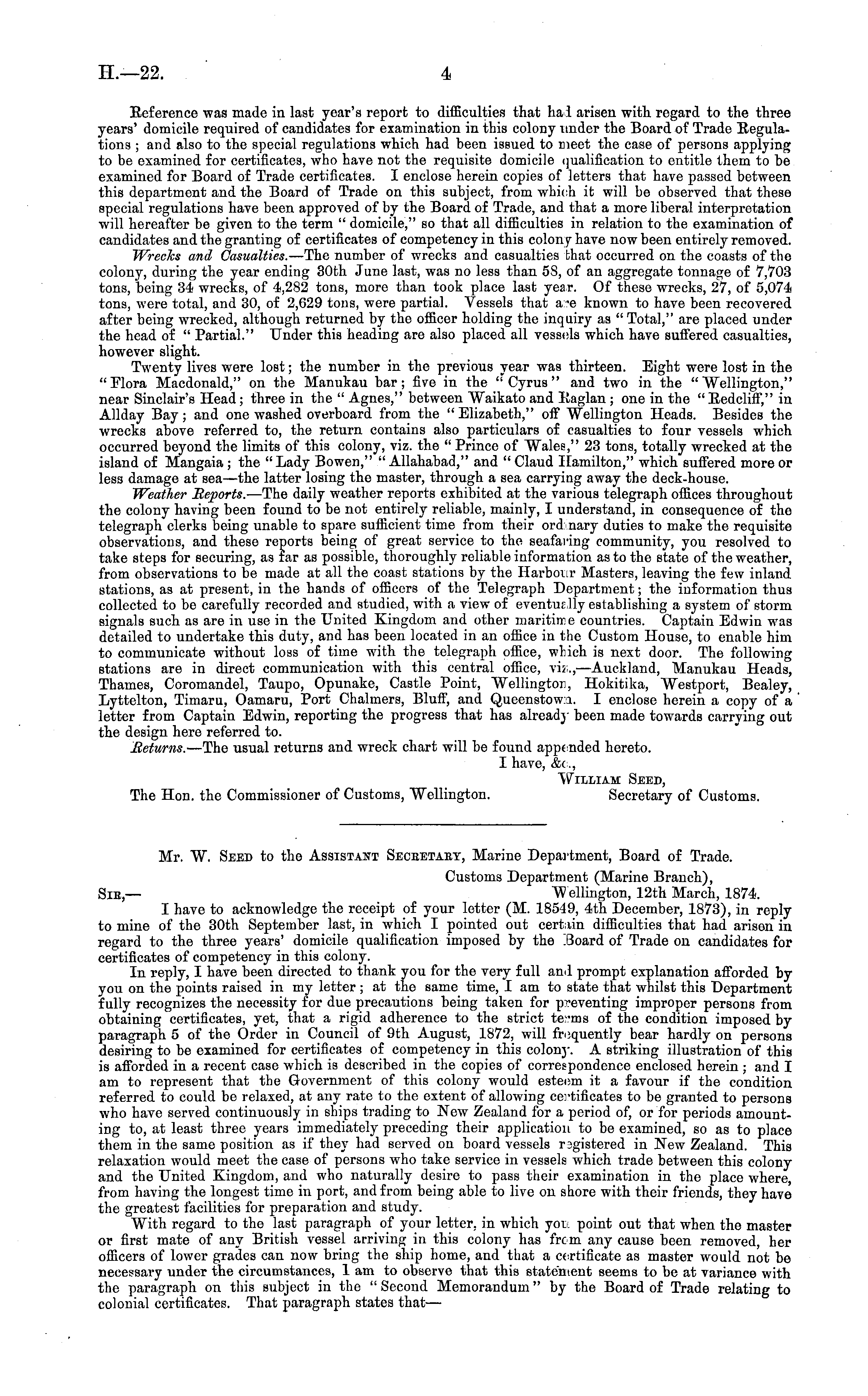 Mr. ~W. Seed to the Assistant Secbetaey, Marine Department, Board of Trade. Customs Department (Marine Branch), Sib,— ■Wellington, 12th March, 1874. I have to acknowledge the receipt of your letter (M. 18549, 4th December, 1873), in replyto mine of the 30th September last, in which I pointed out certain difficulties that had arisen in regard to the three years' domicile qualification imposed by the 3oard of Trade on candidates for certificates of competency in this colony. In reply, I have been directed to thank you for the very full anil prompt explanation afforded by you on the points raised in my letter ; at the same time, I am to state that whilst this Department fully recognizes the necessity for due precautions being taken for preventing improper persons from obtaining certificates, yet, that a rigid adherence to the strict terms of the condition imposed by paragraph 5 of the Order in Council of 9th August, 1872, will frequently bear hardly on persons desiring to be examined for certificates of competency in this colony. A striking illustration of this is afforded in a recent case which is described in the copies of correspondence enclosed herein ; and I am to represent that the Government of this colony would esteem it a favour if the condition referred to could be relaxed, at any rate to the extent of allowing certificates to be granted to persona who have served continuously in ships trading to New Zealand for a period of, or for periods amounting to, at least three years immediately preceding their application to be examined, so as to place them in the same position as if they had served on board vessels rjgistered in New Zealand. This relaxation would meet the case of persons who take service in vessels which trade between this colony and the United Kingdom, and who naturally desire to pass their examination in the place where, from having the longest time in port, and from being able to live on shore with their friends, they have the greatest facilities for preparation and study. With regard to the last paragraph of your letter, in which yoi. point out that when the master or first mate of any British vessel arriving in this colony has frcm any cause been removed, her officers of lower grades can now bring the ship home, and that a certificate as master would not be necessary under the circumstances, 1 am to observe that this statement seems to be at variance with the paragraph on this subject in the " Second Memorandum" by the Board of Trade relating to colonial certificates. That paragraph states that —