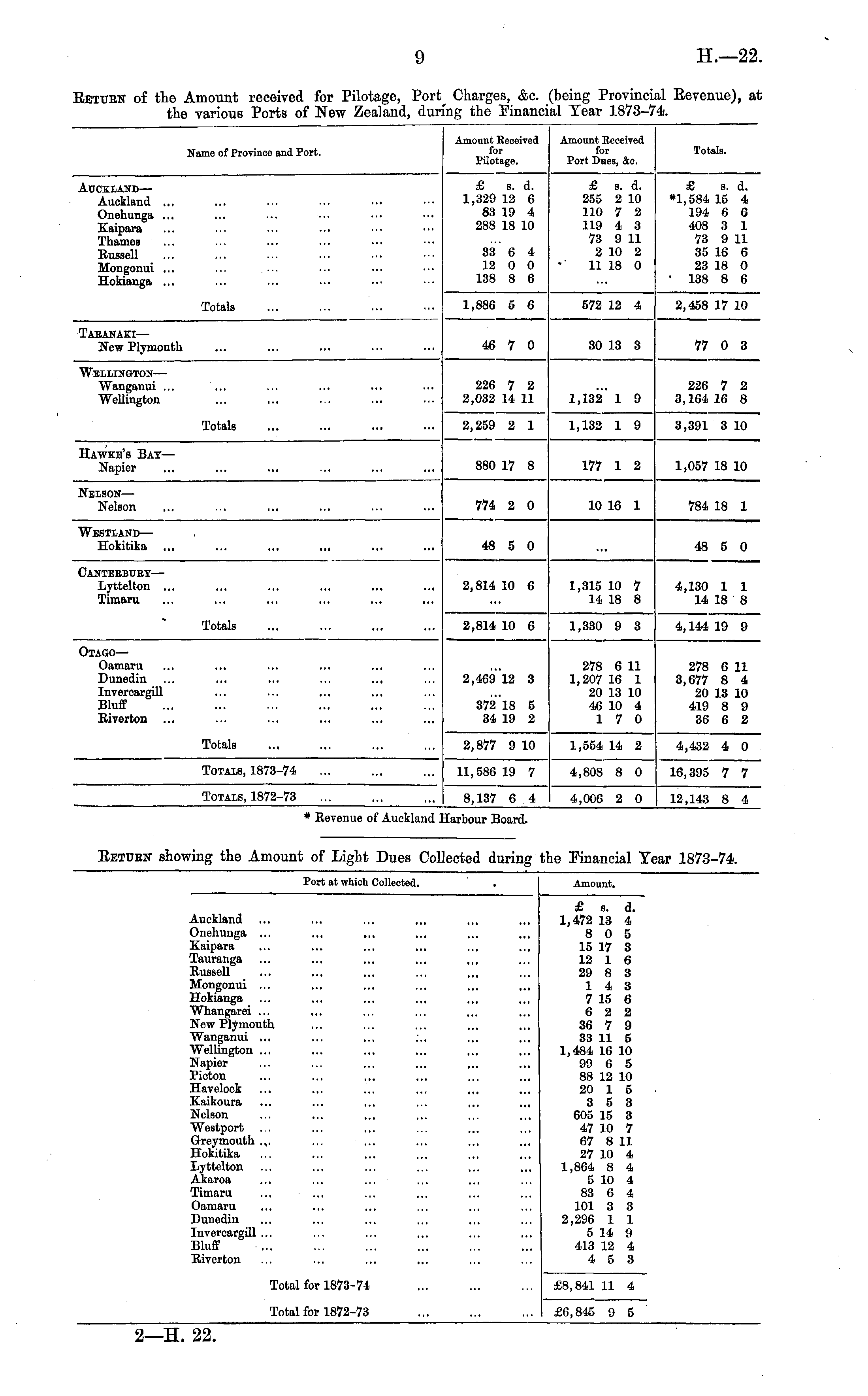 RETURN of the Amount received for Pilotage, Port Charges, &c. (being Provincial Revenue), at the various Ports of New Zealand, during the Financial Year 1873-74.