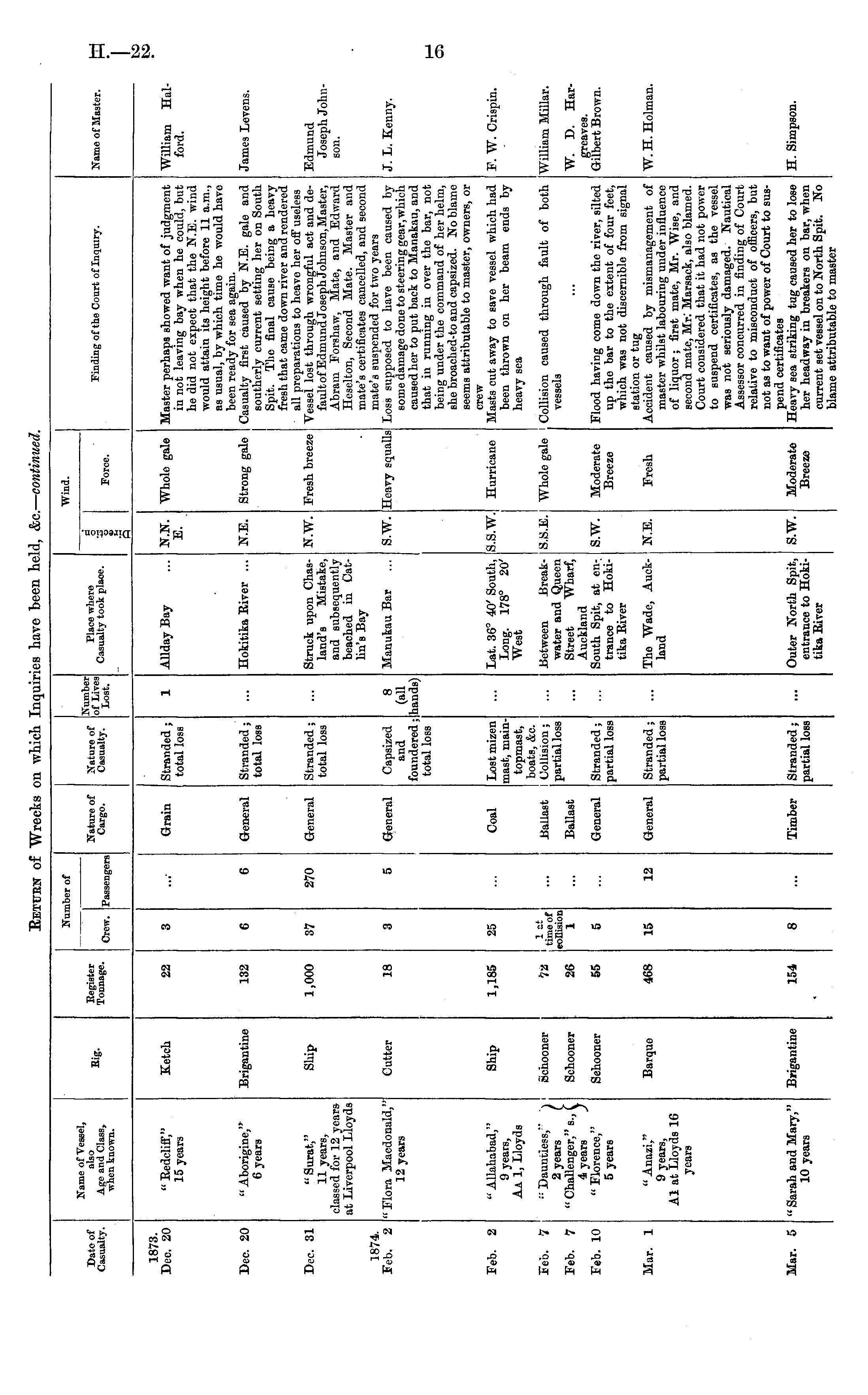 Eettjrn of Wrecks m which Inquiries have been he] .d, &c. — continued. Date of Casualty. Name of Vessel, »lso Age and Class, ■when known. Rig. Register Tonnage. Nun ! nber of Nature of Passengers argo. Nature of Casualty. Number of Lives Lost. Place where Casualty took place. s Wind. Finding of the Court of Inquiry. Crew. Force. Name of Master. 1873. Doc. 20 Stranded ; total loss " Redcliff," 15 years Ketch 22 Grain AlldayBay N.N. E. Whole gale Master perhaps showed want of judgment in not leaving bay when he could, but he did not expect that the N.E. wind would attain its height before 11 a.m., as usual, by which time he would have been ready for sea again. Casualty first caused by N.E. gale and southerly current setting her on South Spit. The final cause being a heavy fresh that came down river and rendered all preparations to heave her off useless Vessel lost through wrongful act and default of Edmund Joseph Johnson, Master, Abram Forshaw, Mate, and Edward Heselton, Second Mate. Master and mate's certificates cancelled, and 9econd mate's suspended for two years Loss supposed to have been caused by some damage done to steering gear, which caused her to put back to Manakau, and that in running in over the bar, not being under the command of her helm, she broached-to and capsized. No blame seems attributable to master, owners, or William Halford. Dec. 20 " Aborigine," 6 years Brigantine 132 General Stranded ; total loss Hokitika River ... N.E. Strong gale James Levens. " Surat," 11 years, classed for 12 years at Liverpool Lloyds Ship 1,000 Stranded ; total loss Struck upon Chasland's Mistake, and subsequently beached in Catlin's Bay Fresh breeze Edmund Joseph Johnson. Dec. 31 37 270 General N.W. 1874. Feb. 2 "Flora Macdonald," 12 years Cutter 18 General Capsized and foundered; total loss I 8 (all hands) Manukau Bar S.W. Heavy squalls J. L. Kenny. "Allahabad," 9 years, Aa 1, Lloyds Lat. 36° 40' South, Long. 178° 20' West crew Masts cut away to save vessel which had been thrown on her beam ends by heavy sea Feb. 2 Ship 1,185 25 Coal Lost mizen mast, maintopmast, boats, &c. Collision ; partial loss s.s.w. Hurricane F. W. Crispin. Jjeb. 1 :: Bauntiess," \ I 2 years f " Challenger," s., ( 4 years J " Florence," 5 years Schooner Ti 1 1 at I time of collision 1 Ballast Between Breakwater and Queen Street Wharf, Auckland South Spit, at entrance to Hokitika River 3.8.E. Whole gale Collision caused through fault of both vessels [William Millar. Feb. 7 Schooner 26 Ballast W. D. HarFeb. 10 Schooner 55 5 General Stranded; partial loss S.W. Moderate Breeze Flood having come down the river, silted up the bar to the extent of four feet, which was not discernible from signal station or tug Accident caused by mismanagement of master whilst labouring under influence of liquor; first mate, Mr. Wise, and second mate, Mr.' Marsack, also blamed. Court considered that it had not power to suspend certificates, as the vessel was not seriously damaged. Nautical Assessor concurred in finding of Court relative to misconduct of officers, but not as to want of power of Court to suspend certificates Heavy sea striking tug caused her to lose her headway in breakers on bar, when current set vessel on to North Spit. No blame attributable to master greaves. Gilbert Brown. Mar. 1 " Anazi," 9 years, Al at Lloyds 16 years Barque 468 12 General Stranded; partial loss The Wade, Auckland Fresh W. H. Holman. 13 N.E. "Sarah and Mary," 10 years Slar. 5 Brigantine 154 Timber Stranded; partial loss Outer North Spit, entrance to Hokitika River S.W. Moderate Breeze H. Simpson. *