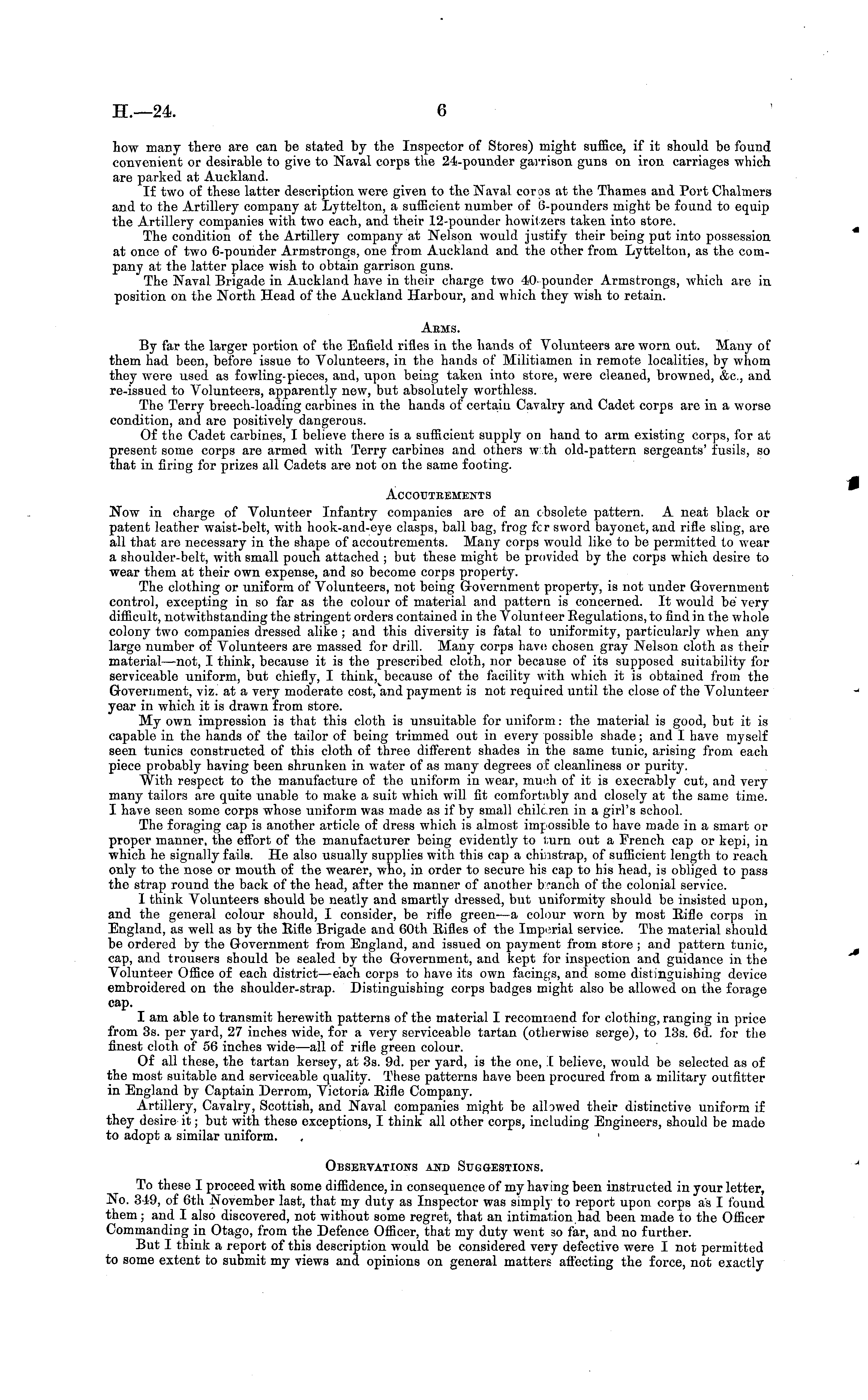 how many there are can be stated by the Inspector of Stores) might suffice, if it should be found convenient or desirable to give to Naval corps the 24-pounder garrison guns on iron carriages which are parked at Auckland. If two of these latter description were given to the Naval corps at the Thames and Port Chalmers and to the Artillery company at Lyttelton, a sufficient number of 6-pounders might be found to equip the Artillery companies with two each, and their 12-pounder howitzers taken into store. The condition of the Artillery company at Nelson would justify their being put into possession at once of two 6-pounder Armstrongs, one from Auckland and the other from Lyttelton, as the company at the latter place wish to obtain garrison guns. The Naval Brigade in Auckland have in their charge two 40-pounder Armstrongs, which are in position on the North Head of the Auckland Harbour, and which they wish to retain. Arms. By far the larger portion of the Enfield rifles in the hands of Volunteers are worn out. Many of them had been, before issue to Volunteers, in the hands of Militiamen in remote localities, by whom they were used as fowling-pieces, and, upon being taken into store, were cleaned, browned, &c, and re-issued to Volunteers, apparently new, but absolutely worthless. The Terry breech-loading carbines in the hands of certain Cavalry and Cadet corps are in a worse condition, and are positively dangerous. Of the Cadet carbines, I believe there is a sufficient supply on hand to arm existing corps, for at present some corps are armed with Terry carbines and others w.th old-pattern sergeants' fusils, so that in firing for prizes all Cadets are not on the same footing. Accoutrements Now in charge of Volunteer Infantry companies are of an obsolete pattern. A neat black or patent leather waist-belt, with hook-and-eye clasps, ball bag, frog for sword bayonet, and rifle sling, are all that are necessary in the shape of accoutrements. Many corps would like to be permitted to wear a shoulder-belt, with small pouch attached ; but these might be provided by the corps which desire to wear them at their own expense, and so become corps property. The clothing or uniform of Volunteers, not being Government property, is not under Government control, excepting in so far as the colour of material and pattern is concerned. It would be very difficult, notwithstanding the stringent orders contained in the Volunteer Regulations, to find in the whole colony two companies dressed alike ; and this diversity is fatal to uniformity, particularly when any large number of Volunteers are massed for drill. Many corps have chosen gray Nelson cloth as their material —not, I think, because it is the prescribed cloth, nor because of its supposed suitability for serviceable uniform, but chiefly, I think, because of tho facility with which it is obtained from the Government, viz. at a very moderate cost, and payment is not required until the close of the Volunteer year in which it is drawn from store. My own impression is that this cloth is unsuitable for uniform: the material is good, but it is capable in the hands of the tailor of being trimmed out in every possible shade; and I have myself seen tunics constructed of this cloth of three different shades in the same tunic, arising from each piece probably having been shrunken in water of as many degrees of cleanliness or purity. With respect to the manufacture of the uniform in wear, much of it is execrably cut, and very many tailors are quite unable to make a suit which will fit comfortably and closely at the same time. I have seen some corps whose uniform was made as if by small chilc.ren in a girl's school. The foraging cap is another article of dress which is almost impossible to have made in a smart or proper manner, the effort of the manufacturer being evidently to turn out a French cap or kepi, in which he signally fails. He also usually supplies with this cap a chf.astrap, of sufficient length to reach only to the nose or mouth of the wearer, who, in order to secure his cap to his head, is obliged to pass the strap round the back of the head, after the manner of another branch of the colonial service. I think Volunteers should be neatly and smartly dressed, but uniformity should be insisted upon, and the general colour should, I consider, be rifle green. —a colour worn by most Rifle corps in England, as well as by the Rifle Brigade and 60th Rifles of the Imperial service. The material should be ordered by the Government from England, and issued on payment from store ; and pattern tunic, cap, and trousers should be sealed by the Government, and kept for inspection and guidance in the Volunteer Office of each district—each corps to have its own facings, and some distinguishing device embroidered on the shoulder-strap. Distinguishing corps badges might also be allowed on the forage cap. I am able to transmit herewith patterns of the material I recommend for clothing, ranging in price from 3s. per yard, 27 inches wide, for a very serviceable tartan (otherwise serge), to 13s. 6d. for the finest cloth of 56 inches wide —all of rifle green colour. Of all these, the tartan kersey, at 3s. 9d. per yard, is the one, I believe, would be selected as of the most suitable and serviceable quality. These patterns have been procured from a military outfitter in England by Captain Derrom, Victoria Rifle Company. Artillery, Cavalry, Scottish, and Naval companies might be allowed their distinctive uniform if they desire it; but with these exceptions, I think all other corps, including Engineers, should be made to adopt a similar uniform. Observations and Suggestions. To these I proceed with some diffidence, in consequence of my having been instructed in your letter, No. 349, of 6th November last, that my duty as Inspector was simply to report upon corps as I found them; and I also discovered, not without some regret, that an intimation.had been made to the Officer Commandin