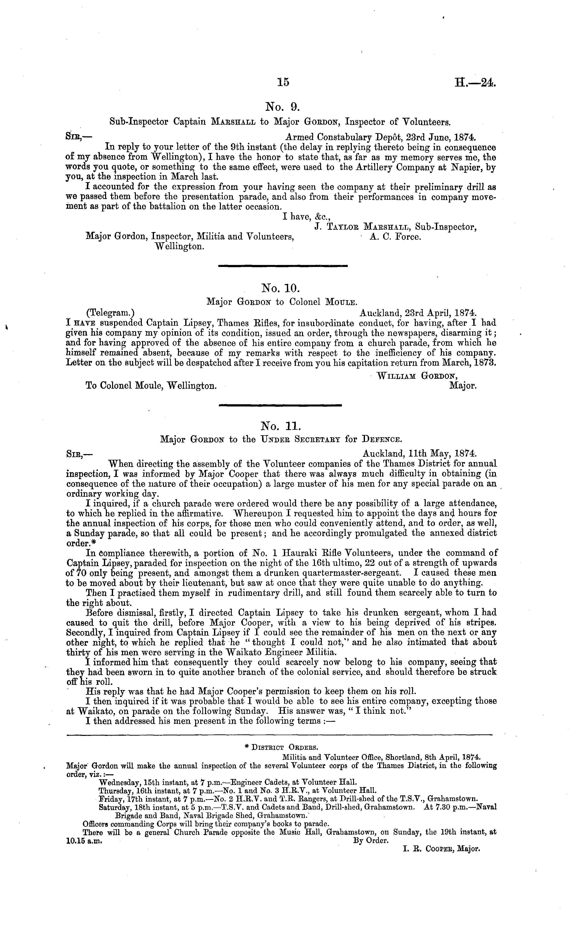 . No. 10. Major Gordon to Colonel Moule. (Telegram.) Auckland, 23rd April, 1874. I have suspended Captain Lipsey, Thames Rifles, for insubordinate conduct, for having, after I had given his company my opinion of its condition, issued an order, through the newspapers, disarming it; and for having approved of the absence of his entire company from a church parade, from which he himself remained absent, because of my remarks with respect to the inefficiency of his company. Letter on the subject will be despatched after I receive from you his capitation return from March, 1873. William Gordon, To Colonel Moule, Wellington. Major.