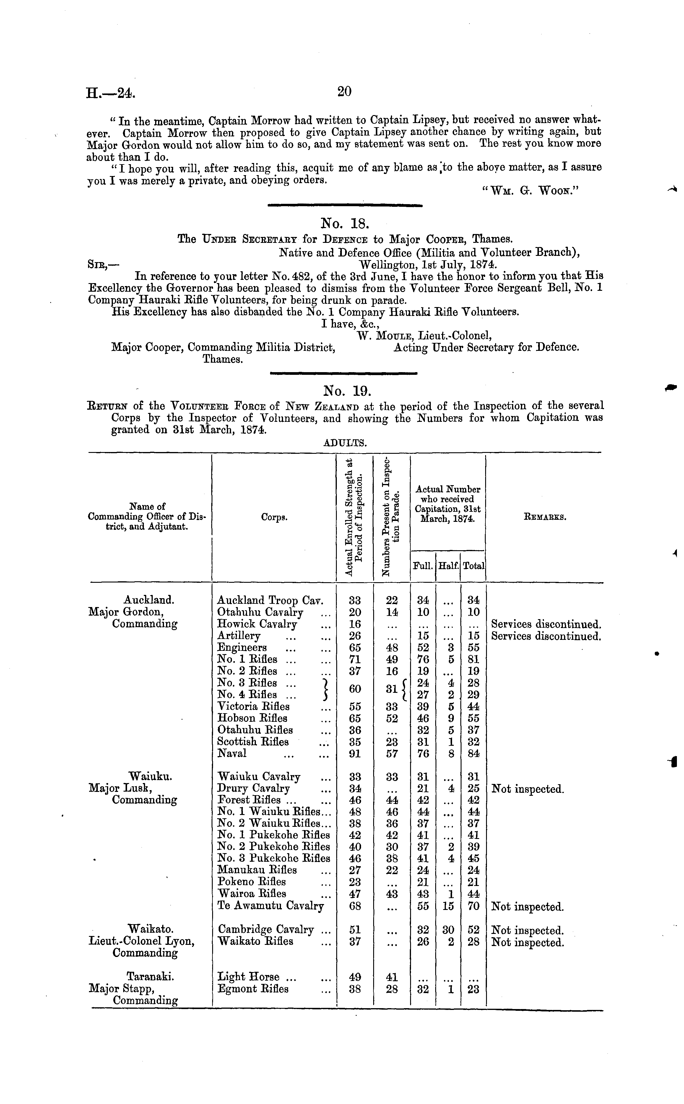 No. 19. RETURN of the VOLUNTEER FORCE of NEW ZEALAND at the period of the Inspection of the several Corps by the Inspector of Volunteers, and showing the Numbers for whom Capitation was granted on 31st March, 1874. ADULTS.