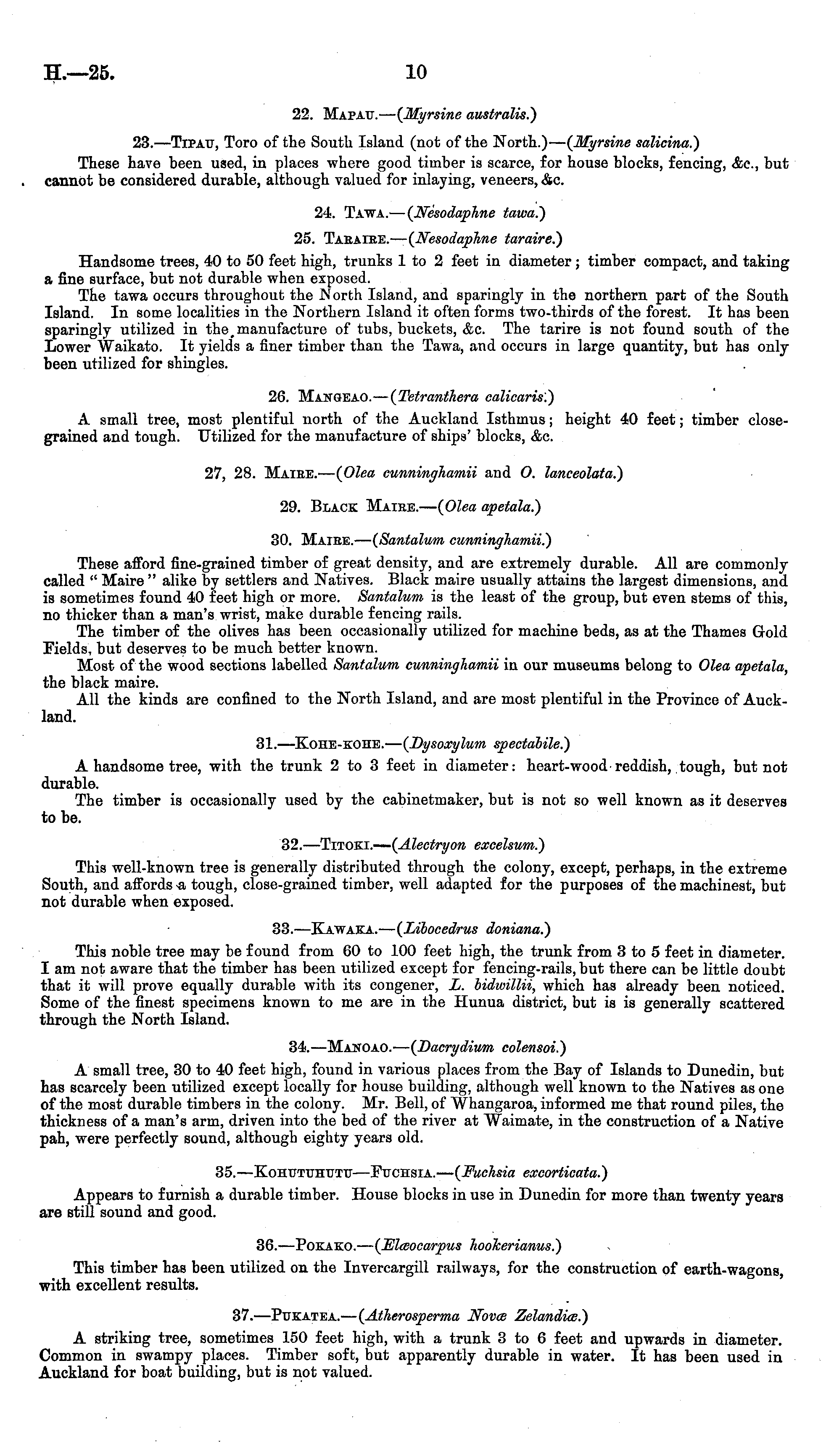 22. Mapau.— (Myrsine australis.) 23. —Tipau, Toro of the South Island (not of the North.) — (Myrsine salicina.) These have been used, in places where good timber is scarce, for house blocks, fencing, &c, but cannot be considered durable, although valued for inlaying, veneers, &c. 24. Tawa. — (Nesodaphne tawa.) 25. Taeaiee. — (Nesodaphne taraire.) Handsome trees, 40 to 50 feet high, trunks Ito 2 feet in diameter; timber compact, and taking a fine surface, but not durable when exposed. The tawa occurs throughout the North Island, and sparingly in the northern part of the South Island. In some localities in the Northern Island it often forms two-thirds of the forest. It has been sparingly utilized in the,manufacture of tubs, buckets, &c. The tarire is not found south of the Lower Waikato. It yields a finer timber than the Tawa, and occurs in large quantity, but has only been utilized for shingles. 26. Mangeao.— (Tetranthera calicaris.) A small tree, most plentiful north of the Auckland Isthmus; height 40 feet; timber closegrained and tough. Utilized for the manufacture of ships' blocks, &c. 27, 28. Maiee.— (Olea cunninghamii and O. lanceolata.) 29. Black Maiee.— (Olea apetala.) 30. Maiee. — (Santalwm cunninghamii.) These afford fine-grained timber of great density, and are extremely durable. All are commonly called " Maire " alike by settlers and Natives. Black maire usually attains the largest dimensions, and is sometimes found 40 feet high or more. Santalwm is the least of the group, but even stems of this, no thicker than a man's wrist, make durable fencing rails. The timber of the olives has been occasionally utilized for machine beds, as at the Thames Gold Fields, but deserves to be much better known. Most of the wood sections labelled Santalum cunninghamii in our museums belong to Olea apetala, the black maire. All the kinds are confined to the North Island, and are most plentiful in the Province of Auckland. 31.—Kohe-kohe. — (Dysoxylum spectabile.) A handsome tree, with the trunk 2 to 3 feet in diameter: heart-wood reddish, tough, but not durable. The timber is occasionally used by the cabinetmaker, but is not so well known as it deserves to be. 32. —Titoki.— (Alectryon excelsum.) This well-known tree is generally distributed through the colony, except, perhaps, in the extreme South, and affords -a tough, close-grained timber, well adapted for the purposes of the machinest, but not durable when exposed. 33.—Kawaka. — (Libocedrus doniana.) This noble tree may be found from 60 to 100 feet high, the trunk from 3 to 5 feet in diameter. I am not aware that the timber has been utilized except for fencing-rails, but there can be little doubt that it will prove equally durable with its congener, L. bidwillii, which has already been noticed. Some of the finest specimens known to me are in the Hunua district, but is is generally scattered through the North Island. 34.—Manoao.— (Dacrydium colensoi.) A small tree, 30 to 40 feet high, found in various places from the Bay of Islands to Dunedin, but has scarcely been utilized except locally for house building, although well known to the Natives as one of the most durable timbers in the colony. Mr. Bell, of Whangaroa, informed me that round piles, the thickness of a man's arm, driven into the bed of the river at Waimate, in the construction of a Native pah, were perfectly sound, although eighty years old. 35. —Kohutuhutu—Fuchsia.— (Fuchsia excorticata.) Appears to furnish a durable timber. House blocks in use in Dunedin for more than twenty years are still sound and good. 36. —Pokako. — (Elaocarpus hookerianus.) This timber has been utilized on the Invercargill railways, for the construction of earth-wagons, with excellent results. 37.—Pukatea.— (Atherosperma Nova Zelandice.) A striking tree, sometimes 150 feet high, with a trunk 3 to 6 feet and upwards in diameter. Common in swampy places. Timber soft, but apparently durable in water. It has been used in Auckland for boat building, but is not valued.