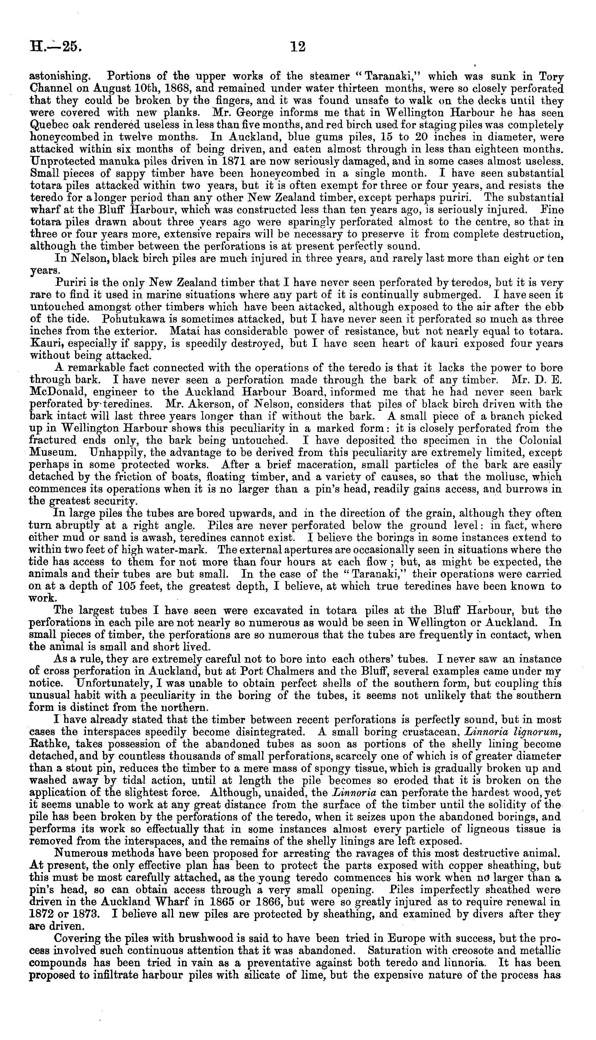 astonishing. Portions of the upper works of the steamer " Taranaki," which was sunk in Tory Channel on August 10th, 1868, and remained under water thirteen months, were so closely perforated that they could be broken by the fingers, and it was found unsafe to walk on the decks until they were covered with new planks. Mr. George informs me that in Wellington Harbour he has seen Quebec oak rendered useless in less than five months, and red birch used for staging piles was completely honeycombed in twelve months. In Auckland, blue gums piles, 15 to 20 inches in diameter, were attacked within six months of being driven, and eaten almost through in less than eighteen months. Unprotected manuka piles driven in 1871 are now seriously damaged, and in some cases almost useless. Small pieces of sappy timber have been honeycombed in a single month. I have seen substantial totara piles attacked within two years, but it is often exempt for three or four years, and resists the teredo for alonger period than any other New Zealand timber, except perhaps puriri. The substantial wharf at the Bluff Harbour, which was constructed less than ten years ago, is seriously injured. Fine totara piles drawn about three years ago were sparingly perforated almost to the centre, so that in three or four years more, extensive repairs will be necessary to preserve it from complete destruction, although the timber between the perforations is at present perfectly sound. In Nelson, black birch piles are much injured in three years, and rarely last more than eight or ten years. Puriri is the only New Zealand timber that I have never seen perforated by teredos, but it is very rare to find it used in marine situations where any part of it is continually submerged. I have seen it untouched amongst other timbers which have been attacked, although exposed to the air after the ebb of the tide. Pohutukawa is sometimes attacked, but I have never seen it perforated so much as three inches from the exterior. Matai has considerable power of resistance, but not nearly equal to totara. Kauri, especially if sappy, is speedily destroyed, but I have seen heart of kauri exposed four years without being attacked. A remarkable fact connected with the operations of the teredo is that it lacks the power to bore through bark. I have never seen a perforation made through the bark of any timber. Mr. D. E. McDonald, engineer to the Auckland Harbour Board, informed me that he had never seen bark perforated by teredines. Mr. Akerson, of Nelson, considers that piles of black birch driven with the bark intact will last three years longer than if without the bark. A small piece of a branch picked up in Wellington Harbour shows this peculiarity in a marked form: it is closely perforated from the fractured ends only, the bark being untouched. I have deposited the specimen in the Colonial Museum. Unhappily, the advantage to be derived from this peculiarity are extremely limited, except perhaps in some protected works. After a brief maceration, small particles of the bark are easily detached by the friction of boats, floating timber, and a variety of causes, so that the mollusc, which commences its operations when it is no larger than a pin's head, readily gains access, and burrows in the greatest security. In large piles the tubes are bored upwards, and in the direction of the grain, although they often turn abruptly at a right angle. Piles are never perforated below the ground level: in fact, where either mud or sand is awash, teredines cannot exist. I believe the borings in some instances extend to within two feet of high water-mark. The external apertures are occasionally seen in situations where the tide has access to them for not more than four hours at each flow ; but, as might be expected, the animals and their tubes are but small. In the case of the " Taranaki," their operations were carried on at a depth of 105 feet, the greatest depth, I believe, at which true teredines have been known to work. The largest tubes I have seen were excavated in totara piles at the Bluff Harbour, but the perforations in each pile are not nearly so numerous as would be seen in Wellington or Auckland. In small pieces of timber, the perforations are so numerous that the tubes are frequently in contact, when the animal is small and short lived. As a rule, they are extremely careful not to bore into each others' tubes. I never saw an instance of cross perforation in Auckland, but at Port Chalmers and the Bluff, several examples came under my notice. Unfortunately, I was unable to obtain perfect shells of the southern form, but coupling this unusual habit with a peculiarity in the boring of the tubes, it seems not unlikely that the southern form is distinct from the northern. I have already stated that the timber between recent perforations is perfectly sound, but in most cases the interspaces speedily become disintegrated. A small boring crustacean, Linnoria lignorum, Eathke, takes possession of the abandoned tubes as soon as portions of the shelly lining become detached, and by countless thousands of small perforations, scarcely one of which is of greater diameter than a stout pin, reduces the timber to a mere mass of spongy tissue, which is gradually broken up and washed away by tidal action, until at length the pile becomes so eroded that it is broken on the application of the slightest force. Although, unaided, the Linnoria can perforate the hardest wood, yet it seems unable to work at any great distance from the surface of the timber until the solidity of the pile has been broken by the perforations of the teredo, when it seizes upon the abandoned borings, and performs its work so effectually that in some instances almost every particle of ligneous tissue is removed from the interspaces, and the remains of the shelly linings are left exposed. Numerous methods have been proposed for arresting the ravages of this most destructive animal. At present, the only effective 