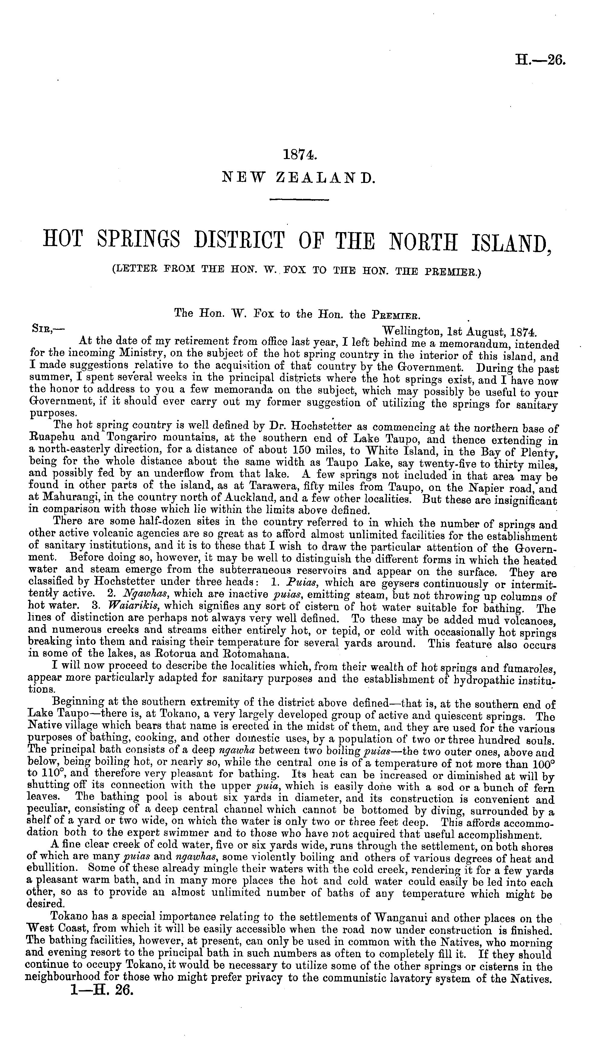 HOT SPRINGS DISTRICT OF THE NORTH ISLAND, (LETTER FROM THE HON. W. FOX TO THE HON. THE PREMIER.)