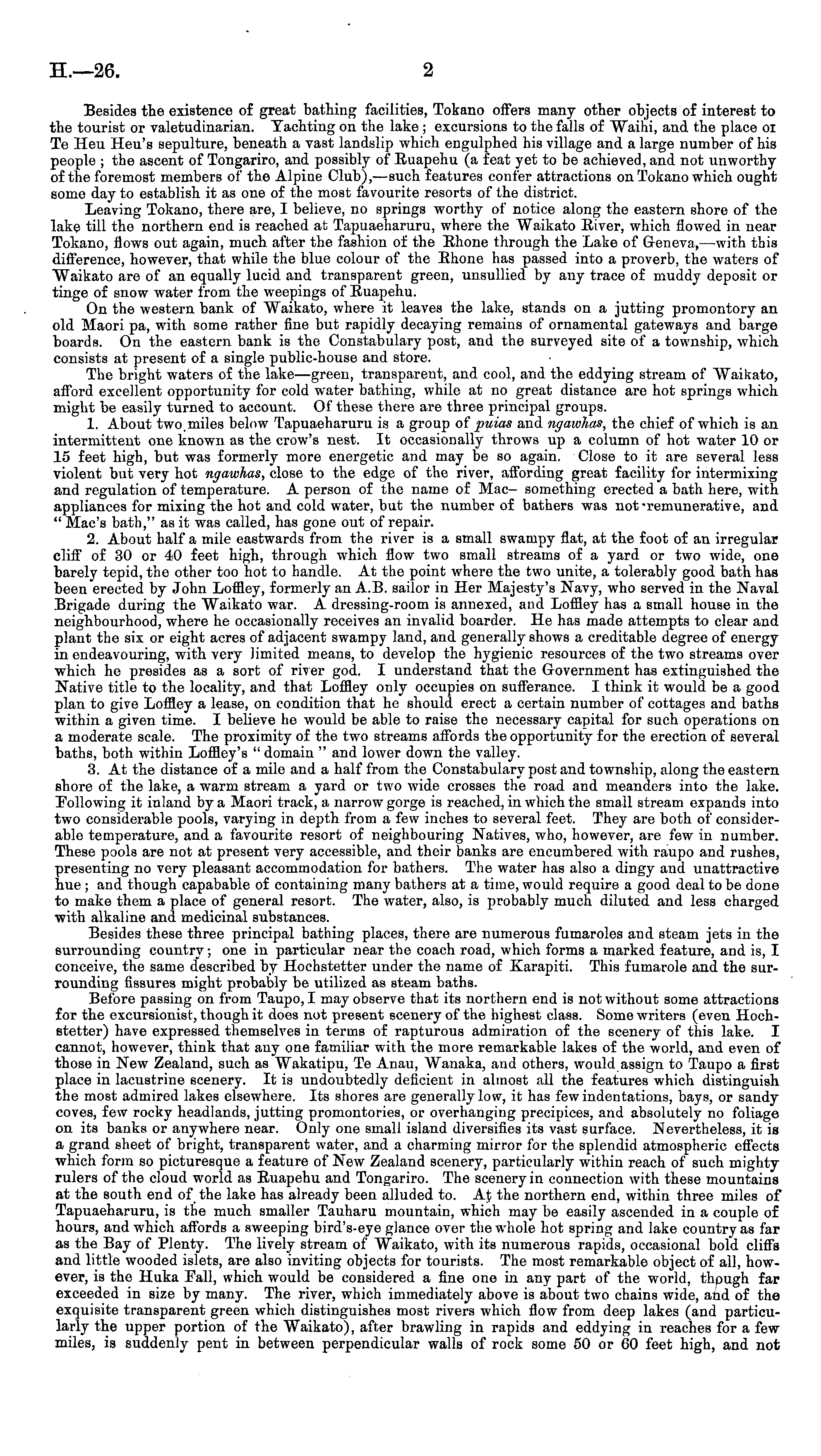Besides the existence of great bathing facilities, Tokano offers many other objects of interest to the tourist or valetudinarian. Yachting on the lake ; excursions to the falls of Waihi, and the place 01 Te Heu Heu's sepulture, beneath a vast landslip which engulphed his village and a large number of his people ; the ascent of Tongariro, and possibly of Ruapehu (a feat yet to be achieved, and not unworthy of the foremost members of the Alpine Club), —such features confer attractions on Tokano which ought somo day to establish it as one of the most favourite resorts of the district. Leaving Tokano, there are, I believe, no springs worthy of notice along the eastern shore of the lake till the northern end is reached at Tapuaeharuru, where the Waikato River, which flowed in near Tokano, flows out again, much after the fashion of the Rhone through the Lake of Geneva, —with thia difference, however, that while the blue colour of the Rhone has passed into a proverb, the waters of Waikato are of an equally lucid and transparent green, unsullied by any trace of muddy deposit or tinge of snow water from the weepings of Ruapehu. On the western bank of Waikato, where it leaves the lake, stands on a jutting promontory an old Maori pa, with some rather fine but rapidly decaying remains of ornamental gateways and barge boards. On the eastern bank is the Constabulary post, and the surveyed site of a township, which consists at present of a single public-house and store. The bright waters of the lake—green, transparent, and cool, and the eddying stream of Waikato, afford excellent opportunity for cold water bathing, while at no great distance are hot springs which might be easily turned to account. Of these there are three principal groups. 1. About two.miles below Tapuaeharuru is a group of puias and ngawhas, the chief of which is an intermittent one known as the crow's nest. It occasionally throws up a column of hot water 10 or 15 feet high, but was formerly more energetic and may be so again. Close to it are several less violent but very hot ngawhas, close to the edge of the river, affording great facility for intermixing and regulation of temperature. A person of the name of Mac- something erected a bath here, with appliances for mixing the hot and cold water, but the number of bathers was not-remunerative, and " Mac's bath," as it was called, has gone out of repair. 2. About half a mile eastwards from the river is a small swampy flat, at the foot of an irregular cliff of 30 or 40 feet high, through which flow two small streams of a yard or two wide, one barely tepid, the other too hot to handle. At the point where the two unite, a tolerably good bath has been "erected by John Loffley, formerly an A.B. sailor in Her Majesty's Navy, who served in the Naval Brigade during the Waikato war. A dressing-room is annexed, and Loffley has a small house in the neighbourhood, where he occasionally receives an invalid boarder. He has made attempts to clear and plant the six or eight acres of adjacent swampy land, and generally shows a creditable degree of energy in endeavouring, with very limited means, to develop the hygienic resources of the two streams over which he presides as a sort of river god. I understand that the Government has extinguished the Native title to the locality, and that Loffley only occupies on sufferance. I think it would be a good plan to give Loffley a lease, on condition that ho should erect a certain number of cottages and baths within a given time. I believe he would be able to raise the necessary capital for such operations on a moderate scale. The proximity of the two streams affords the opportunity for the erection of several baths, botli within Loffley's " domain " and lower down the valley. 3. At the distance of a mile and a half from the Constabulary post and township, along the eastern shore of the lake, a warm stream a yard or two wide crosses the road and meanders into the lake. Following it inland by a Maori track, a narrow gorge is reached, in which the small stream expands into two considerable pools, varying in depth from a few inches to several feet. They are both of considerable temperature, and a favourite resort of neighbouring Natives, who, however, are few in number. These pools are not at present very accessible, and their banks are encumbered with raupo and rushes, presenting no very pleasant accommodation for bathers. The water lias also a dingy and unattractive hue ; and though capabable of containing many bathers at a time, would require a good deal to be done to make them a place of general resort. The water, also, is probably much diluted and less charged with alkaline and medicinal substances. Besides these three principal bathing places, there are numerous fumaroles and steam jets in the surrounding country; one in particular near the coach road, which forms a marked feature, and is, I conceive, the same described by Hochstetter under the name of Karapiti. This fumarole and the surrounding fissures might probably be utilized as steam baths. Before passing on from Taupo, I may observe that its northern end is not without some attractions for the excursionist, though it does not present scenery of the highest class. Some writers (even Hochstetter) have expressed themselves in terms of rapturous admiration of the scenery of this lake. I cannot, however, think that any one familiar with the more remarkable lakes of the world, and even of those in New Zealand, such as Wakatipu, Te Anau, Wanaka, and others, would assign to Taupo a first place in lacustrine scenery. It is undoubtedly deficient in almost all the features which distinguish the most admired lakes elsewhere. Its shores are generally low, it has few indentations, bays, or sandy coves, few rocky headlands, jutting promontories, or overhanging precipices, and absolutely no foliage on its banks or anywhere near. Only one small island diversifies its vast surface. Nevertheless, it ia a grand sheet 