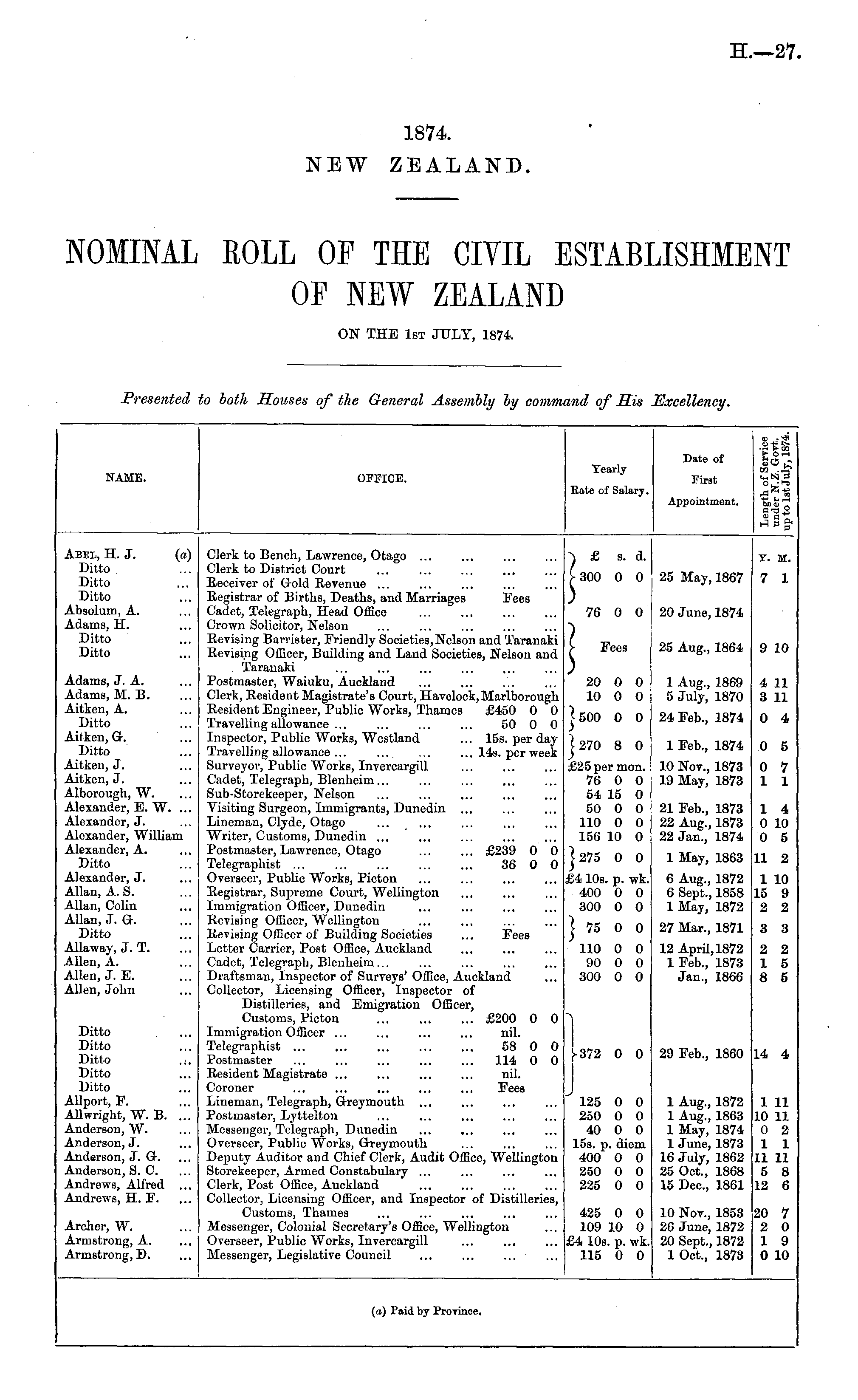 NOMINAL ROLL OF THE CIVIL ESTABLISHMENT OF NEW ZEALAND ON THE 1ST JULY, 1874.