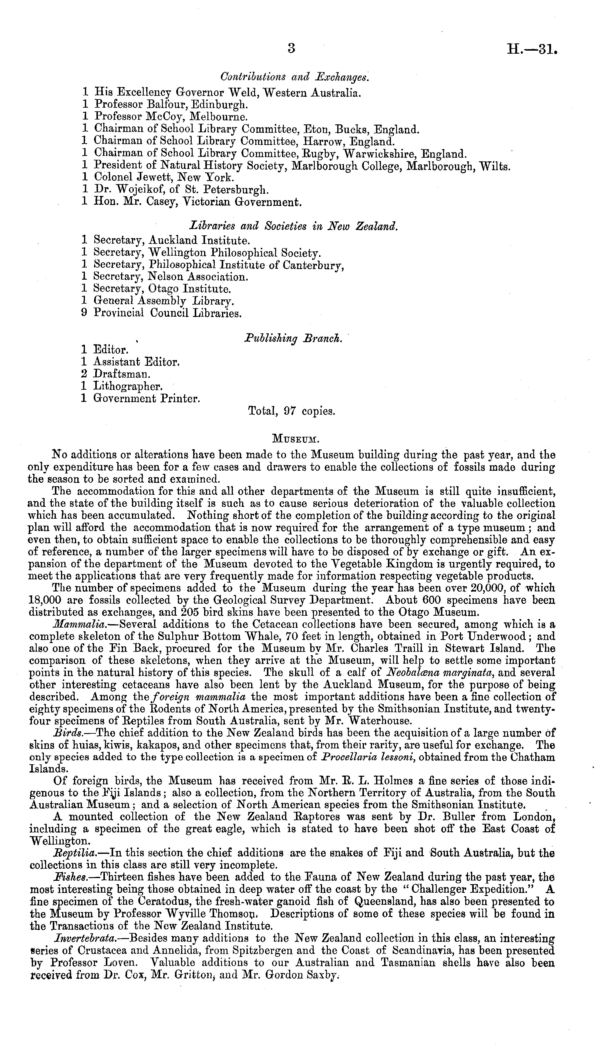 Contributions and Exchanges. 1 His Excellency Governor "Weld, "Western Australia. 1 Professor Balfour, Edinburgh. 1 Professor McCoy, Melbourne. 1 Chairman of School Library Committee, Eton, Bucks, England. 1 Chairman of School Library Committee, Harrow, England. 1 Chairman of School Library Committee, Rugby, "Warwickshire, England. 1 President of Natural History Society, MarJborough College, Marlborough, "Wilts. 1 Colonel Jewett, New York. 1 Dr. Wojeikof, of St. Petersburgh. 1 Hon. Mr. Casey, Victorian Government. Libraries and Societies in New Zealand. 1 Secretary, Auckland Institute. 1 Secretary, "Wellington Philosophical Society. 1 Secretary, Philosophical Institute of Canterbury, 1 Secretary, Nelson Association. 1 Secretary, Otago Institute. 1 General Assembly Library. 9 Provincial Council Libraries. , Publishing Branch. 1 Editor. 1 Assistant Editor, 2 Draftsman. 1 Lithographer. 1 Government Printer. Total, 97 copies. Museum. No additions or alterations have been made to the Museum building during the past year, and the only expenditure has been for a few eases and drawers to enable the collections of fossils made during the season to be sorted and examined. The accommodation for this and all other departments of the Museum is still quite insufficient, and the state of the building itself is such as to cause serious deterioration of the valuable collection which has been accumulated. Nothing short of the completion of the building according to the original plan will afford the accommodation that is now required for the arrangement of a type museum ; and even then, to obtain sufficient space to enable the collections to be thoroughly comprehensible and easy of reference, a number of the larger specimens will have to be disposed of by exchange or gift. An expansion of the department of the Museum devoted to the Vegetable Kingdom is urgently required, to meet the applications that are very frequently made for information respecting vegetable products. The number of specimens added to the Museum during the year has been over 20,000, of which 18,000 are fossils collected by the Geological Survey Department. About 600 specimens have been distributed as exchanges, and 205 bird skins have been presented to the Otago Museum. Mammalia. —Several additions to the Cetacean collections have been secured, among which is a complete skeleton of the Sulphur Bottom Whale, 70 feet in length, obtained in Port Underwood ; and also one of the Kn Back, procured for the Museum by Mr. Charles Traill in Stewart Island. The comparison of these skeletons, when they arrive at the Museum, will help to settle some important points in the natural history of this species. The skull of a calf of Neobalcena marginata, and several other interesting cetaceans have also been lent by the Auckland Museum, for the purpose of being described. Among the foreign mammalia the most important additions have been a fine collection of eighty specimens of the Rodents of North America, presented by the Smithsonian Institute, and twentyfour specimens of Reptiles from South Australia, sent by Mr. Waterhouse. Birds. —The chief addition to the New Zealand birds has been the acquisition of a largo number of skins of huias, kiwis, kakapos, and other specimens that, from their rarity, are useful for exchange. The only species added to the typo collection is a specimen of Procellaria lessoni, obtained from the Chatham Islands. Of foreign birds, the Museum has received from Mr. R. L. Holmes a fine series of those indigenous to the Kji Islands; also a collection, from the Northern Territory of Australia, from the South Australian Museum; and a selection of North American species from the Smithsonian Institute. A mounted collection of the New Zealand Raptores was sent by Dr. Buller from London, including a specimen of the great eagle, which is stated to have been shot off the East Coast of "Wellington. Reptilia. —In this section the chief additions are the snakes of Piji and South Australia, but the collections in this class are still very incomplete. Fishes. —Thirteen fishes have been added to the Fauna of New Zealand during the past year, the most interesting being those obtained in deep water off the coast by the " Challenger Expedition." A fine specimen of the Ceratodus, the fresh-water ganoid fish of Queensland, has also been presented to the Museum by Professor Wyville Thomson. Descriptions of some of these species will be found in the Transactions of the New Zealand Institute. Invertebrata. —Besides many additions to the New Zealand collection in this class, an interesting series of Crustacea and Annelida, from Spitzbergen and the Coast of Scandinavia, has been presented by Professor Loven. Valuable additions to our Australian and Tasmanian shells hayo also been received from Dr. Cox, Mr. Gritton> and Mr. Gordon Saxby;