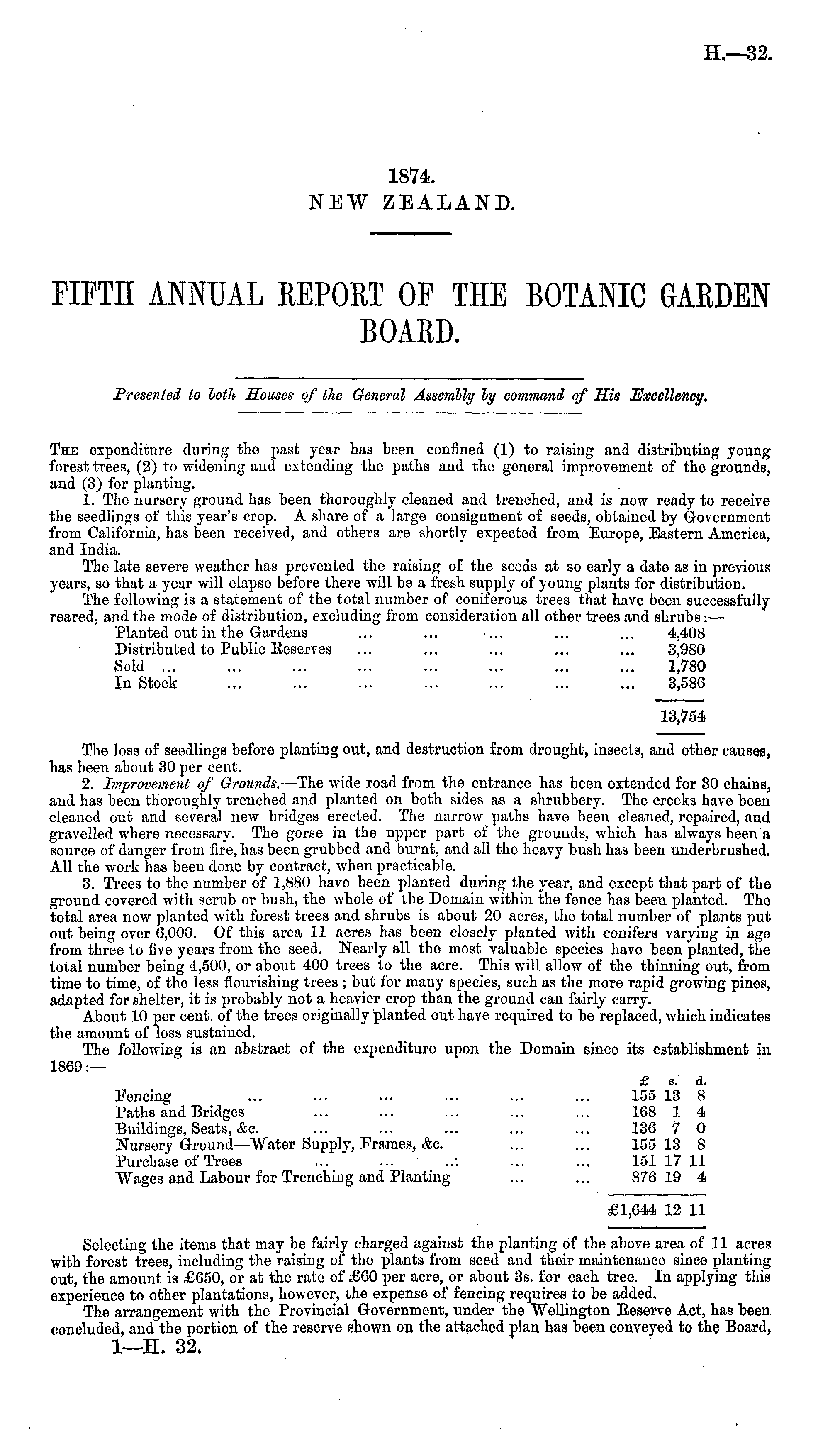The expenditure during the past year has been confined (1) to raising and distributing young forest trees, (2) to widening and extending the paths and the general improvement of the grounds, and (3) for planting. 1. The nursery ground has been thoroughly cleaned and trenched, and is now ready to receive the seedlings of this year's crop. A share of a large consignment of seeds, obtained by Government from California, has been received, and others are shortly expected from Europe, Eastern America, and India. The late severe weather has prevented the raising of the seeds at so early a date as in previous years, so that a year will elapse before there will be a fresh supply of young plants for distribution. The following is a statement of the total number of coniferous trees that have been successfully reared, and the mode of distribution, excluding from consideration all other trees and shrubs: —■ Planted out in the Gardens ... ... ... ... ... 4,408 Distributed to Public Eeserves ... ... ... ... ... 3,980 Sold ... ... ... ... ... ... ... ... 1,780 In Stock ... ... ... ... ... ... ... 3,586 13,754 The loss of seedlings before planting out, and destruction from drought, insects, and other causes, has been about 30 per cent. 2. Improvement of Grounds. —The wide road from the entrance has been extended for 30 chains, and has been thoroughly trenched and planted on both sides as a shrubbery. The creeks have been cleaned out and several new bridges erected. The narrow paths have been cleaned, repaired, and gravelled where necessary. The gorse in the upper part of the grounds, which has always been a source of danger from fire, has been grubbed and burnt, and all the heavy bush has been underbrushed. All the work has been done by contract, when practicable. 3. Trees to the number of 1,880 have been planted during the year, and except that part of the ground covered with scrub or bush, the whole of the Domain within the fence has been planted. The total area now planted with forest trees and shrubs is about 20 acres, the total number of plants put out being over 0,000. Of this area 11 acres has been closely planted with conifers varying in age from three to five years from the seed. Nearly all the most valuable species have been planted, the total number being 4,500, or about 400 trees to the acre. This will allow of the thinning out, from time to time, of the less nourishing trees ; but for many species, such as the more rapid growing pines, adapted for shelter, it is probably not a heavier crop than the ground can fairly carry. About 10 per cent, of the trees originally planted out have required to be replaced, which indicates the amount of loss sustained. The following is an abstract of the expenditure upon the Domain since its establishment in 1869 :— £ a. a. Fencing ... ... ... ... ... ... 155 13 8 Paths and Bridges ... ... ... ... ... 168 1 4 Buildings, Seats, &c. ... ... ... ... ... 136 7 0 Nursery Ground —Water Supply, Frames, &c. ... ... 155 13 8 Purchase of Trees ... ' ... • ..-. ... ... 15117 11 "Wages and Labour for Trenching and Planting ... ... 876 19 4 £1,644 12 11 Selecting the items that may be fairly charged against the planting of the above area of 11 acres with forest trees, including the raising of the plants from seed and their maintenance since planting out, the amount is £650, or at the rate of £60 per acre, or about 3s. for each tree. In applying this experience to other plantations, however, the expense of fencing requires to be added. The arrangement with the Provincial Government, under the Wellington Eeserve Act, has been concluded, and the portion of the reserve shown on the attached plan has been conveyed to the Board, I—H. 32.
