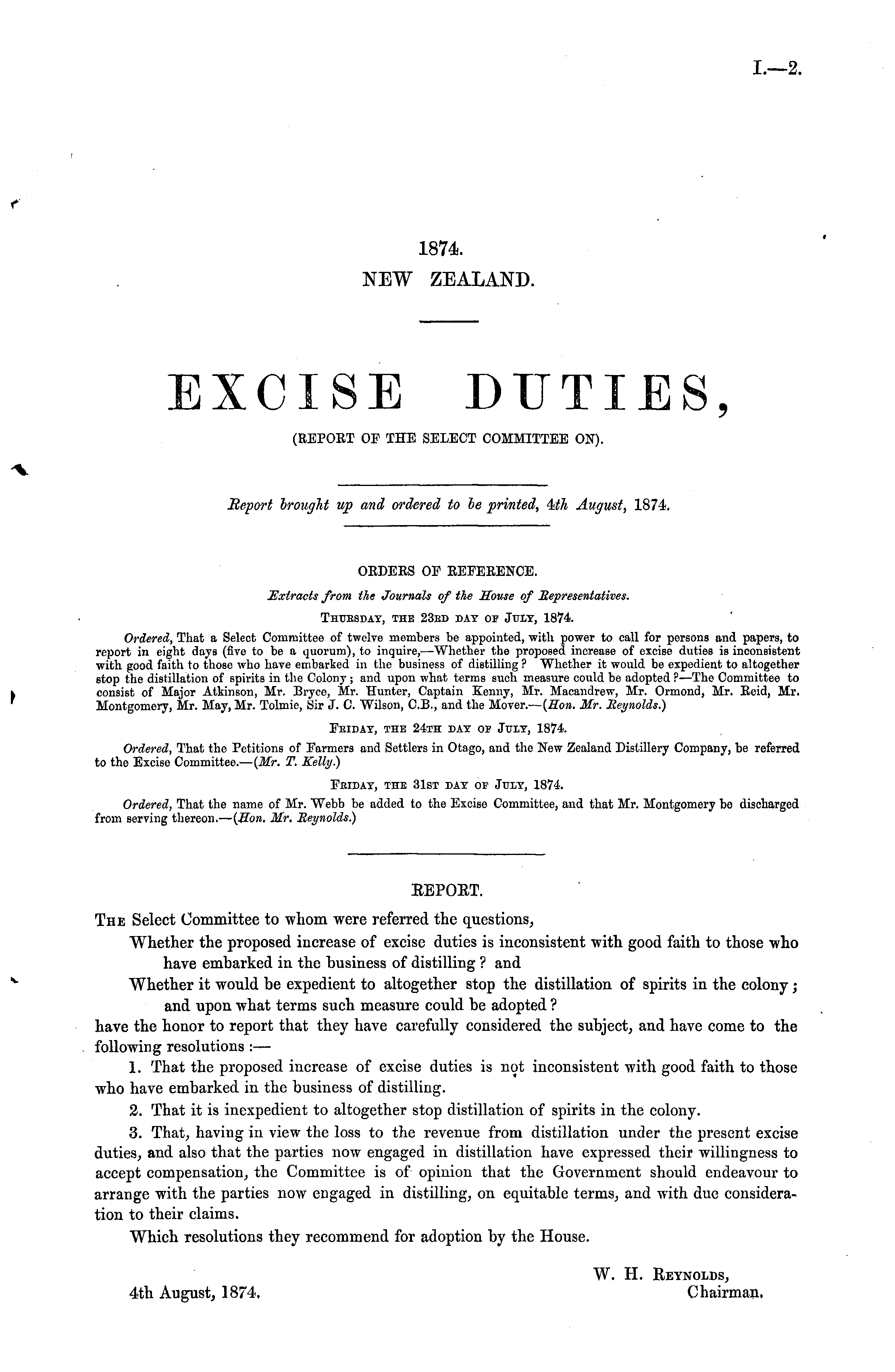 ORDERS OP REPERENCE. Extracts from the Journals of the House of Representatives. ThUBSDAY, THE 23ED DAT OF JULY, 1874. Ordered, That a Select Committee of twelve members bo appointed, with power to call for persons and papers, to report in eight days (five to be a quorum), to inquire,—Whether the proposed increase of excise duties is inconsistent with good faith to those who have embarked in the business of distilling ? Whether it would be expedient to altogether stop the distillation of spirits in the Colony ; and upon what terms such measure could be adopted ?—The Committee to consist of Major Atkinson, Mr. Bryce, Mr. Hunter, Captain Kenny, Mr. Macandrew, Mr. Ormond, Mr. Reid, Mr. Montgomery, Mr. May, Mr. Tolmic, Sir J. C. Wilson, CIS., and the Mover. — (Son. Mr. Reynolds.) Fbipay, the 24th DAT of July, 1874. Ordered, That the Petitions of Parmers and Settlers in Otago, and the New Zealand Distillery Company, be referred to the Excise Committee. — (Mr. T. Kelly.) Peiday, the 31st day op July, 1874. Ordered, That the name of Mr. Webb be added to the Excise Committee, and that Mr. Montgomery be discharged from serving thereon.— (Hon. Mr. Reynolds.)