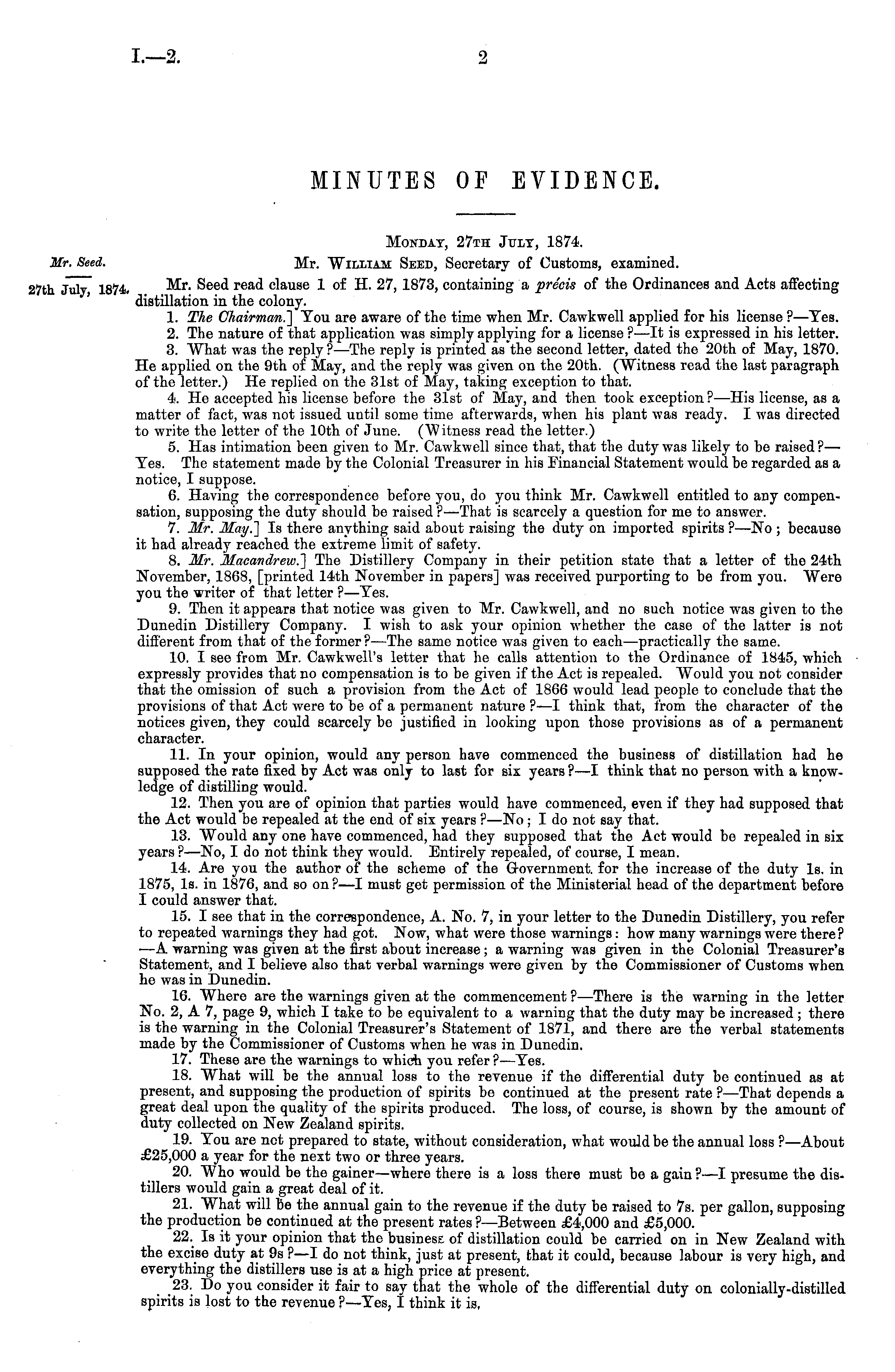 MINUTES OF EVIDENCE. Monday, 27th July, 1874. Mr. William Seed, Secretary of Customs, examined. Mr. Seed read clause 1 of H. 27, 1873, containing a precis of the Ordinances and Acts affecting distillation in the colony. 1. The Chairman.'] You are aware of the time when Mr. Cawkwell applied for his license ?—Tes. 2. The nature of that application was simply applying for a license ?—lt is expressed in his letter. 3. "What was the reply ? —The reply is printed as the second letter, dated the 20th of May, 1870. He applied on the 9th of May, and the reply was given on the 20th. (Witness read the last paragraph of the letter.) He replied on the 31st of May, taking exception to that. 4. He accepted his license before the 31st of May, and then took exception ? —His license, as a matter of fact, was not issued uutil some time afterwards, when his plant was ready. I was directed to write the letter of the 10th of June. (Witness read the letter.) 5. Has intimation been given to Mr. Cawkwell since that, that the duty was likely to bo raised ?— Tes. The statement made by the Colonial Treasurer in his Financial Statement would be regarded as a notice, I suppose. 6. Having the correspondence before you, do you think Mr. Cawkwell entitled to any compensation, supposing the duty should be raised ?—That is scarcely a question for me to answer. 7. Mr. May.~\ Is there anything said about raising the duty on imported spirits ? —No ; because it had already reached the extreme limit of safety. 8. Mr. MacandrewJ] The Distillery Company in their petition state that a letter of the 24th November, 18G8, [printed 14th November in papers] was received purporting to be from you. Were you the writer of that letter ?—Tes. 9. Then it appears that notice was given to Mr. Cawkwell, and no such notice was given to the Dunedin Distillery Company. I wish to ask your opinion whether the case of the latter is not different from that of the former ? —The same notice was given to each —practically the same. 10. I see from Mr. Cawkwell's letter that he calls attention to the Ordinance of 1845, which expressly provides that no compensation is to bo given if the Act is repealed. Would you not consider that the omission of such a provision from the Act of 1866 would lead people to conclude that the provisions of that Act were to be of a permanent nature ?—I think that, from the character of the notices given, they could scarcely be justified in looking upon those provisions as of a permanent character. 11. In your opinion, would any person have commenced the business of distillation had he supposed the rate fixed by Act was only to last for six years ?—I think that no person with a knowledge of distilling would. 12. Then you are of opinion that parties would have commenced, even if they had supposed that the Act would be repealed at the end of six years ? —No; I do not say that. 13. Would any one have commenced, had they supposed that the Act would be repealed in six years? —No, Ido not think they would. Entirely repealed, of course, I mean. 14. Are you the author of the scheme of the Government, for the increase of the duty Is. in 1875, Is. in 1876, and so on?—I must get permission of the Ministerial head of the department before I could answer that. 15. I see that in the correspondence, A. No. 7, in your letter to the Dunedin Distillery, you refer to repeated warnings they had got. Now, what were those warnings : how many warnings were there? —A warning was given at the first about increase; a warning was given in the Colonial Treasurer's Statement, and I believe also that verbal warnings were given by the Commissioner of Customs when he was in Dunedin. 16. Where are the warnings given at the commencement ? —There is the warning in the letter No. 2, A 7, page 9, which I take to be equivalent to a warning that the duty may be increased ; there is the warning in the Colonial Treasurer's Statement of 1871, and there are the verbal statements made by the Commissioner of Customs when he was in Dunedin. 17. These are the warnings to which you refer ? —Tes. 18. What will be the annual loss to the revenue if the differential duty be continued as at present, and supposing the production of spirits be continued at the present rate ? —That depends a great deal upon the quality of the spirits produced. The loss, of course, is shown by the amount of duty collected on New Zealand spirits. 19. Tou are not prepared to state, without consideration, what would be the annual loss ?—About £25,000 a year for the next two or three years. 20. Who would be the gainer—where there is a loss there must be a gain ?—I presume the distillers would gain a great deal of it. 21. What will be the annual gain to the revenue if the duty be raised to 7s. per gallon, supposing the production be continued at the present rates ?—Between £4,000 and £5,000. 22. Is it your opinion that the business of distillation could be carried on in New Zealand with the excise duty at 9s ?—I do not think, just at present, that it could, because labour is very high, and everything the distillers use is at a high price at present. 23. Do you consider it fair to say that the whole of the differential duty on colonially-distilled spirits is lost to the revenue ?—Yes, I think it is.