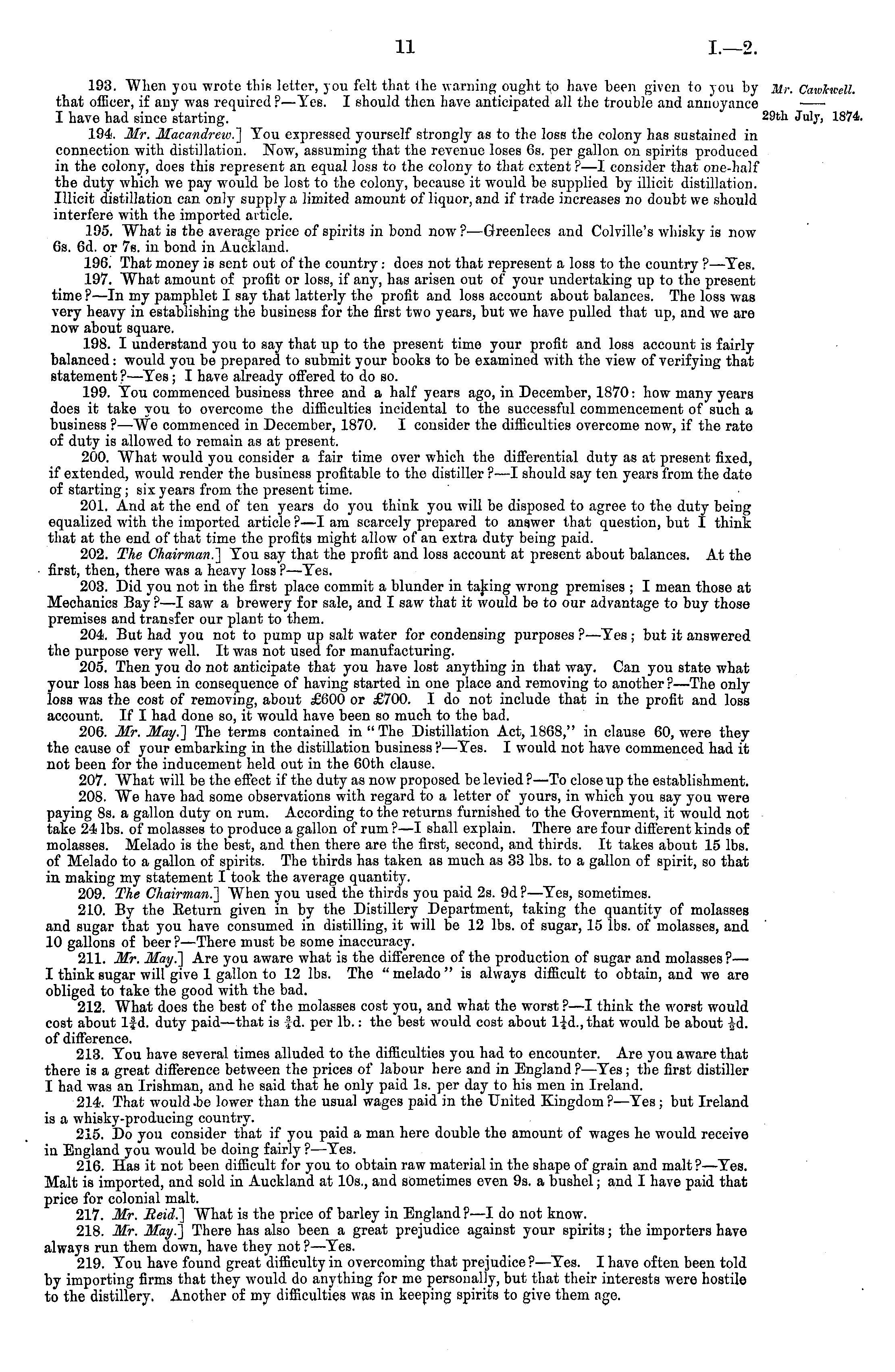 193. When you wrote this letter, you felt that the warning ought to have been given to you by that officer, if any was required ?—Yes. I should then have anticipated all the trouble and annoyance I have had since starting. 194. Mr. Macandrew.~\ You expressed yourself strongly as to the loss the colony has sustained in connection with distillation. Now, assuming that the revenue loses Gs. per gallon on spirits produced in the colony, does this represent an equal loss to the colony to that extent ?—I consider that one-half the duty which we pay would bo lost to the colony, because it would be supplied by illicit distillation. Illicit distillation can only supply a limited amount of liquor, and if trade increases no doubt we should interfere with the imported article. 195. What is the average price of spirits in bond now ?—Greenlees and Colyille's whisky is now 6s. 6d. or 7s. in bond in Auckland. 19G. That money is sent out of the country : does not that represent a loss to the country ?—Yes. 197. What amount of profit or loss, if any, has arisen out of your undertaking up to the present time ?—ln my pamphlet I say that latterly the profit and loss account about balances. The loss was very heavy in establishing the business for the first two years, but we have pulled that up, and we are now about square. 198. I understand you to say that up to the present time your profit and loss account is fairly balanced: would you be prepared to submit your books to be examined with the view of verifying that statement ?—Yes; I have already offered to do so. 199. You commenced business three and a half years ago, in December, 1870: how many years docs it take you to overcome the difficulties incidental to the successful commencement of such a business ? —We commenced in December, 1870. I consider the difficulties overcome now, if the rate of duty is allowed to remain as at present. 200. What would you consider a fair time over which the differential duty as at present fixed, if extended, would render the business profitable to the distiller ?—I should say ten years from the date of starting; six years from the present time. 201. And at the end of ten years do you think you will be disposed to agree to the duty being equalized with the imported article ?—I am scarcely prepared to answer that question, but I think that at the end of that time the profits might allow of an extra duty being paid. 202. The Chairman.'] You say that the profit and loss account at present about balances. At the first, then, there was a heavy loss ?—Yes. 203. Did you not in the first place commit a blunder in taking wrong premises ; I mean those at Mechanics Bay ?—I saw a brewery for sale, and I saw that it would be to our advantage to buy those premises and transfer our plant to them. 204. But had you not to pump up salt water for condensing purposes ?—Yes ; but it answered the purpose very well. It was not used for manufacturing. 205. Then you do not anticipate that you have lost anything in that way. Can you state what your loss has been in consequence of having started in one place and removing to another ?—The only loss was the cost of removing, about £600 or £700. I do not include that in the profit and loss account. If I had done so, it would have been so much to the bad. 200. Mr. Mai/.] The terms contained in " The Distillation Act, 1868," in clause 60, were they the cause of your embarking in the distillation business P —Yes. I would not have commenced had it not been for the inducement held out in the 60th clause. 207. What will be the effect if the duty as now proposed be levied ?—To close up the establishment. 208. We have had some observations with regard to a letter of yours, in which you say you were paying Bs. a gallon duty on rum. According to the returns furnished to the Government, it would not take 24 lbs. of molasses to produce a gallon of rum ?—I shall explain. There are four different kinds of molasses. Melado is the best, and then there are the first, second, and thirds. It takes about 15 lbs. of Melado to a gallon of spirits. The thirds has taken as much as 33 lbs. to a gallon of spirit, so that in making my statement I took the average quantity. 209. The Chairman.] When you used the thirds you paid 2s. 9d ?—Yes, sometimes. 210. By the Return given in by the Distillery Department, taking the quantity of molasses and sugar that you have consumed in distilling, it will be 12 lbs. of sugar, 15 lbs. of molasses, and 10 gallons of beer? —There must be some inaccuracy. 211. Mr. May.] Are you aware what is the difference of the production of sugar and molasses ?— I think sugar will give 1 gallon to 12 lbs. The "melado" is always difficult to obtain, and we are obliged to take the good with the bad. 212. What does the best of the molasses cost you, and what the worst ?—I think the worst would cost about lfd. duty paid —that is fd. per lb.: the best would cost about l-fd.,that would be about £d. of difference. 213. You have several times alluded to the difficulties you had to encounter. Are you aware that there is a great difference between the prices of labour here and in England ? —Yes ; the first distiller I had was an Irishman, and he said that he only paid Is. per day to his men in Ireland. 214. That would -be lower than the usual wages paid in the United Kingdom ? —Yes ; but Ireland is a whisky-producing country. 215. Do you consider that if you paid a man here double the amount of wages he would receive in England you would be doing fairly ? —Yes. 216. Has it not been difficult for you to obtain raw material in the shape of grain and malt ?—Yes. Malt is imported, and sold in Auckland at 10s., and sometimes even 9s. a bushel; and I have paid that price for colonial malt. 217. Mr. Reid.] What is the price of barley in England ?—I do not know. 218. Mr. May.] There has also been a great prejudice against your spirits; the importers have always run them dow