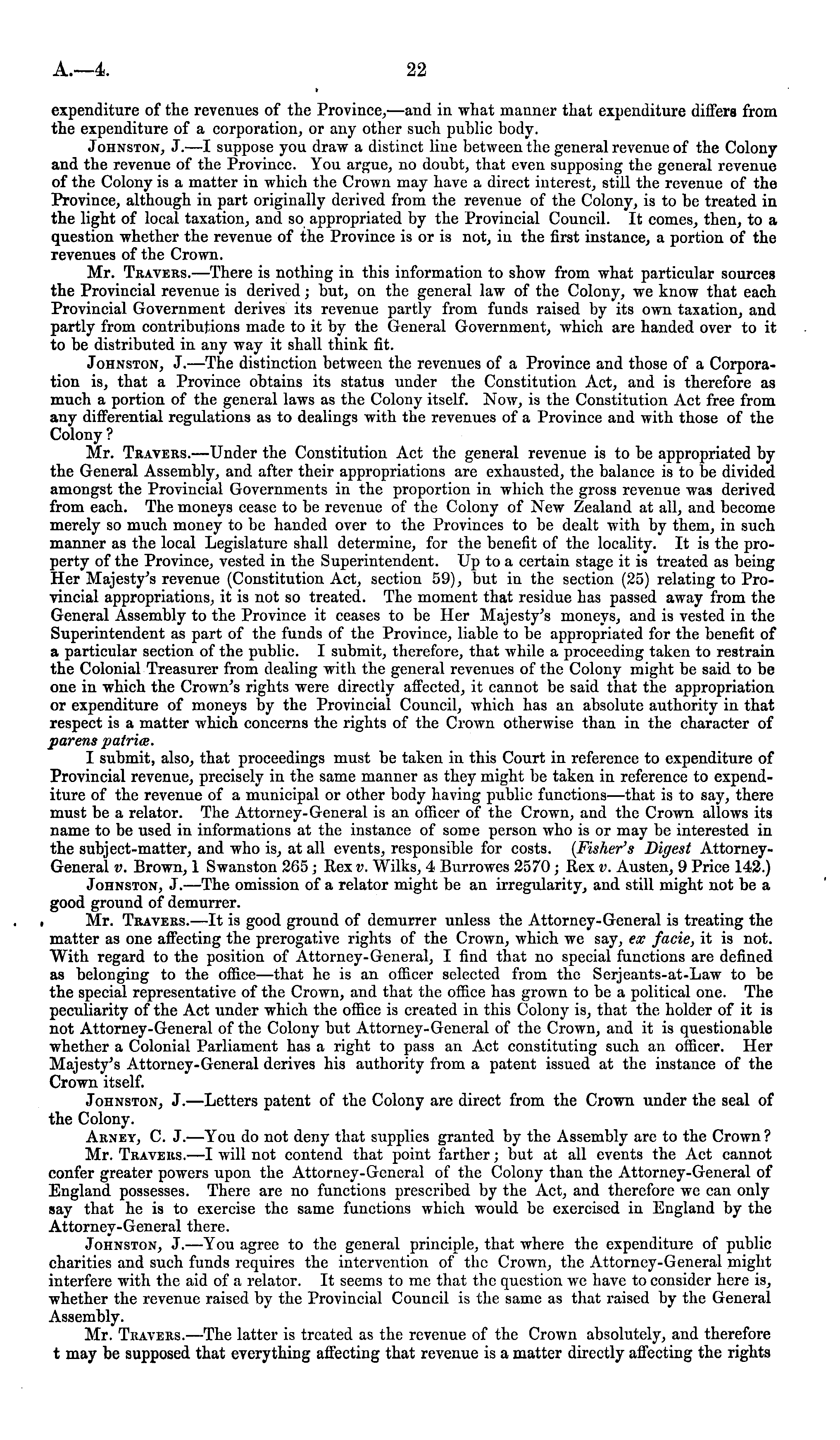 expenditure of the revenues of the Province, —and in what manner that expenditure differs from the expenditure of a corporation, or any other such public body. Johnston, J.—l suppose you draw a distinct line between the general revenue of the Colony and the revenue of the Province. You argue, no doubt, that even supposing the general revenue of the Colony is a matter in which the Crown may have a direct interest, still the revenue of the Province, although in part originally derived from the revenue of the Colony, is to be treated in the light of local taxation, and so appropriated by the Provincial Council. It comes, then, to a question whether the revenue of the Province is or is not, in the first instance, a portion of the revenues of the Crown. Mr. Travers. —There is nothing in this information to show from what particular sources the Provincial revenue is derived; but, on the general law of the Colony, we know that each Provincial Government derives its revenue partly from funds raised by its own taxation, and partly from contributions made to it by the General Government, which are handed over to it to be distributed in any way it shall think fit. Johnston, J.—The distinction between the revenues of a Province and those of a Corporation is, that a Province obtains its status under the Constitution Act, and is therefore as much a portion of the general laws as the Colony itself. Now, is the Constitution Act free from any differential regulations as to dealings with the revenues of a Province and with those of the Colony ? Mr. Travers.—Under the Constitution Act the general revenue is to be appropriated by the General Assembly, and after their appropriations are exhausted, the balance is to be divided amongst the Provincial Governments in the proportion in which the gross revenue was derived from each. The moneys cease to be revenue of the Colony of New Zealand at all, and become merely so much money to be handed over to the Provinces to be dealt with by them, in such manner as the local Legislature shall determine, for the benefit of the locality. It is the property of the Province, vested in the Superintendent. Up to a certain stage it is treated as being Her Majesty's revenue (Constitution Act, section 59), but in the section (25) relating to Provincial appropriations, it is not so treated. The moment that residue has passed away from the General Assembly to the Province it ceases to be Her Majesty's moneys, and is vested in the Superintendent as part of the funds of the Province, liable to be appropriated for the benefit of a particular section of the public. I submit, therefore, that while a proceeding taken to restrain the Colonial Treasurer from dealing with the general revenues of the Colony might be said to be one in which the Crown's rights were directly affected, it cannot be said that the appropriation or expenditure of moneys by the Provincial Council, which has an absolute authority in that respect is a matter which concerns the rights of the Crown otherwise than in the character of parens patrice. I submit, also, that proceedings must be taken in this Court in reference to expenditure of Provincial revenue, precisely in the same manner as they might be taken in reference to expenditure of the revenue of a municipal or other body having public functions—that is to say, there must be a relator. The Attorney-General is an officer of the Crown, and the Crown allows its name to be used in informations at the instance of some person who is or may be interested in the subject-matter, and who is, at all events, responsible for costs. (Fisher's Digest AttorneyGeneral v. Brown, 1 Swanston 265 ; Rex v. Wilks, 4 Burrowes 2570; Rex v. Austen, 9 Price 142.) Johnston, J. —The omission of a relator might be an irregularity, and still might not be a good ground of demurrer. Mr. Travers.—lt is good ground of demurrer unless the Attorney-General is treating the matter as one affecting the prerogative rights of the Crown, which we say, ex facie, it is not. With regard to the position of Attorney-General, I find that no special functions are defined as belonging to the office—that he is an officer selected from the Serjeants-at-Law to be the special representative of the Crown, and that the office has grown to be a political one. The peculiarity of the Act under which the office is created in this Colony is, that the holder of it is not Attorney-General of the Colony but Attorney-General of the Crown, and it is questionable whether a Colonial Parliament has a right to pass an Act constituting such an officer. Her Majesty's Attorney-General derives his authority from a patent issued at the instance of the Crown itself. Johnston, J.—Letters patent of the Colony are direct from the Crown under the seal of the Colony. Arney, C. J.—You do not deny that supplies granted by the Assembly are to the Crown? Mr. Travers. —I will not contend that point farther; but at all events the Act cannot confer greater powers upon the Attorney-General of the Colony than the Attorney-General of England possesses. There are no functions prescribed by the Act, and therefore we can only say that he is to exercise the same functions which would be exercised in England by the Attorney-General there. Johnston, J.—You agree to the general principle, that where the expenditure of public charities and such funds requires the intervention of the Crown, the Attorney-General might interfere with the aid of a relator. It seems to me that the question we have to consider here is, whether the revenue raised by the Provincial Council is the same as that raised by the General Assembly. Mr. Travers.—The latter is treated as the revenue of the Crown absolutely, and therefore t may be supposed that everything affecting that revenue is a matter directly affecting the rights