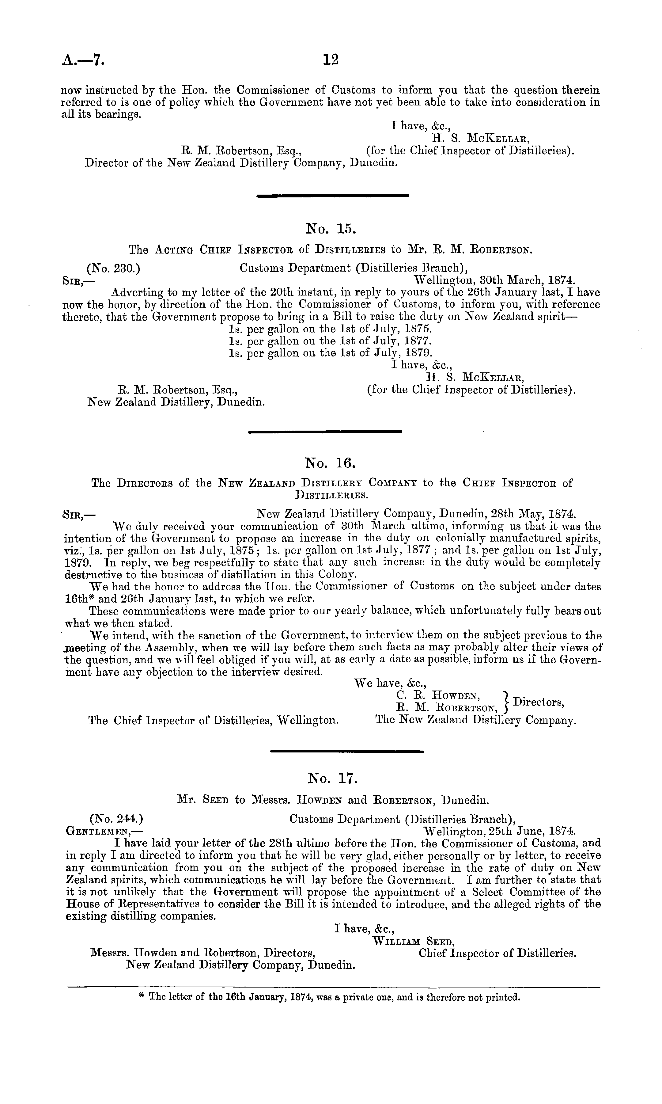 No. 15. The Acting Chief Inspectob of Distilleries to Mr. E. M. Eobeetson. (No. 230.) Customs Department (Distilleries Branch), Sib— Wellington, 30th March, 1874. Adverting to my letter of the 20th instant, in reply to yours of the 26th January last, I have now the honor, by direction of the Hon. the Commissioner of Customs, to inform you, with reference thereto, that the Government propose to bring in a Bill to raise the duty on New Zealand spiritIs, per gallon on the Ist of July, 1875. Is. per gallon on the Ist of July, 1877. Is. per gallon on the Ist of July, 1879. I have, &c, H. 8. McKellae, E. M. Eobertson, Esq., (for the Chief Inspector of Distilleries). New Zealand Distillery, Dunedin.