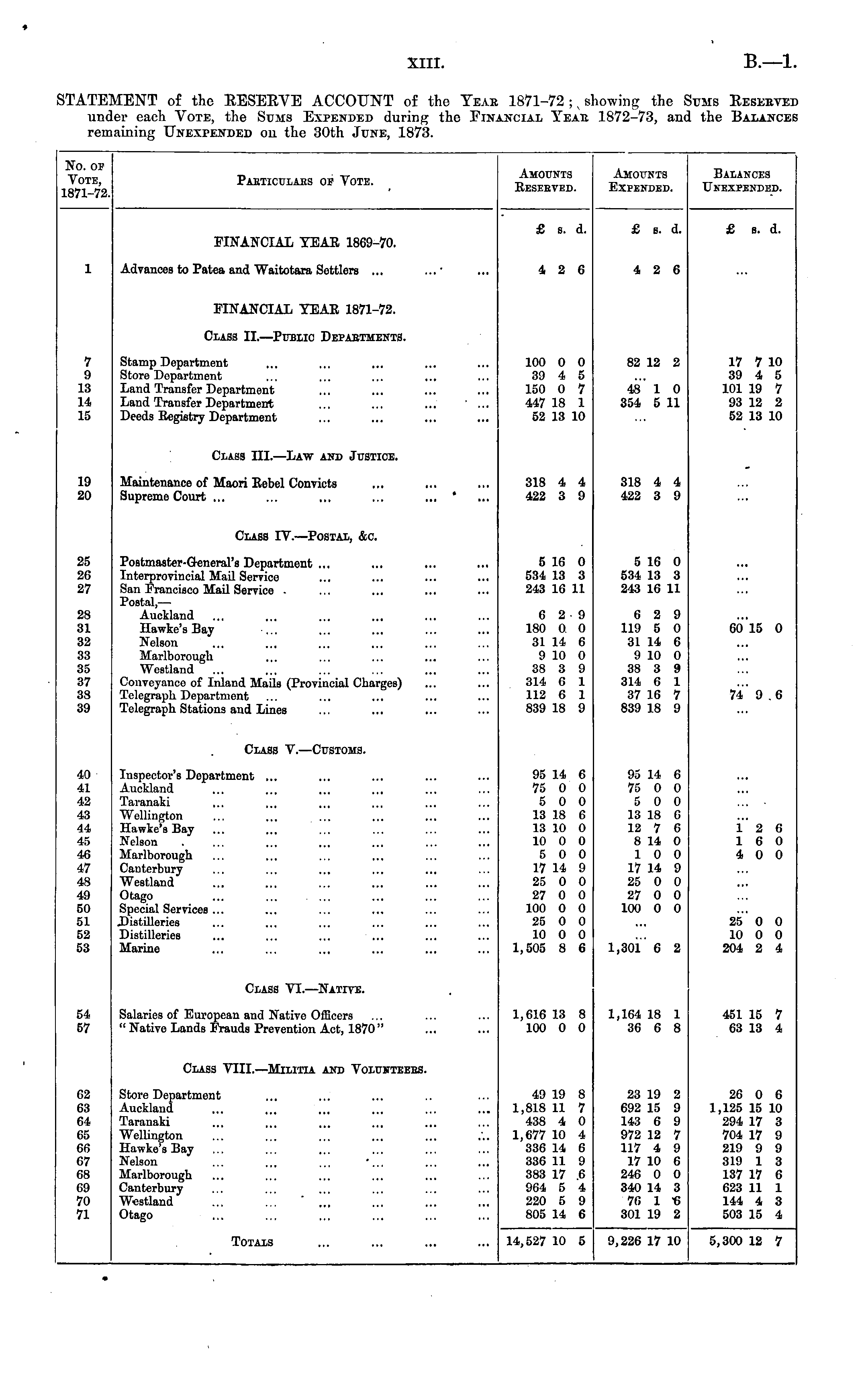 STATEMENT of the RESERVE ACCOUNT of the YEAR. 1871-72; showing the SUMS RESERVED under each VOTE, the SUMS EXPENDED during the FINANCIAL YEAR 1872-73, and the BALANCES remaining UNEXPENDED on the 30th JUNE, 1873.