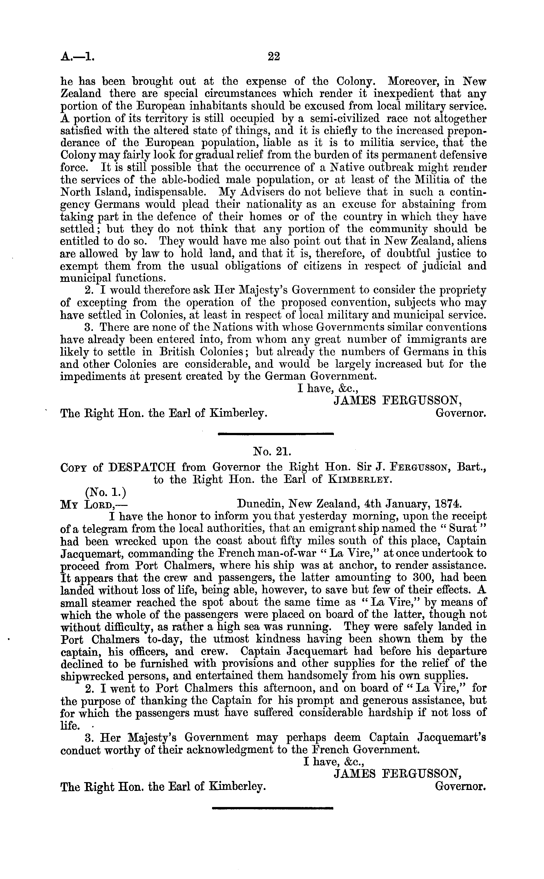 No. 21. Copt of DESPATCH from Governor the Right Hon. Sir J. Eergttsson, Bart., to the Right Hon. the Earl of Kimberley. (No. 1.) My Lord, — Dunedin, New Zealand, 4th January, 1874. I have the honor to inform you that yesterday morning, upon the receipt of a telegram from the local authorities, that an emigrant ship named the " Surat " had been wrecked upon the coast about fifty miles south of this place, Captain Jacquemart, commanding the Erench man-of-war "La Vire," at once undertook to proceed from Port Chalmers, where his ship was at anchor, to render assistance. It appears that the crew and passengers, the latter amounting to 300, had been landed without loss of life, being able, however, to save but few of their effects. A small steamer reached the spot about the same time as "La Vire," by means of which the whole of the passengers were placed on board of the latter, though not without difficulty, as rather a high sea was running. They were safely landed in Port Chalmers to-day, the utmost kindness having been shown them by the captain, his officers, and crew. Captain Jacquemart had before his departure declined to be furnished with provisions and other supplies for the relief of the shipwrecked persons, and entertained them handsomely from his own supplies. 2. I went to Port Chalmers this afternoon, and on board of "La Vire," for the purpose of thanking the Captain for his prompt and generous assistance, but for which the passengers must have suffered considerable hardship if not loss of life. ■ 3. Her Majesty's Government may perhaps deem Captain Jacquemart's conduct worthy of their acknowledgment to the Erench Government. I have, &c, JAMES EERGUSSON, The Right Hon. the Earl of Kimberley. Governor.