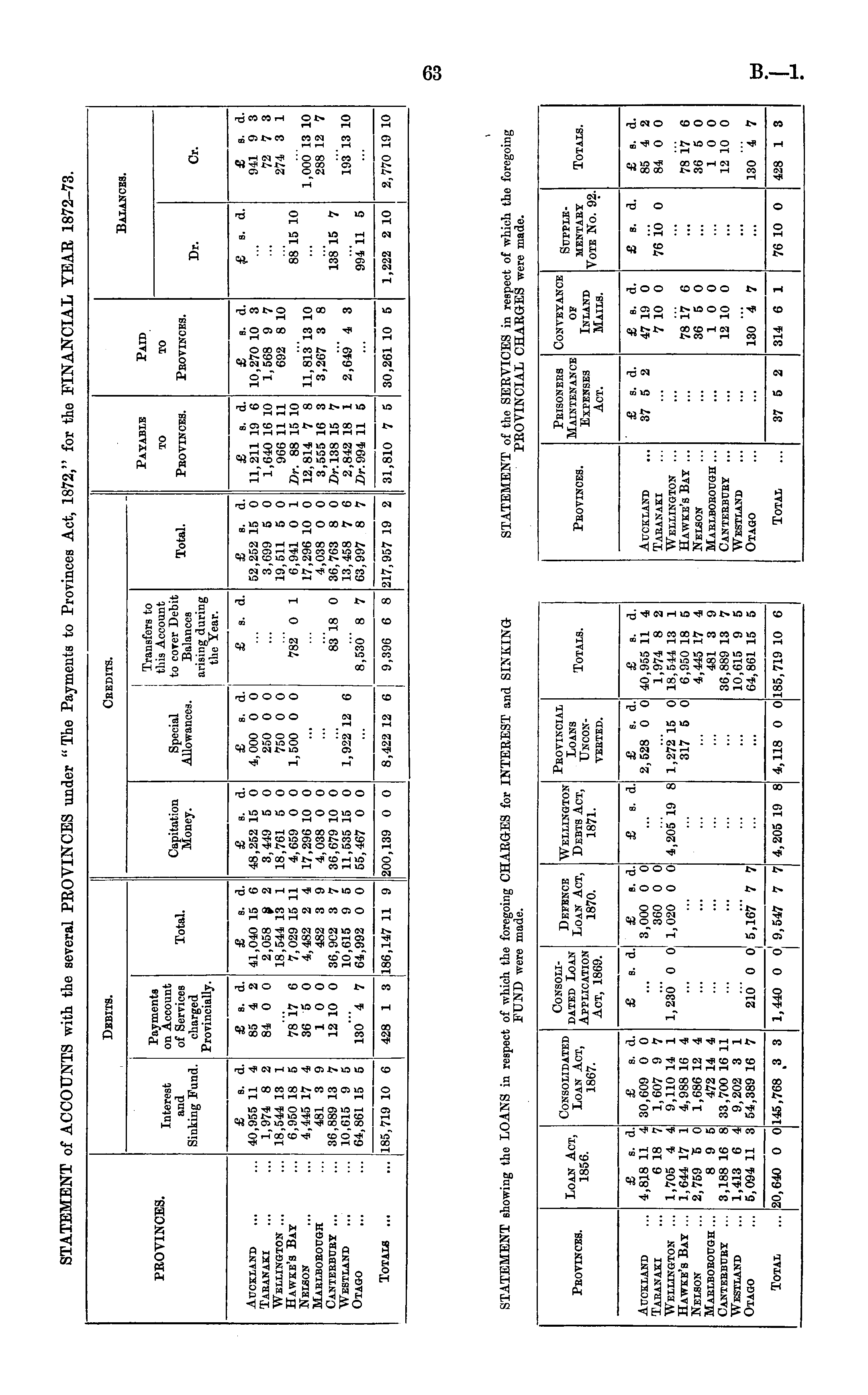 Debits. Credits. BALANCE3. Payable Paid PROVINCES. Interest and Sinking Fund. Payments on Account of Services charged Provincially. Total. Capitation Money. Special Allowances. Transfers to this Account to corer Debit Balances arising during the Year. Total. to Provinces. TO Peotinces. Dr. Or. Auckland Taeanaki Wellington ... Hawke's Bay Nelson Maelboeough Canteebuey ... Westland Otago £ s. d. 40,955 11 4 1,974 8 2 18,544 13 1 6,950 18 5 4,445 17 4 481 3 9 36,889 13 7 10,615 9 5 64,861 15 5 £ s. d. 85 4 2 84 0 0 £ s. d. 41,040 15 6 2,058 § 2 18,544 13 1 7,029 15 11 4,482 2 4 482 3 9 36,902 3 7 10,615 9 5 64,992 0 0 £ s. d. 48,252 15 0 3,449 5 0 18,761 5 0 4,659 0 0 17,296 10 0 4,038 0 0 36,679 10 0 11,535 15 0 55,467 0 0 £ s. d. 4,000 0 0 250 0 0 750 0 0 1,500 0 0 £ s. d. £ 8. d. 52,252 15 0 3,699 5 0 19,511 5 0 6,941 0 1 17,296 10 0 4,038 0 0 36,763 8 0 13,458 7 6 63,997 8 7 217,957 19 2 £ s. d. 11,211 19 6 1,640 16 10 966 11 11 Dr. 88 15 10 12,814 7 8 3,555 16 3 Dr. 138 15 7 2,842 18 1 Dr. 994 11 5 £ s. d. 10,270 10 3 1,568 9 7 692 8 10 £ s. d. £ a. d. 941 9 3 72 7 3 274 3 1 78 17 6 36 5 0 10 0 12 10 0 782 0 1 11,813 13 10 3,267 3 8 88 15 10 1,000 13 10 288 12 7 8318 0 138 15 7 193 13 10 130 "4 7 1,92212 6 8,53o" 8 7 2,649" 4 3 994 11 5 Totals ... 185,719 10 6 31,810 7 5 30,261 10 5 1,222 2 10 2,770 19 10 428 1 3 1186,147 11 9 200,139 0 0 8,422 12 6 9,396 6 8 1 STATEMENT showing the LOANS in respect of which the foregoing CHARGES for INTEREST and SINKINGFUND were made. STATEMENT of the SERVICES in respect of which the foregoing PROVINCIAL CHARGES were made. Provinces. Loan Act, 1856. Consolidated Loan Act, 1867. Consolidated Loan Application Act, 1869. Defence Loan Act, 1870. Wellington Debts Act, 1871. Pbovincial Loans TJnconVEBTED. Totals. Provinces. Prisoners Maintenance Expenses Act. Conveyance OB Inland Mails. Supplementary Vote No. 92. Totals. Auckland Taeanaki Wellington ... Hawke's Bay ... Nelson Marlborough ... Canteebuey ... Westland Otago £ s. d. 4,818 11 4 6 18 7 1,705 4 4 1,644 17 1 2,759 '5 0 8 9 5 3,188 16 8 1,413 6 4 5,094 11 3 £ s. d. 30,609 0 0 1,607 9 7 9,110 14 1 4,988 16 4 1,686 12 4 472 14 4 33,700 16 11 9,202 3 1 54,389 16 7 £ s. d. l,23o" 0 0 £ s. d. 3,000 0 0 360 0 0 1,020 0 0 £ s. d. 4,205 19 8 £ s. d. 2,528 0 0 1,272 15 0 317 5 0 £ s. d. 40,955 11 4 1,974 8 2 18,514 13 1 6,950 18 5 4,445 17 4 481 3 9 36,889 13 7 10,615 9 5 64,861 15 5 Auckland Taeanaki Wellington ... Hawke's Bat ... Nelson Maelbobough ... cantebbcey Westland Otago £ s. d. 37 5 2 £ s. d. 47 19 0 7 10 0 78 17 C 36 5 0 10 0 12 10 0 £ s. d. 76 10 0 £ b. d. 85 4 2 84 0 0 78 17 6 36 5 0 10 0 12 10 0 ... ... ... 210 0 0 ' 5,167" 7 7 ! 9,547 7 7 ... 130 4 7 130 4 7 ... ... Total 1 1,440 0 0' 185,719 10 6 Total !0,640 0 0 [145,768 .3 3 4,205 19 8 4,118 0 0 37 5 2 314 6 1 76 10 0 428 1 3
