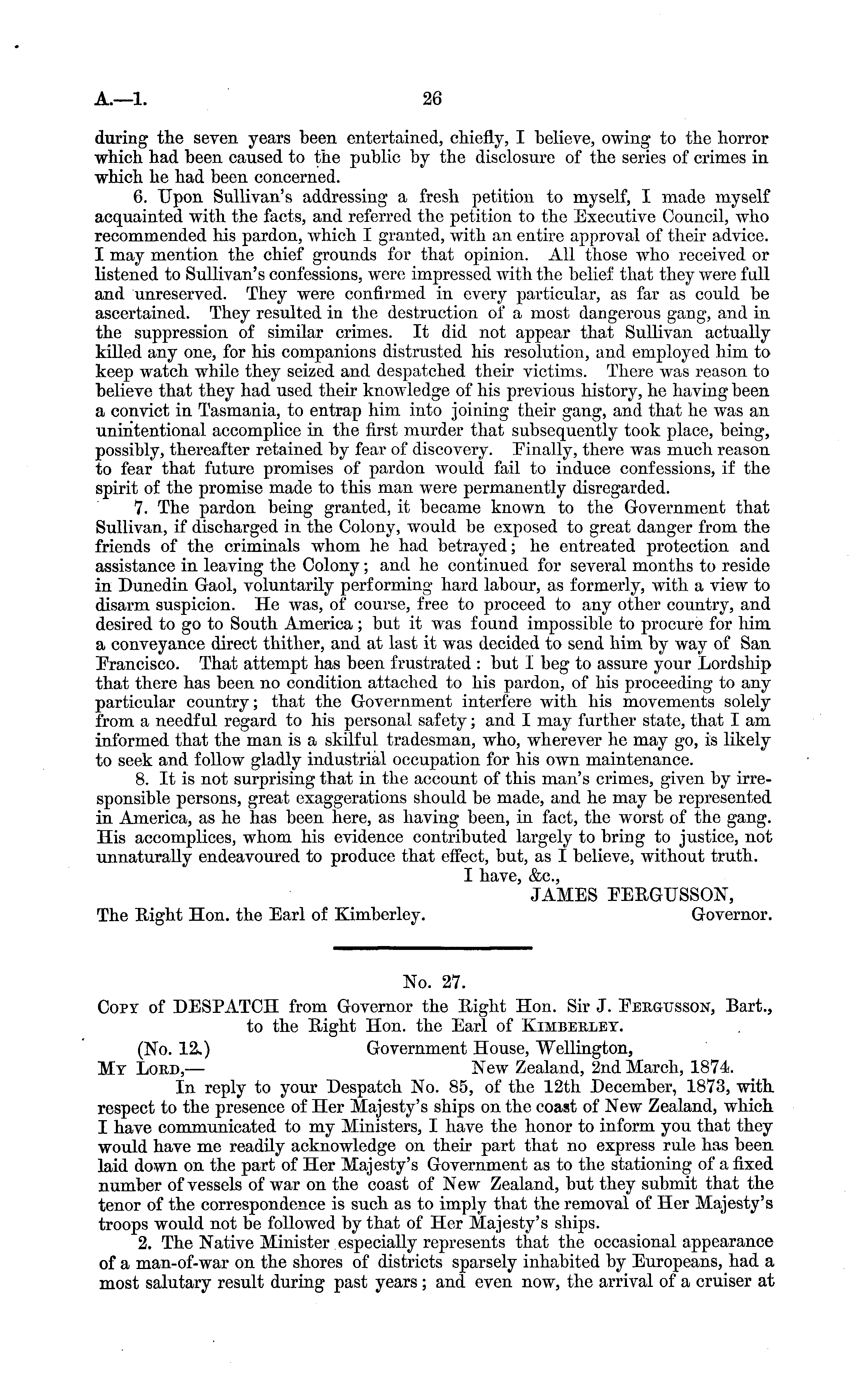 during the seven years been entertained, chiefly, I believe, owing to the horror which had been caused to the public by the disclosure of the series of crimes in which he had been concerned. 6. Upon Sullivan's addressing a fresh petition to myself, I made myself acquainted with the facts, and referred the petition to the Executive Council, who recommended his pardon, which I granted, with an entire approval of their advice. I may mention the chief grounds for that opinion. All those who received or listened to Sullivan's confessions, were impressed with the belief that they were full and unreserved. They were confirmed in every particular, as far as could be ascertained. They resulted in the destruction of a most dangerous gang, and in the suppression of similar crimes. It did not appear that Sullivan actually killed any one, for his companions distrusted his resolution, and employed him to keep watch while they seized and despatched their victims. There was reason to believe that they had used their knowledge of his previous history, he having been a convict in Tasmania, to entrap him into joining their gang, and that he was an unintentional accomplice in the first murder that subsequently took place, being, possibly, thereafter retained by fear of discovery. Finally, there was much reason to fear that future promises of pardon would fail to induce confessions, if the spirit of the promise made to this man were permanently disregarded. 7. The pardon being granted, it became known to the Government that Sullivan, if discharged in the Colony, would be exposed to great danger from the friends of the criminals whom he had betrayed; he entreated protection and assistance in leaving the Colony; and he continued for several months to reside in Dunedin Gaol, voluntarily performing hard labour, as formerly, with a view to disarm suspicion. He was, of course, free to proceed to any other country, and desired to go to South America; but it was found impossible to procure for him a conveyance direct thither, and at last it was decided to send him by way of San Francisco. That attempt has been frustrated : but 1 beg to assure your Lordship that there has been no condition attached to his pardon, of his proceeding to any particular country; that the Government interfere with his movements solely from a needful regard to his personal safety; and I may further state, that lam informed that the man is a skilful tradesman, who, wherever he may go, is likely to seek and follow gladly industrial occupation for his own maintenance. 8. It is not surprising that in the account of this man's crimes, given by irresponsible persons, great exaggerations should be made, and he may be represented in America, as he has been here, as having been, in fact, the worst of the gang. His accomplices, whom his evidence contributed largely to bring to justice, not unnaturally endeavoured to produce that effect, but, as I believe, without truth. I have, &c, JAMES FERGUSSON, The Right Hon. the Earl of Kimberley. Governor.