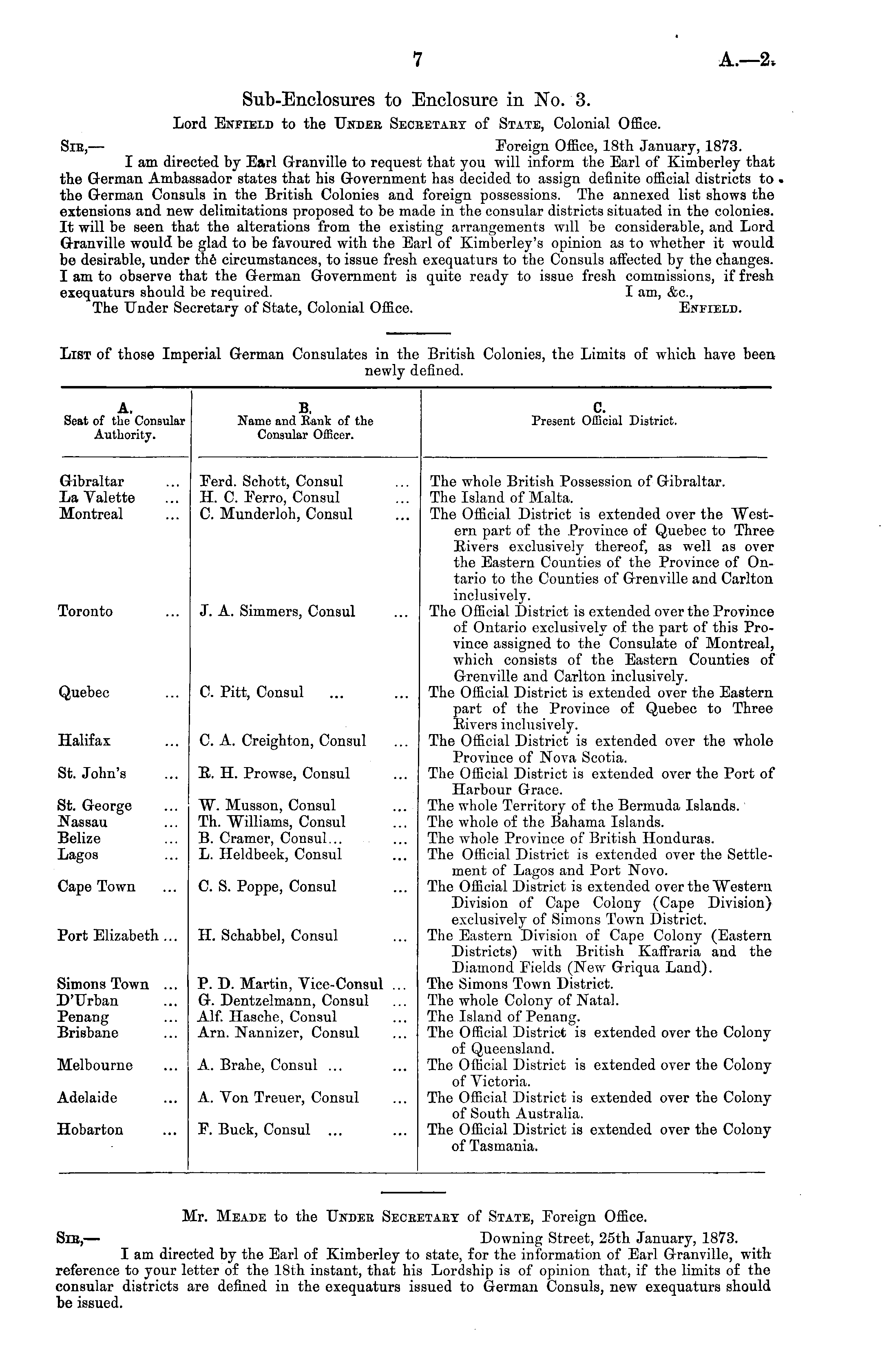 Sub-Enclosures to Enclosure in No. 3. Lord Enfield to the Undee Seceetaey of State, Colonial Office. Sic, — Foreign Office, 18th January, 1873. I am directed by Earl Granville to request that you will inform the Earl of Kimberley that the German Ambassador states that his Government has decided to assign definite official districts to the German Consuls in the British Colonies and foreign possessions. The annexed list shows the extensions and new delimitations proposed to be made in the consular districts situated in the colonies. It will be seen that the alterations from the existing arrangements will be considerable, and Lord Granville would be glad to be favoured with the Earl of Kimberley's opinion as to whether it would be desirable, under the circumstances, to issue fresh exequaturs to the Consuls affected by the changes. I am to observe that the German Government is quite ready to issue fresh commissions, if fresh exequaturs should be required. I am, &c, The Under Secretary of State, Colonial Office. Enfield.