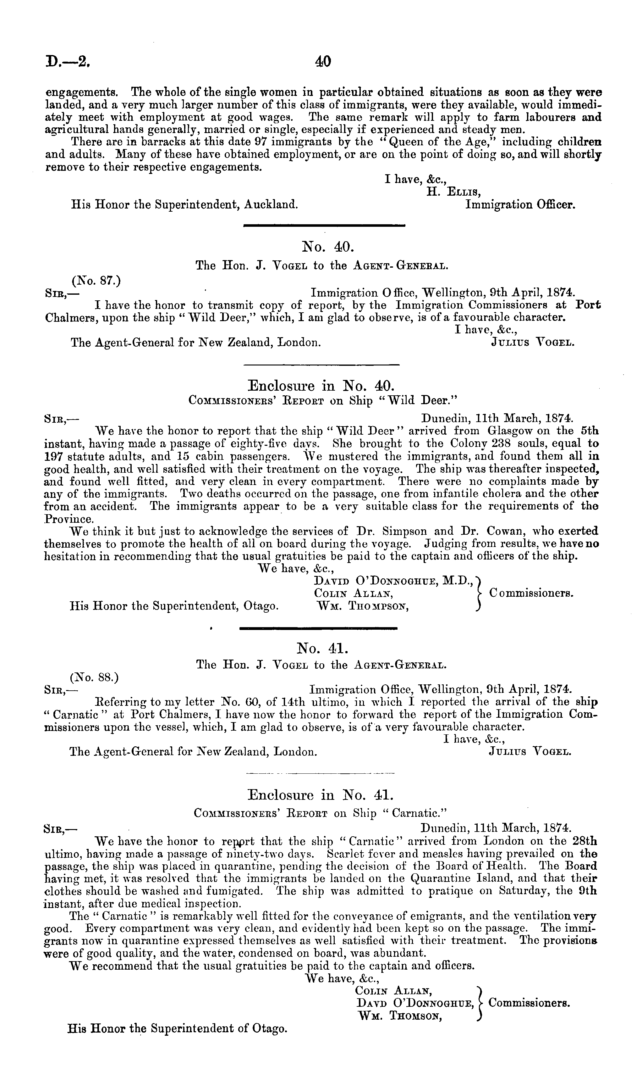 Enclosure in No. 40. Commissionees' Report on Ship "Wild Deer." Sir,— Dunedin, llth March, 1874. AYe have the honor to report that the ship " Wild Deer " arrived from Glasgow on the sth instant, having made a passage of eighty-five days. She brought to the Colony 238 souls, equal to 197 statute adults, and 15 cabin passengers. We mustered the immigrants, and found them all in good health, and well satisfied with their treatment on the voyage. The ship was thereafter inspected, and found well fitted, and very clean in every compartment. There were no complaints made by any of tho immigrants. Two deaths occurred on the passage, one from infantile cholera and the other from an accident. The immigrants appear to be a very suitable class for the requirements of the Province. Wo think it but just to acknowledge the services of Dr. Simpson and Dr. Cowan, who exerted themselves to promote the health of all on board during the voyage. Judging from results, we have no hesitation in recommending that the usual gratuities be paid to the captain and officers of the ship. We have, Ac, David O'Donnoghue, M.D., A Colin Allan, > Commissioners. His Honor the Superintendent, Otago. Wm. Thompson, )