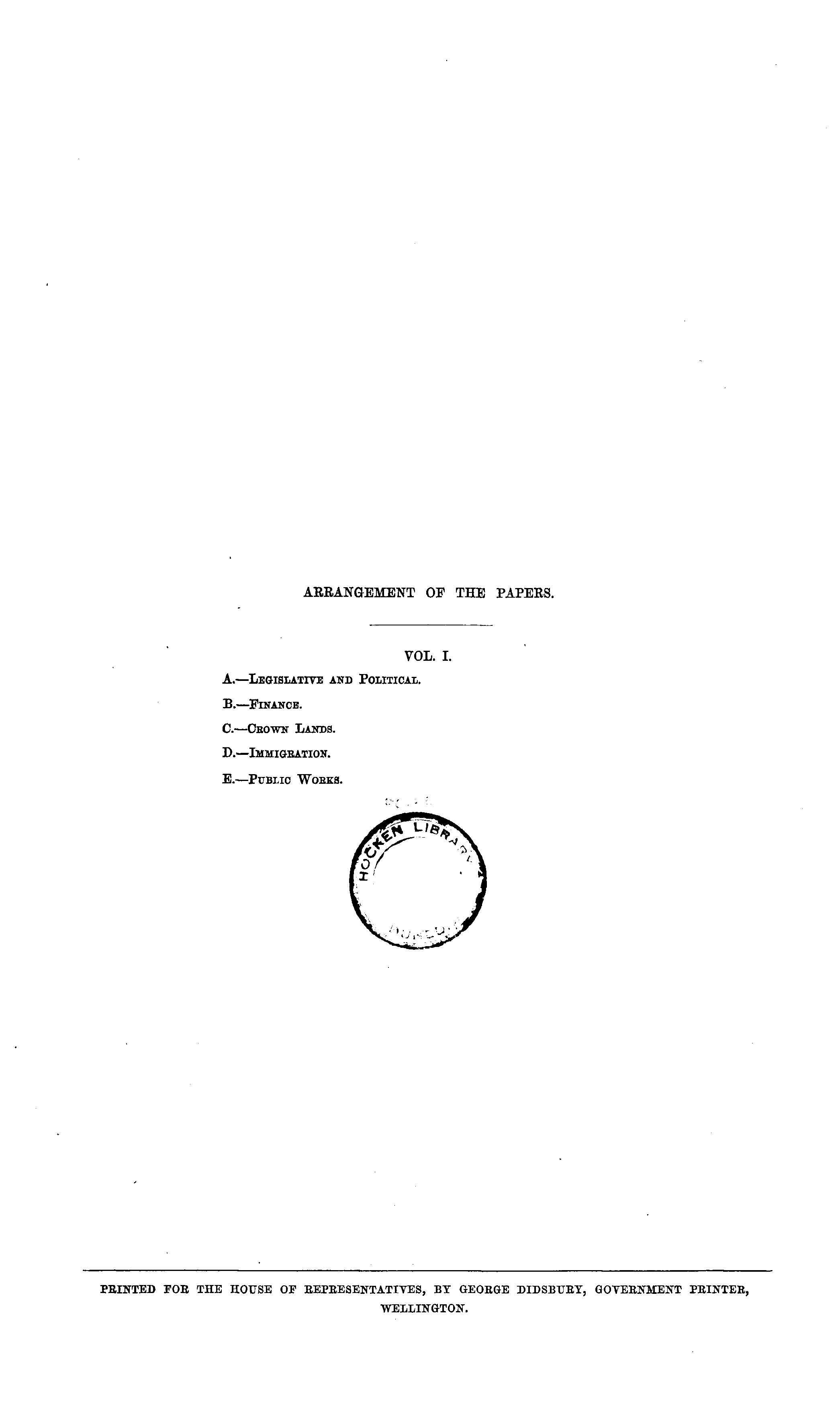 VOL. I. A.—Legislative and Political. B.—Finance. C.—Crown Lands. D.—lmmigration. E.—Public Works.