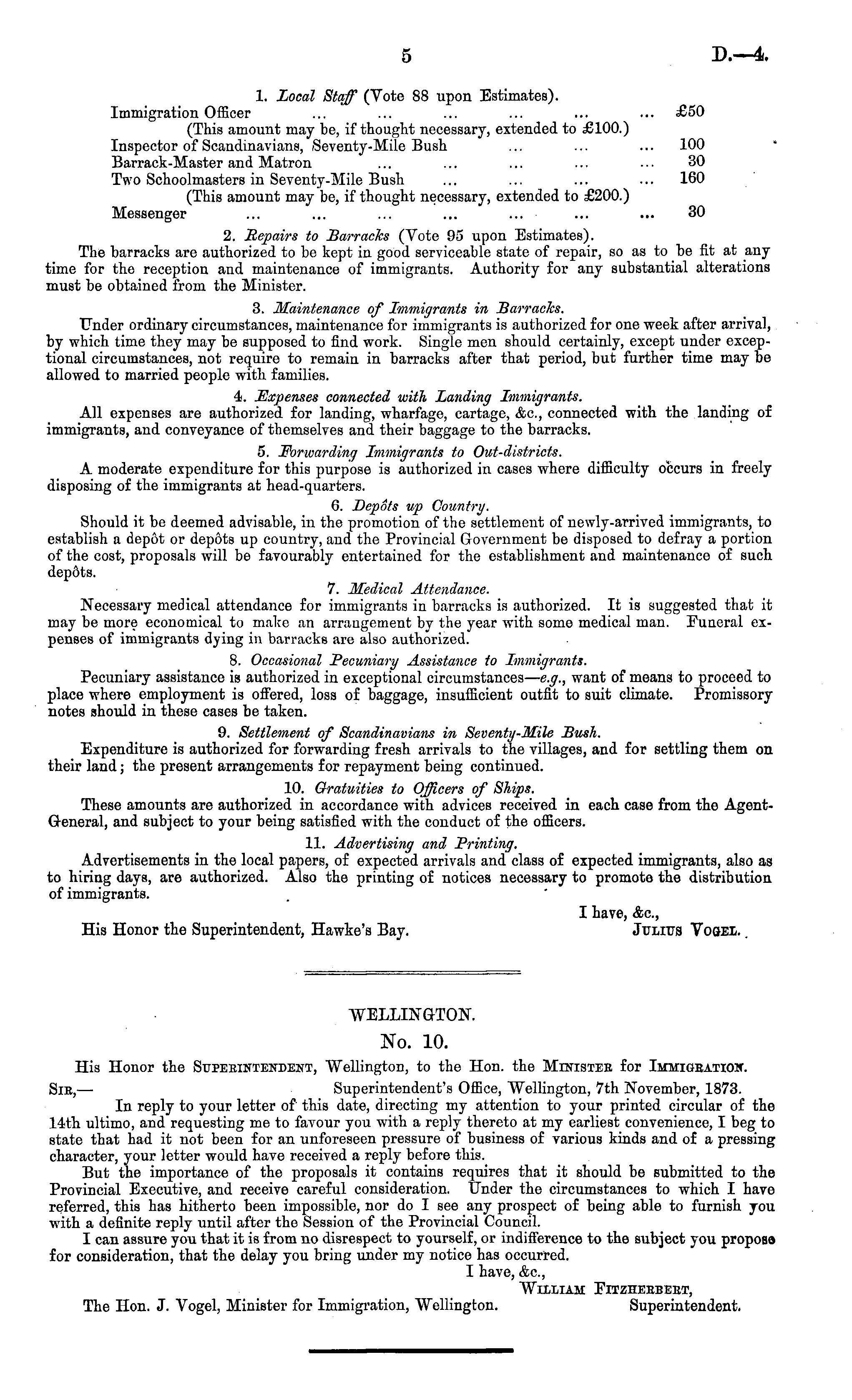 WELLINGTON. No. 10. His Honor the Superintendent, "Wellington, to the Hon. the Minister for Immigration. Sic, — Superintendent's Office, "Wellington, 7th November, 1873. In reply to your letter of this date, directing my attention to your printed circular of the 14th ultimo, and requesting me to favour you with a reply thereto at my earliest convenience, I beg to state that had it not been for an unforeseen pressure of business of various kinds and of a pressing character, your letter would have received a reply before this. But the importance of the proposals it contains requires that it should be submitted to the Provincial Executive, and receive careful consideration. "Under the circumstances to which I have referred, this has hitherto been impossible, nor do I see any prospect of being able to furnish you with a definite reply until after the Session of the Provincial Council. I can assure you that it is from no disrespect to yourself, or indifference to the subject you proposa for consideration, that the delay you bring under my notice has occurred. I have, &c, "William Fttzheebeet, The Hon. J. Vogel, Minister for Immigration, "Wellington. Superintendent.