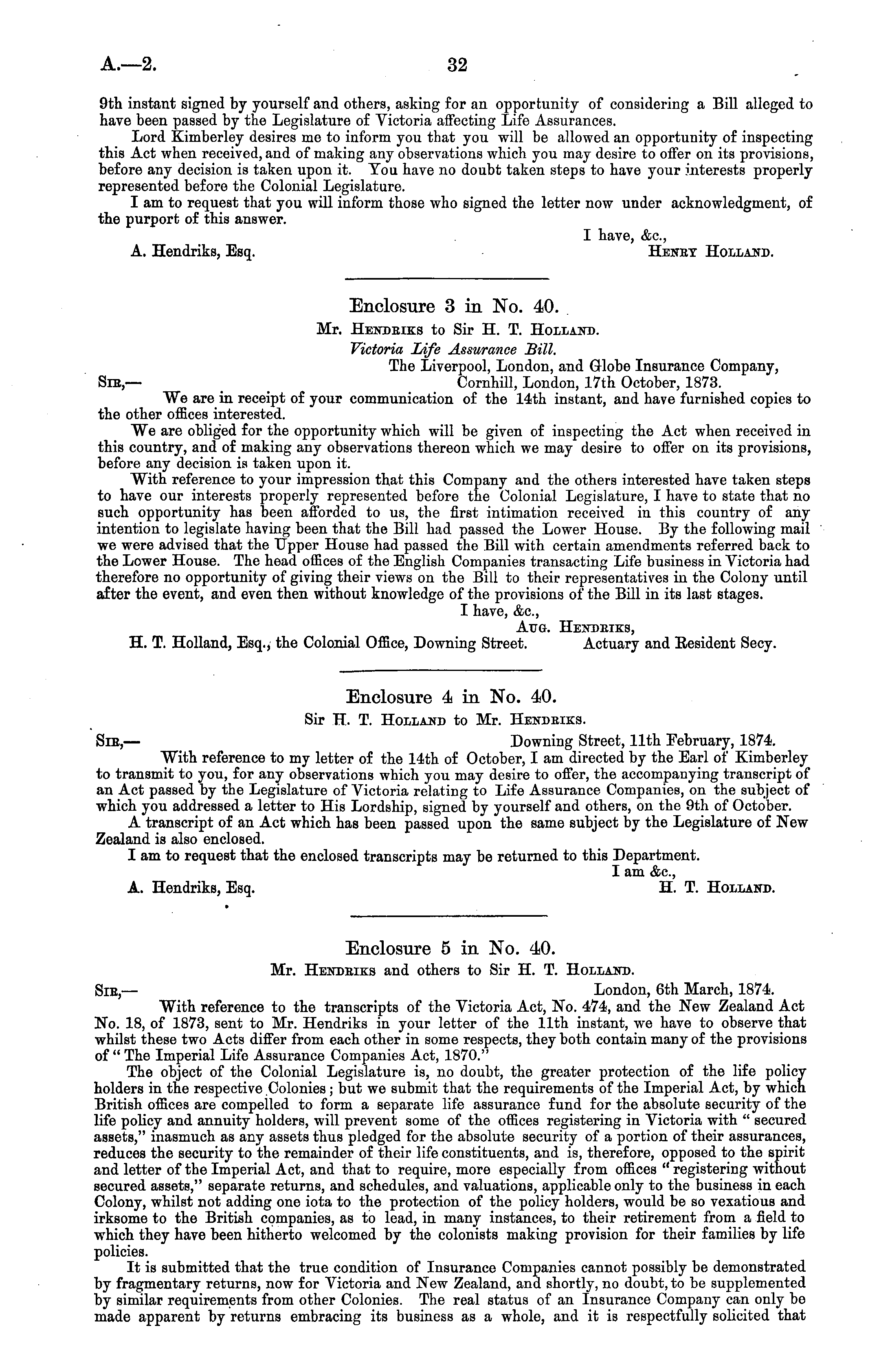 9th instant signed by yourself and others, asking for an opportunity of considering a Bill alleged to have been passed by the Legislature of Victoria affecting Life Assurances. Lord Kimberley desires me to inform you that you will be allowed an opportunity of inspecting this Act when received, and of making any observations which you may desire to offer on its provisions, before any decision is taken upon it. You have no doubt taken steps to have your interests properly represented before the Colonial Legislature. I am to request that you will inform those who signed the letter now under acknowledgment, of the purport of this answer. I have, &c, A. Hendriks, Esq. • Henry Holland.