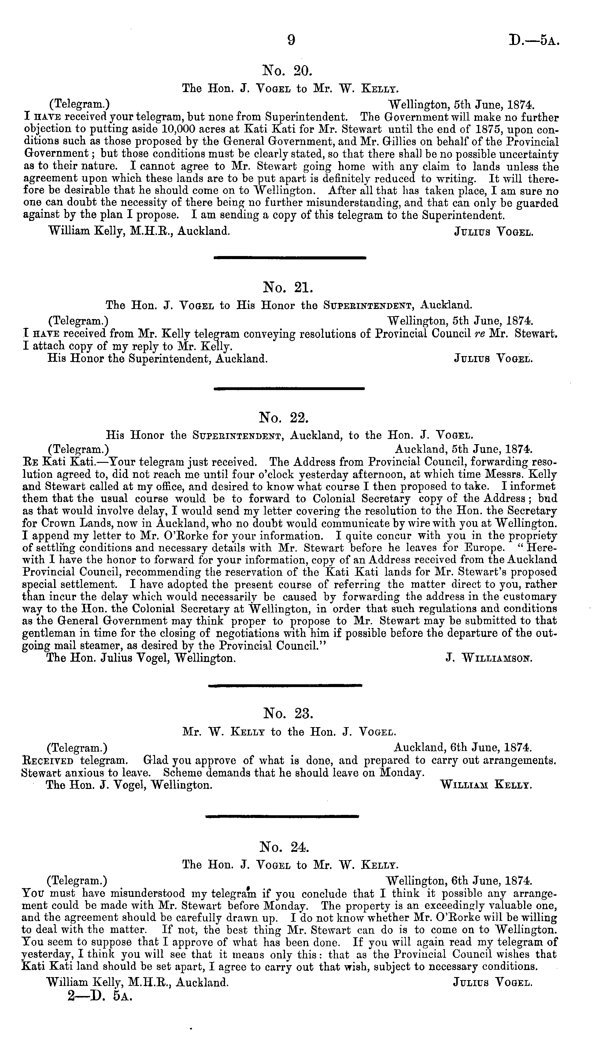 No. 20. The Hon. J. Vogel to Mr. W. Kelly. (Telegram.) Wellington, sth June, 1874. I hate received your telegram, but none from Superintendent. The Government will make no further objection to putting aside 10,000 acres at Kati Kati for Mr. Stewart until the end of 1875, upon conditions such as those proposed by the General Government, and Mr. Gillies on behalf of the Provincial Government; but those conditions must be clearly stated, so that there shall be no possible uncertainty as to their nature. I cannot agree to Mr. Stewart going home with any claim to lands unless the agreement upon which these lands are to be put apart is definitely reduced to writing. It will therefore be desirable that he should come on to Wellington. After all that has taken place, lam sure no one can doubt the necessity of there being no further misunderstanding, and that can only be guarded against by the plan I propose. lam sending a copy of this telegram to the Superintendent. William Kelly, M.H.E., Auckland. Julius Vogel.