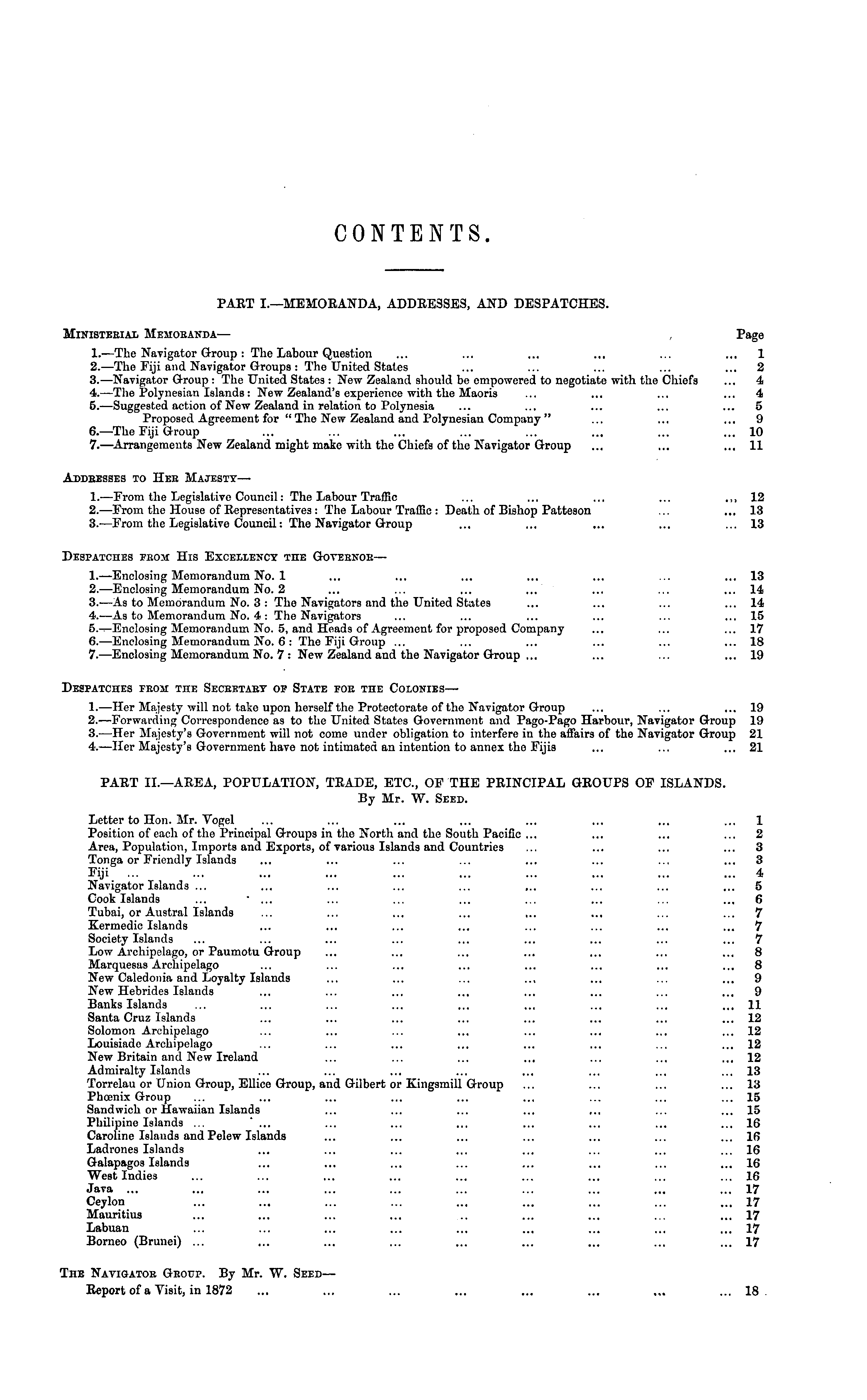 PART I.—MEMORANDA, ADDRESSES, AND DESPATCHES. Ministerial Memoranda — , Page 1.' —The Navigator Group : The labour Question ... ... ... ... ... ... 1 2.—The Fiji and Navigator Groups : The United Stales ... ... ... ... ... 2 3.—Navigator Group : The United States : New Zealand should be empowered to negotiate with the Chiefs ... 4 4. —The Polynesian Islands : New Zealand's experience with the Maoris ... ... ... ... 4 s.—Suggested action of New Zealand in relation to Polynesia ... ... ... ... ... 5 Proposed Agreement for " The New Zealand and Polynesian Company " ... ... ... 9 6.—The Fiji Group ... ... ... ... ... ... ... ... 10 7. —Arrangements New Zealand might make with the Chiefs of the Navigator Group ... ... ... 11 Addresses to Her Majesty— 1. —From the Legislative Council: The Labour Traffic ... ... ... ... ~,12 2. —From the House of Representatives : The Labour Traffic : Death of Bishop Patteson ... ... 13 3. —From the Legislative Council: The Navigator Group ... ... ... ... ... 13 Despatches prom His Excellency tiie Governor— 1. —Enclosing Memorandum No. 1 ... ... ... ... ... ... ... 13 2. —Enclosing Memorandum No. 2 ... ... ... ... ... ... ... 14 3.—As to Memorandum No. 3 : The Navigators and the United States ... ... ... ... 14 4.—As to Memorandum No. 4 : The Navigators ... ... ... ... ... ... 15 5.-^Enclosing Memorandum No. 5, and Heads of Agreement for proposed Company ... ... ... 17 6.—Enclosing Memorandum No. 6 : The Fiji Group ... ... ... ... ... ... 18 7. —Enclosing Memorandum No. 7 : New Zealand and the Navigator Group ... ... ... ... 19 Despatches from the Seceetart op State for tiie Colonies— I.—Her Majesty will not take upon herself the Protectorate of the Navigator Group ... ... ... 19 2.—Forwarding Correspondence as to the United States Government and Pago-Pago Harbour, Navigator Group 19 3. —Her Majesty's Government will not come under obligation to interfere in the affairs of the Navigator Group 21 4. —Her Majesty's Government have not intimated an intention to annex the Fijis ... ... ... 21 PART lI.—AREA, POPULATION, TRADE, ETC., OF THE PRINCIPAL GROUPS OF ISLANDS. By Mr. W. Seed. Letter to Hon. Mr. Vogel ... ... ... ... ... ... ... ... 1 Position of each of the Principal Groups in the North and the South Pacific ... ... ... ... 2 Area, Population, Imports and Exports, of various Islands and Countries ... ... ... ... 3 Tonga or Friendly Islands ... ... ... ... ... ... ... ... 3 Fiji ... ... ... ... ... ... ... ... ... ... 4 Navigator Islands ... ... ... ... ... ... ... ... ... 5 Cook Islands ... ' ... ... ... ... ... ... ... ... 6 Tubai, or Austral Islands ... ... ... ... ... ... ... ... 7 Kermedic Islands ... ... ... ... ... ... ... ... 7 Society Islands ... ... ... ... ... ... ... ... ... 7 Low Archipelago, or Paumotu Group ... ... ... ... ... ... ... 8 Marquesas Archipelago ... ... ... ... ... ... ... ... 8 New Caledonia and Loyalty Islands ... ... ... .., ... ... ... 9 New Hebrides Islands ... ... ... ... ... ... ... ... 9 Banks Islands ... ... ... ... ... ... ... ... ... 11 Santa Cruz Islands ... ... ... ... ... ... ... ... 12 Solomon Archipelago ... ... ... ... ... ... ... ... 12 Louisiado Archipelago ... ... ... ... ... ... ... ... 12 New Britain and New Ireland ... ... ... ... ... ... ... 12 Admiralty Islands ... ... ... ... ... ... ... ... 13 Torrelau or Union Group, Ellice Group, and Gilbert or Kingsmill Group ... ... ... ... 13 Pbamix Group ... ... ... ... ... ... ... ... ... 15 Sandwich or Hawaiian Islands ... ... ... ... ... ... ... 15 Philipine Islands ... ... ... ... ... ... ... ... ... 16 Caroline Islands and Pelew Islands ... ... ... ... ... ... ... 16 Ladrones Islands ... ... ... ... ... ... ... ... 16 Galapagos Islands ... ... ... ... ... ... ... ... 16 West Indies ... ... ... ... ... ... ... ... ... 16 Java ... ... ... ... ... ... ... ... ... ... 17 Ceylon ... ... ... ... ... ... ... ... ... 17 Mauritius ... ... ... ... ... ... ... ... ... 17 Labuan ... ... ... ... ... ... ... ... ... 17 Borneo (Brunei) ... ... ... ... ... ... ... ... ... 17 The Navigator Group. By Mr. W. Seed—■ Report of a Visit, in 1872 ... ... ... ... ... ... ... ... 18