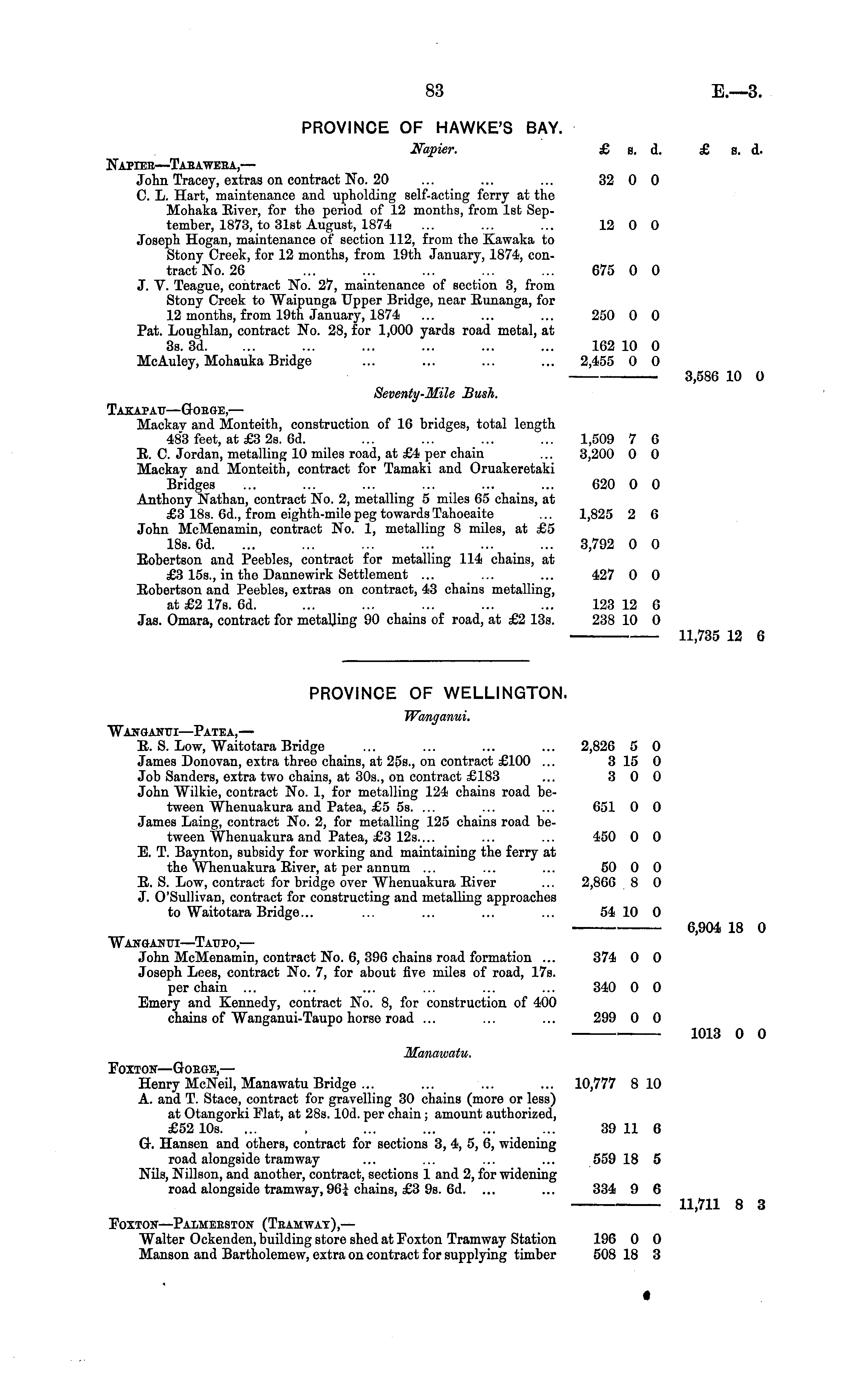 PROVINCE OF HAWKE'S BAY. Napier. £ s. d. £ s. d. Napier—Taeaweea,— John Tracey, extras on contract No. 20 ... ... ... 32 0 0 C. L. Hart, maintenance and upholding self-acting ferry at the Mohaka River, for the period of 12 months, from Ist September, 1873, to 31st August, 1874 ... ... ... 12 0 0 Joseph Hogan, maintenance of section 112, from the Kawaka to Stony Creek, for 12 months, from 19th January, 1874, contract No. 26 ... ... ... ... ... 675 0 0 J. V. Teague, contract No. 27, maintenance of section 3, from Stony Creek to Waipunga Upper Bridge, near Runanga, for 12 months, from 19th January, 1874 ... ... ... 250 0 0 Pat. Loughlan, contract No. 28, for 1,000 yards road metal, at 3s. 3d. ... ... ... ... ... ... 162 10 0 McAuley, Mohauka Bridge ... ... ... ... 2,455 0 0 3,586 10 0 Seventy-Mile Bush. Takapat:—Gobge,— Mackay and Monteith, construction of 16 bridges, total length 48"3 feet, at £3 2s. 6d. ... ... ... ... 1,509 7 6 R. C. Jordan, metalling 10 miles road, at £4 per chain ... 3,200 0 0 Mackay and Monteith, contract for Tamaki and Oruakeretaki Bridges ... ... ... ... ... ... 620 0 0 Anthony Nathan, contract No. 2, metalling 5 miles 65 chains, at £3 18s. 6d., from eighth-mile peg towards Tahoeaite ... 1,825 2 6 John McMenamin, contract No. 1, metalling 8 miles, at £5 18s. 6d. ... ... ... ... ... ... 3,792 0 0 Robertson and Peebles, contract for metalling 114 chains, at £3 155., in the Dannewirk Settlement ... ... ... 427 0 0 Robertson and Peebles, extras on contract, 43 chains metalling, at £2 17s. 6d. ... ... ... ... ... 123 12 6 Jas. Omara, contract for metalling 90 chains of road, at £2 13s. 238 10 0 11,735 12 6