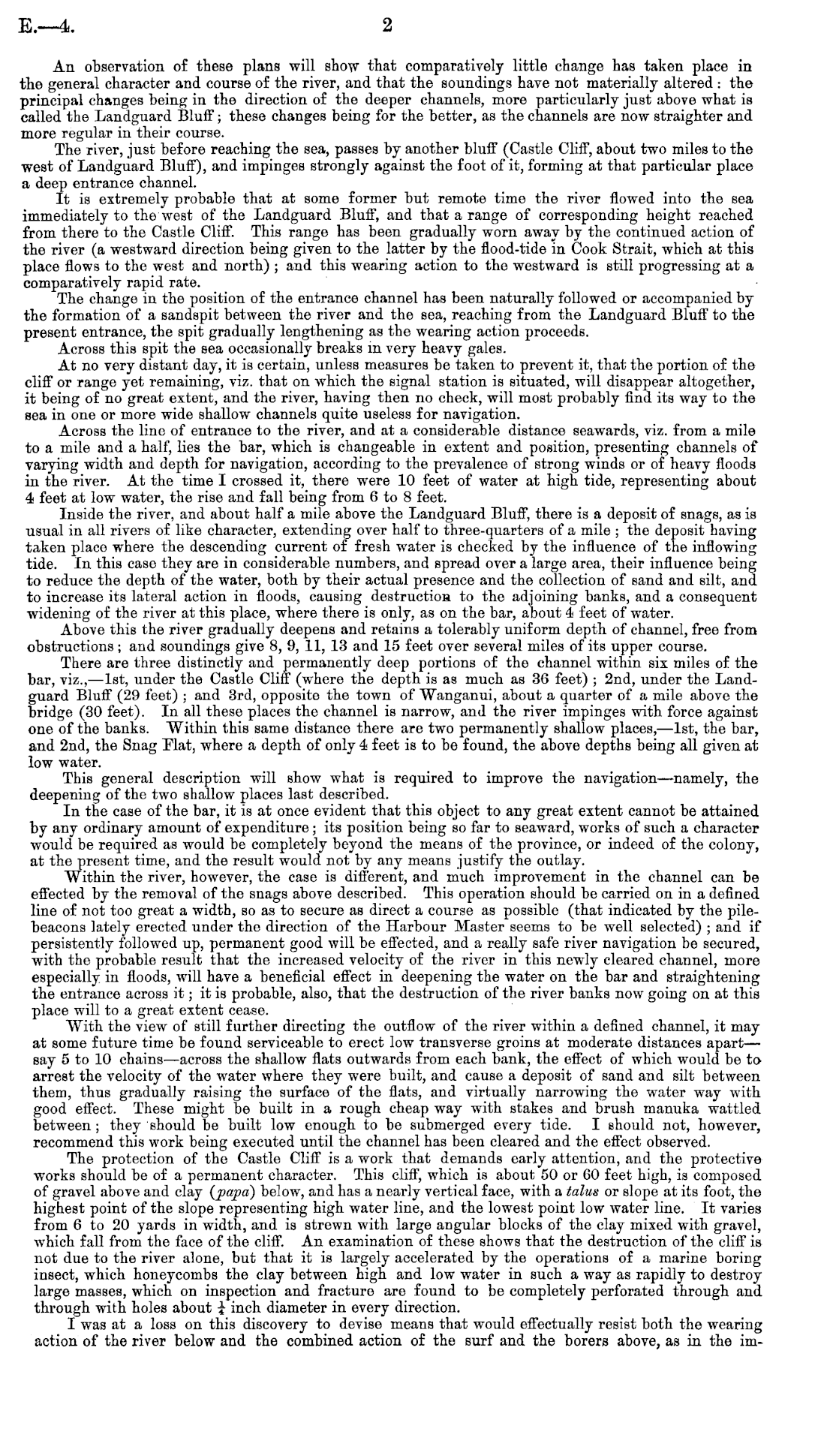 An observation of these plans will show that comparatively little change has taken place in the general character and course of the river, and that the soundings have not materially altered : the principal changes being in the direction of the deeper channels, more particularly just above what is called the Landguard Bluff; these changes being for the better, as the channels are now straighter and more regular in their course. The river, just before reaching the sea, passes by another bluff (Castle Cliff, about two miles to the west of Landguard Bluff), and impinges strongly against the foot of it, forming at that particular place a deep entrance channel. It is extremely probable that at some former but remote time the river flowed into the sea immediately to the west of the Landguard Bluff, and that a range of corresponding height reached from there to the Castle Cliff. This range has been gradually worn away by the continued action of the river (a westward direction being given to the latter by the flood-tide in Cook Strait, which at this place flows to the west and north) ; and this wearing action to the westward is still progressing at a comparatively rapid rate. The change in the position of the entrance channel has been naturally followed or accompanied by the formation of a sandspit between the river and the sea, reaching from the Landguard Bluff to the present entrance, the spit gradually lengthening as the wearing action proceeds. Across this spit the sea occasionally breaks in very heavy gales. At no very distant day, it is certain, unless measures be taken to prevent it, that the portion of the cliff or range yet remaining, viz. that on which the signal station is situated, will disappear altogether, it being of no great extent, and the river, having then no check, will most probably find its way to the sea in one or more wide shallow channels quite useless for navigation. Across the line of entrance to the river, and at a considerable distance seawards, viz. from a mile to a mile and a half, lies the bar, which is changeable in extent and position, presenting channels of varying width and depth for navigation, according to the prevalence of strong winds or of heavy floods in the river. At the time I crossed it, there were 10 feet of water at high tide, representing about 4 feet at low water, the rise and fall being from 6 to 8 feet. Inside the river, and about half a mile above the Landguard Bluff, there is a deposit of snags, as is usual in all rivers of like character, extending over half to three-quarters of a mile ; the deposit having taken place where the descending current of fresh water is checked by the influence of the inflowing tide. In this case they are in considerable numbers, and spread over a large area, their influence being to reduce the depth of the water, both by their actual presence and the collection of sand and silt, and to increase its lateral action in floods, causing destruction to the adjoining banks, and a consequent widening of the river at this place, where there is only, as on the bar, about 4 feet of water. Above this the river gradually deepens and retains a tolerably uniform depth of channel, free from obstructions; and soundings give 8, 9, 11, 13 and 15 feet over several miles of its upper course. There are three distinctly and permanently deep portions of the channel within six miles of the bar, viz., —Ist, under the Castle Cliff (where the depth is as much as 36 feet) ; 2nd, under the Landguard Bluff (29 feet) ; and 3rd, opposite the town of Wanganui, about a quarter of a mile above the bridge (30 feet). In all these places the channel is narrow, and the river impinges with force against one of the banks. Within this same distance there are two permanently shallow places,—lst, the bar, and 2nd, the Snag Flat, where a depth of only 4 feet is to be found, the above depths being all given at low water. This general description will show what is required to improve the navigation —namely, the deepening of the two shallow places last described. In the case of the bar, it is at once evident that this object to any great extent cannot be attained by any ordinary amount of expenditure ; its position being so far to seaward, works of such a character would be required as would be completely beyond the means of the province, or indeed of the colony, at the present time, and the result would not by any means justify the outlay. Within the river, however, the case is different, and much improvement in the channel can be effected by the removal of the snags above described. This operation should be carried on in a defined line of not too great a width, so as to secure as direct a course as possible (that indicated by the pilebeacons lately erected under the direction of the Harbour Master seems to be well selected) ; and if persistently followed up, permanent good will bo effected, and a really safe river navigation be secured, with the probable result that the increased velocity of the river in this newly cleared channel, more especially in floods, will have a beneficial effect in deepening the water on the bar and straightening the entrance across it; it is probable, also, that the destruction of the river banks now going on at this place will to a great extent cease. With the view of still further directing the outflow of the river within a defined channel, it may at some future time be found serviceable to erect low transverse groins at moderate distances apart— say 5 to 10 chains—across the shallow flats outwards from each bank, the effect of which would be to arrest the velocity of the water where they were built, and cause a deposit of sand and silt between them, thus gradually raising the surface of the flats, and virtually narrowing the water way with good effect. These might be built in a rough cheap way with stakes and brush manuka wattled between ; they should be built low enough to be submerged every tide. I should not, however, 