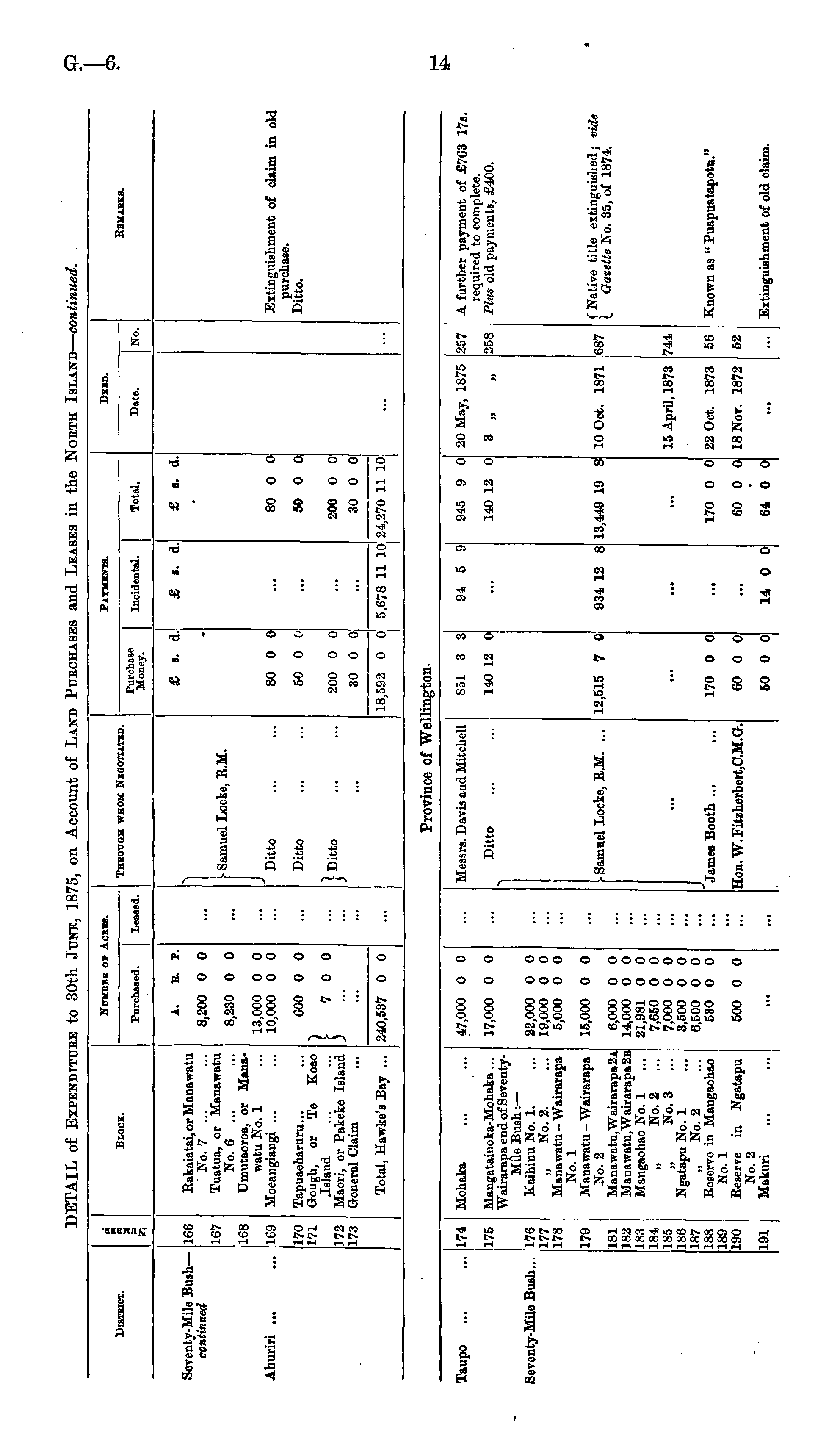 iXPENDITU: 1o TINE, i, on ccount o; 'ueciiases an< iEASES in OETU SLAXD Cl ,/inuei ■j '/■< XU5IBI.I1 OT CHE9. Payments. Deed. DlSTBICT. Block. KieMAUK.-. Purchased. Leased. Purchase Money. Incidental. Total. Date. No. A. B. P. £ s. d. £ s. d. £ s. d. Seventy-Mile Bush — continued 166 167 Kiikaintai, or Manawatu No. 7 Tuatua, or Manawatu No. 6 ... Umutaoroa, or Manawatu No. 1 Moeangiangi ... ... 8,200 0 0 J- Samuel Locke, R.M. Ditto 1 1168 8,230 0 0 80 0 0 Ahuriri ... ... 169 13,000 0 0 10,000 0 0 80 0 0 Extinguishment of claim in o] purchase. Ditto. 170 171 172 173 Tapuaeharuru... Gough, or Te Koao .Island Maori, or Pakeke Island General Claim GOO 0 0 I 7 0 0 Ditto ] Ditto 50 0 (i 200 0 0 50 0 0 200 0 0 ... 30 0 0 30 0 0| Total, Hawke's Bay ... 240,537 0 0 18,592 0 « ' 5,678 11 10 24,270 11 10 Province of Wellington. ?aupo 174 Mohaka 47,000 0 0 Messrs. Davis and Mitchell 851 3 3 94 5 0. 945 9 0 20 May, 1875 257 A further payment of £763 17s. required to complete. Plus old payments, £400. 175 Mangatainoka-Mohaka ... Wairarapa end of SeventyMile Bush: — Kaibinu No. 1. No. 2. Manawatu - Wairarapa No. 1 Manawatu - Wairarapa No. 2 Manawatu,Wairarapa2A Manawatu, Wairarapa 2b Mangaohao No. 1 „ No. 2 ... „ No. 3 ... Ngatapu No. 1 „ No. 2 Reserve in Mangaohao No. 1 Reserve in Ngatapu No. 2 Makuri 17,000 0 0 Ditto 140 12 a 140 12 0 3 i) „ 258 loTcnty-Mile Bush... 22,000 0 0 19,000 0 0 5,000 0 0 176 177 178 • Sam «el Locke, R.M. ... ( Native title extinguished ; vide I Gazette No. 35, of 1874. 179 16,000 0 0 181 182 183 184 185 186 187 188 189 190 6,000 0 0 14,000 0 0 21,981 0 0 7,650 0 0 7,000 0 0 3,500 0 0 6,500 0 0 530 0 0 12,515 7 0 934 12 8 13,449 19 8 10 Oct. 1871 687 • •• 15 April, 1873 James Booth ... ,,, 170 0 0 170 0 0 22 Oct. 1873 744 Known as " Puapuatapotu." 5G 500 0 0 Hon. W. Fitzherbert.C.M.G-. 60 0 0 60 0 0 18 Not. 1872 52 191 60 0 0 14 o a • Extinguishment of old claim. 64 0 0