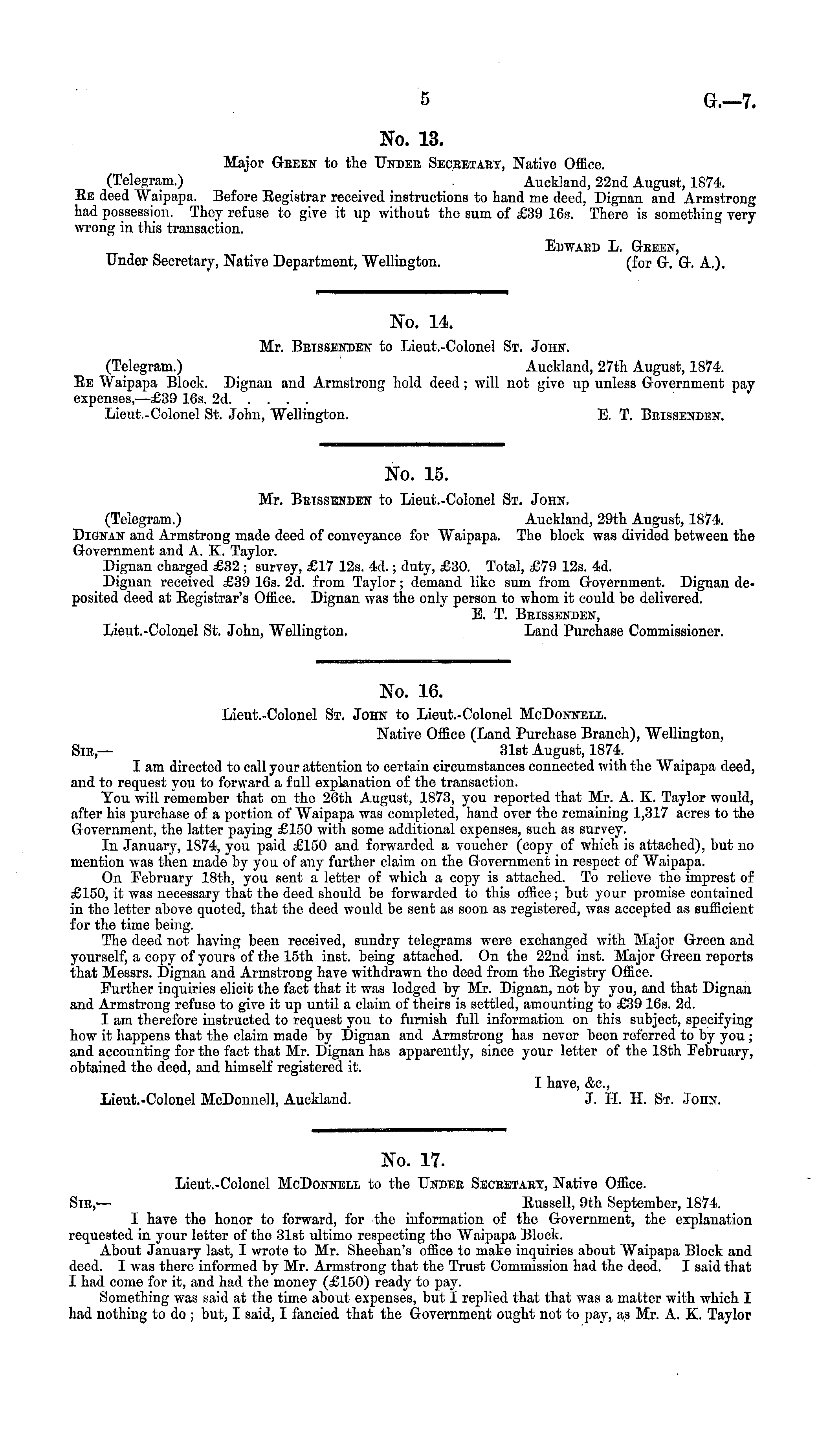 No. 16. Lieut-Colonel St. John to Lieut.-Colonel McDonnell. Native Office (Land Purchase Branch), "Wellington, Sir— 31st August, 1874. I am directed to call your attention to certain circumstances connected with the Waipapa deed, and to request you to forward a full explanation of the transaction. You will remember that on the 26th August, 1873, you reported that Mr. A. K. Taylor would, after his purchase of a portion of Waipapa was completed, hand over the remaining 1,317 acres to the Government, the latter paying £150 with some additional expenses, such as survey. In January, 1874, you paid £150 and forwarded a voucher (copy of which is attached), but no mention was then made by you of any further claim on the Government in respect of Waipapa. On February 18th, you sent a letter of which a copy is attached. To relieve the imprest of £150, it was necessary that the deed should be forwarded to this office; but your promise contained in the letter above quoted, that the deed would be sent as soon as registered, was accepted as sufficient for the time being. The deed uot having been received, sundry telegrams were exchanged with Major Green and yourself, a copy of yours of the 15th inst. being attached. On the 22nd inst. Major Green reports that Messrs. Dignan and Armstrong have withdrawn the deed from the Eegistry Office. Further inquiries elicit the fact that it was lodged by Mr. Dignan, uot by you, and that Dignan and Armstrong refuse to give it up until a claim, of theirs is settled, amounting to £39 16s. 2d. I am therefore instructed to request you to furnish full information on this subject, specifying how it happens that the claim made by Dignan and Armstrong has never been referred to by you ; and accounting for the fact that Mr. Dignan has apparently, since your letter of the 18th February, obtained the deed, and himself registered it. I have, &c, Lieut.-Colonel McDonnell, Auckland. J. H. H. St. John.