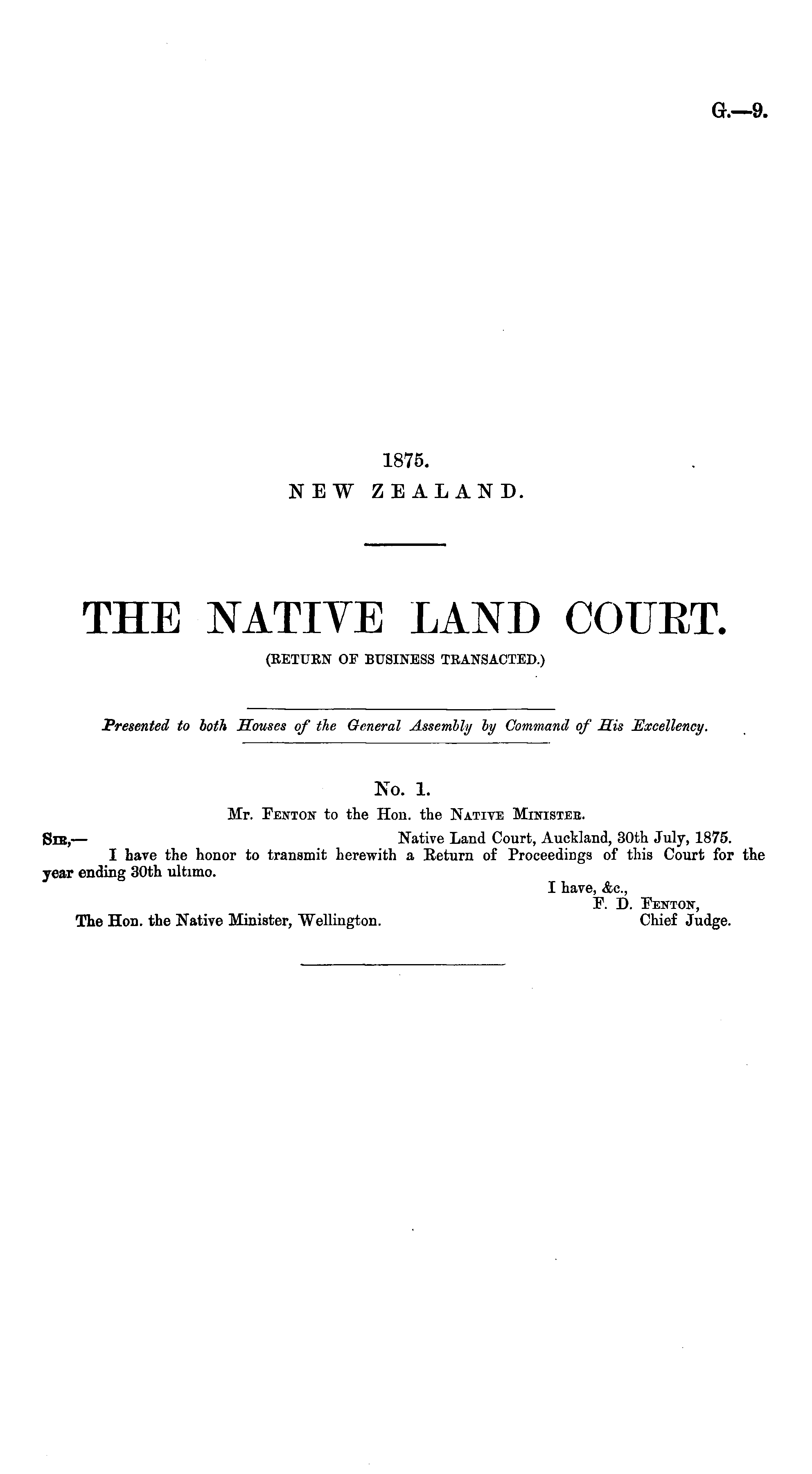 No. 1. Mr. Fenton to the Hon. the Native Ministee. Snt, — Native Land Court, Auckland, 30th July, 1875. I have the honor to transmit herewith a Return of Proceedings of this Court for the year ending 30th ultimo. I have, &c, F. D. Fentoit, The Hon. the Native Minister, Wellington. Chief Judge.