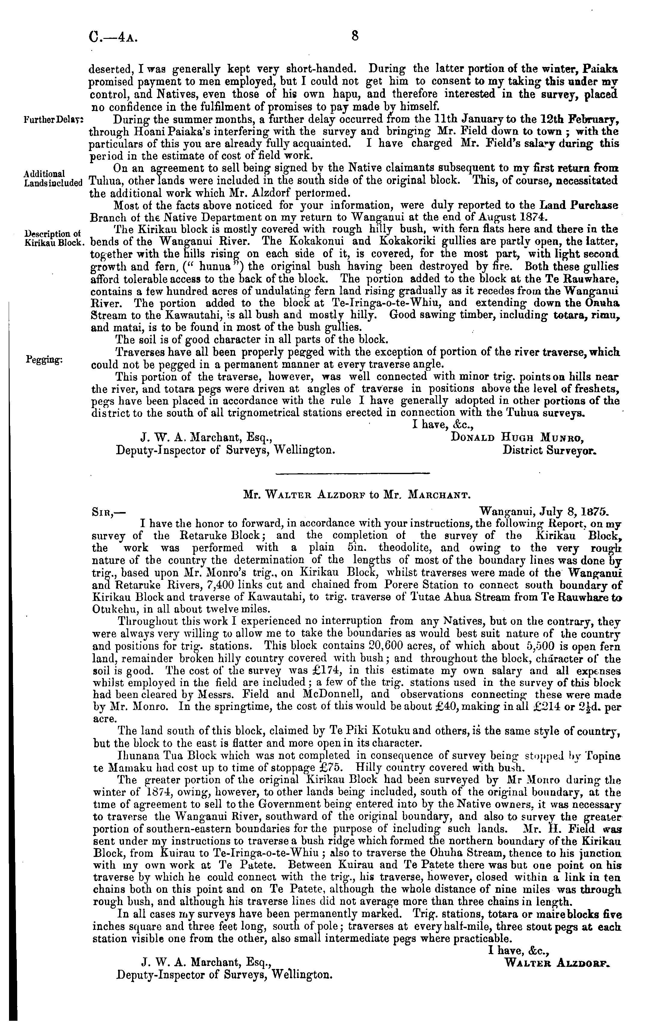 deserted, I was generally kept very short-handed. During the latter portion of the winter, Paiaka promised payment to men employed, but I could not get him to consent to ray taking this under my control, and Natives, even those of his own hapu, and therefore interested in the survey, placed no confidence in the fulfilment of promises to pay made by himself. During the summer months, a further delay occurred from the 11th January to the 12th February, through Hoani Paiaka's interfering with the survey and bringing Mr. Field down to town ; with the particulars of this you are already fully acquainted. I have charged Mr. Field's salary during this period in the estimate of cost of field work. On an agreement to sell being signed by the Native claimants subsequent to my first return from Tuhua, otherlands were included in the south side of the original block. This, of course, necessitated the additional work which Mr. Alzdorf pertormed. Most of the facts above noticed for your information, were duly reported to the Land Purchase Branch of the Native Department on mv return to Wanganui at the end of August 1874. The Kirikau block is mostly covered with rough hilly bush, with fern flats here and there in tlie bends of the Wanganui River. The Kokakonui and Kokakoriki gullies are partly open, the latter, together with the hills rising on each side of it, is covered, for the most part, with light second, growth and fern, (" hunua ") the original bush having been destroyed by fire. Both these gullies afford tolerable access to the back of the block. The portion added to the block at the Te Rauwhare, contains a few hundred acres of undulating fern land rising gradually as it recedes from the Wanganui River. The portion added to the block at Te-Iringa-o-te-Whiu, and extending down the Onuha Stream to the Kawautahi, is all bush and mostly hilly. Good sawing timber, including totara, rimu, and matai, is to be found in most of the bush gullies. The soil is of good character in all parts of the block. Traverses have all been properly pegged with the exception of portion of the river traverse, which. could not be pegged in a permanent manner at every traverse angle. This portion of the traverse, however, was well connected with minor trig, points on hills near the river, and totara pegs were driven at angles of traverse in positions above the level of freshets, pegs have been placed in accordance with the rule I have generally adopted in other portions of the district to the south of all trignometrical stations erected in connection with the Tuhua surveys. I have, &c, J. W. A. Marchant, Esq., Donald Hugh Munro, Deputy-Inspector of Surveys, Wellington. District Surveyor.
