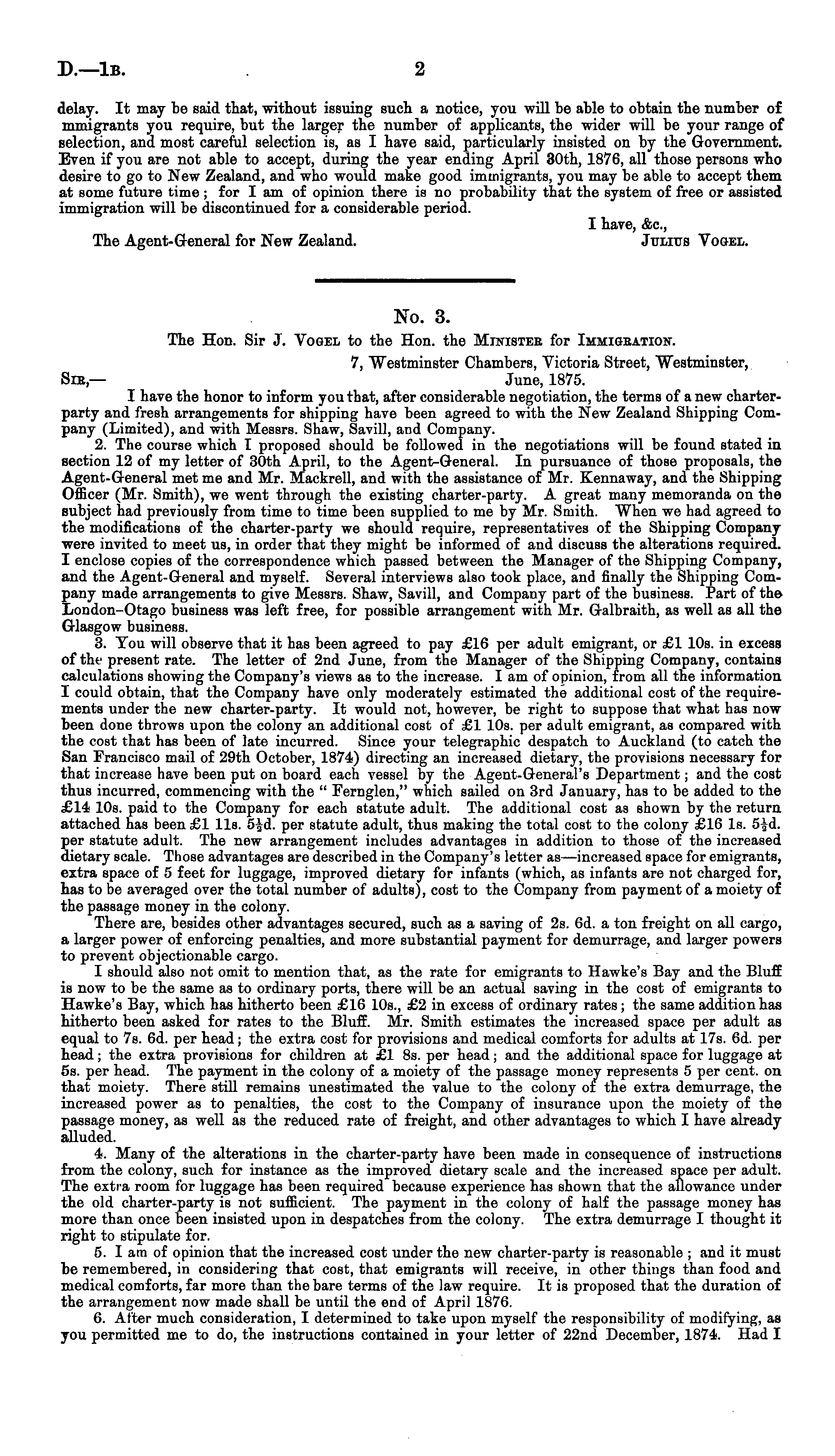 No. 3. The Hon. Sir J. Vogel to the Hon. the Minister for Immigration. 7, Westminster Chambers, Victoria Street, Westminster, Sic, — June, 1875. I have the honor to inform you that, after considerable negotiation, the terms of a new charterparty and fresh arrangements for shipping have been agreed to with the New Zealand Shipping Company (Limited), and with Messrs. Shaw, Savill, and Company. 2. The course which I proposed should be followed in the negotiations will be found stated in section 12 of my letter of 30th April, to the Agent-General. In pursuance of those proposals, the Agent-General met me and Mr. Mackrell, and with the assistance of Mr. Kennaway, and the Shipping Officer (Mr. Smith), we went through the existing charter-party. A great many memoranda on the subject had previously from time to time been supplied to me by Mr. Smith. When we had agreed to the modifications of the charter-party we should require, representatives of the Shipping Company were invited to meet us, in order that they might be informed of and discuss the alterations required. I enclose copies of the correspondence which passed between the Manager of the Shipping Company, and the Agent-General and myself. Several interviews also took place, and finally the Shipping Company made arrangements to give Messrs. Shaw, Savill, and Company part of the business. Part of the London-Otago business was left free, for possible arrangement with Mr. Galbraith, as well as all the Glasgow business. 3. You will observe that it has been agreed to pay £16 per adult emigrant, or £1 10s. in excess of the present rate. The letter of 2nd June, from the Manager of the Shipping Company, contains calculations showing the Company's views as to the increase. I am of opinion, from all the information I could obtain, that the Company have only moderately estimated the additional cost of the requirements under the new charter-party. It would not, however, be right to suppose that what has now been done throws upon the colony an additional cost of £1 10s. per adult emigrant, as compared with the cost that has been of late incurred. Since your telegraphic despatch to Auckland (to catch the San Francisco mail of 29th October, 1874) directing an increased dietary, the provisions necessary for that increase have been put on board each vessel by the Agent-General's Department; and the cost thus incurred, commencing with the " Fernglen," which sailed on 3rd January, has to be added to the £14 10s. paid to the Company for each statute adult. The additional cost as shown by the return attached has been £1 lls. s^d. per statute adult, thus making the total cost to the colony £16 Is. s£d. per statute adult. The new arrangement includes advantages in addition to those of the increased dietary scale. Those advantages are described in the Company's letter as —increased space for emigrants, extra space of 5 feet for luggage, improved dietary for infants (which, as infants are not charged for, has to be averaged over the total number of adults), cost to the Company from payment of a moiety of the passage money in the colony. There are, besides other advantages secured, such as a saving of 2s. 6d. a ton freight on all cargo, a larger power of enforcing penalties, and more substantial payment for demurrage, and larger powers to prevent objectionable cargo. I should also not omit to mention that, as the rate for emigrants to Hawke's Bay and the Bluff is now to be the same as to ordinary ports, there will be an actual saving in the cost of emigrants to Hawke's Bay, which has hitherto been £16 10s., £2 in excess of ordinary rates; the same addition has hitherto been asked for rates to the Bluff. Mr. Smith estimates the increased space per adult as equal to 7s. 6d. per head; the extra cost for provisions and medical comforts for adults at 17s. 6d. per head; the extra provisions for children at £1 Bs. per head; and the additional space for luggage at ss. per head. The payment in the colony of a moiety of the passage money represents 5 per cent, on that moiety. There still remains unestimated the value to the colony of the extra demurrage, the increased power as to penalties, the cost to the Company of insurance upon the moiety of the passage money, as well as the reduced rate of freight, and other advantages to which I have already alluded. 4. Many of the alterations in the charter-party have been made in consequence of instructions from the colony, such for instance as the improved dietary scale and the increased space per adult. The extra room for luggage has been required because experience has shown that the allowance under the old charter-party is not sufficient. The payment in the colony of half the passage money has more than once been insisted upon in despatches from the colony. The extra demurrage I thought it right to stipulate for. 5. I am of opinion that the increased cost under the new charter-party is reasonable ; and it must be remembered, in considering that cost, that emigrants will receive, in other things than food and medical comforts, far more than the bare terms of the law require. It is proposed that the duration of the arrangement now made shall be until the end of April 1876. 6. After much consideration, I determined to take upon myself the responsibility of modifying, as you permitted me to do, the instructions contained in your letter of 22nd December, 1874. Had I