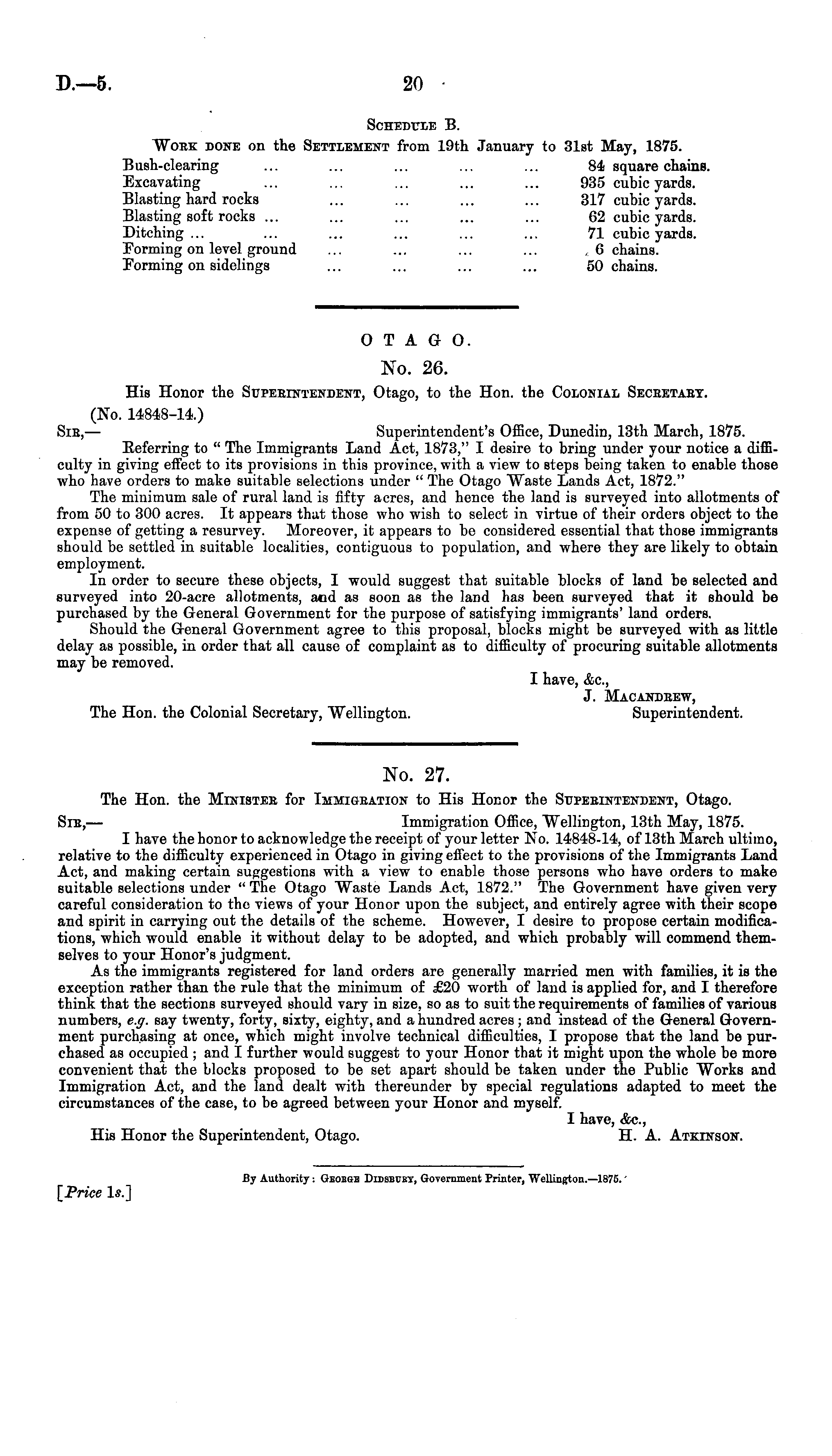 Schedule B. Woek done on the Settlement from 19th January to 31st May, 1875. Bush-clearing ... ... ... ... ... 84 square chains. Excavating ... ... ... ... ... 935 cubic yards. Blasting hard rocks ... ... ... ... 317 cubic yards. Blasting soft rocks ... ... ... ... ... 62 cubic yards. Ditching... ... ... ... ... ... 71 cubic yards. Forming on level ground ... ... ... ... 6 chains. Forming on sidelings ... ... ... ... 50 chains.