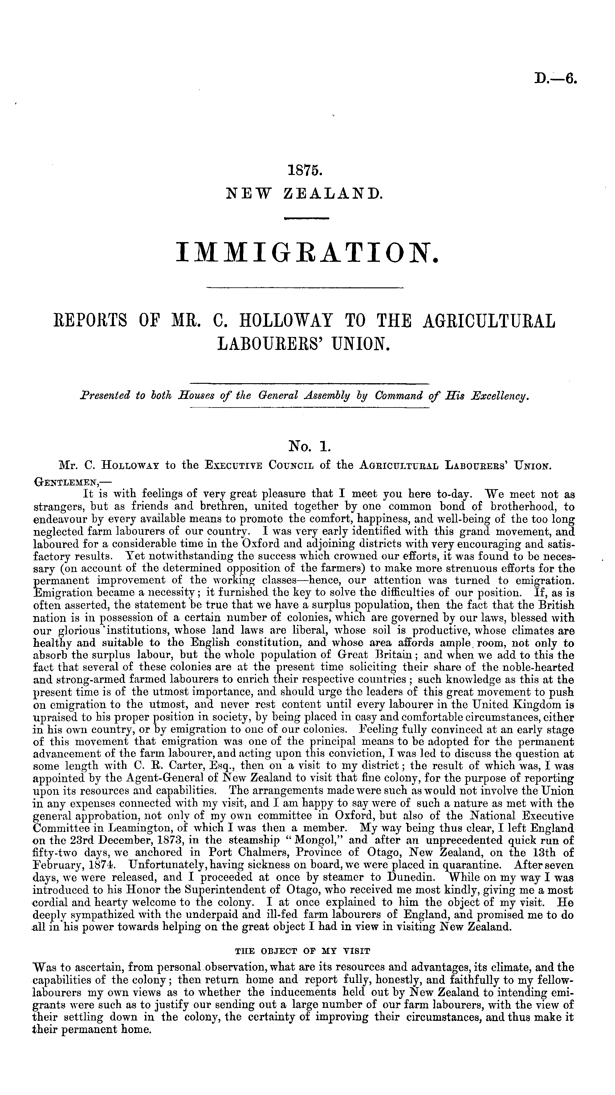 No. l. Mr. C. Holloway to the Executive Council of the Ageicultueal Laboubebs' Union. Gentlemen, — It is with feelings of very great pleasure that I meet you here to-day. We meet not as strangers, but as friends and brethren, united together by one common bond of brotherhood, to endeavour by every available means to promote the comfort, happiness, and well-being of the too long neglected farm labourers of our country. I was very early identified with this grand movement, and laboured for a considerable time in the Oxford and adjoining districts with very encouraging and satisfactory results. Yet notwithstanding the success which crowned our efforts, it was found to be necessary (on account of the determined opposition of the farmers) to make more strenuous efforts for the permanent improvement of the working classes —hence, our attention was turned to emigration. Emigration became a necessity; it furnished the key to solve the difficulties of our position. If, as is often asserted, the statement be true that we have a surplus population, then the fact that the British nation is in possession of a certain number of colonies, which are governed by our laws, blessed with our glorious 'institutions, whose land laws are Überal, whose soil is productive, whose climates are healthy and suitable to the English constitution, and whose area affords ample. room, not only to absorb the surplus labour, but the whole population of Great Britain ; and when we add to this the fact that several of these colonies are at the present time soliciting their share of the noble-hearted and strong-armed farmed labourers to enrich their respective countries ; such knowledge as this at the present time is of the utmost importance, and should urge the leaders of this great movement to push on emigration to the utmost, and never rest content until every labourer in the United Kingdom is upraised to his proper position in society, by being placed in easy and comfortable circumstances, cither in his own country, or by emigration to oue of our colonies. Feeling fully convinced at an early stage of this movement that emigration was one of the principal means to bo adopted for the permanent advancement of the farm labourer, and acting upon this conviction, I was led to discuss the question at some length with C. E. Carter, Esq., then ou a visit to my district; the result of which was, I was appointed by the Agent-General of New Zealand to visit that fine colony, for the purpose of reporting upon its resources aud capabilities. The arrangements made were such as would not involve the Union in any expenses connected with my visit, and I am happy to say were of such a nature as met with the general approbation, not only of my own committee in Oxford, but also of the National Executive Committee in Leamington, of which I was then a member. My way being thus clear, I left England on the 23rd December, 1873, in the steamship " Mongol," and after an unprecedented quick run of fifty-two days, we anchored in Port Chalmers, Province of Otago, New Zealand, on the 13th of February, 1874. Unfortunately, having sickness on board, we were placed in quarantine. After seven days, we were released, and I proceeded at once by steamer to Dunedin. While on my way I was introduced to his Honor the Superintendent of Otago, who received me most kindly, giving me a most cordial and hearty welcome to the colony. I at once explained to him the object of my visit. He deeply sympathized with the underpaid and ill-fed farm labourers of England, and promised me to do all in his power towards helping on the great object I had in view in visiting New Zealand. THE OBJECT OF MY VISIT Was to ascertain, from personal observation, what are its resources and advantages, its climate, and the capabilities of the colony; then return home and report fully, honestly, and faithfully to my fellowlabourers my own views as to whether the inducements held out by New Zealand to intending emigrants were such as to justify our sending out a large number of our farm labourers, with the view of their settling down in the colony, the certainty of improving their circumstances, and thus make it their permanent home.