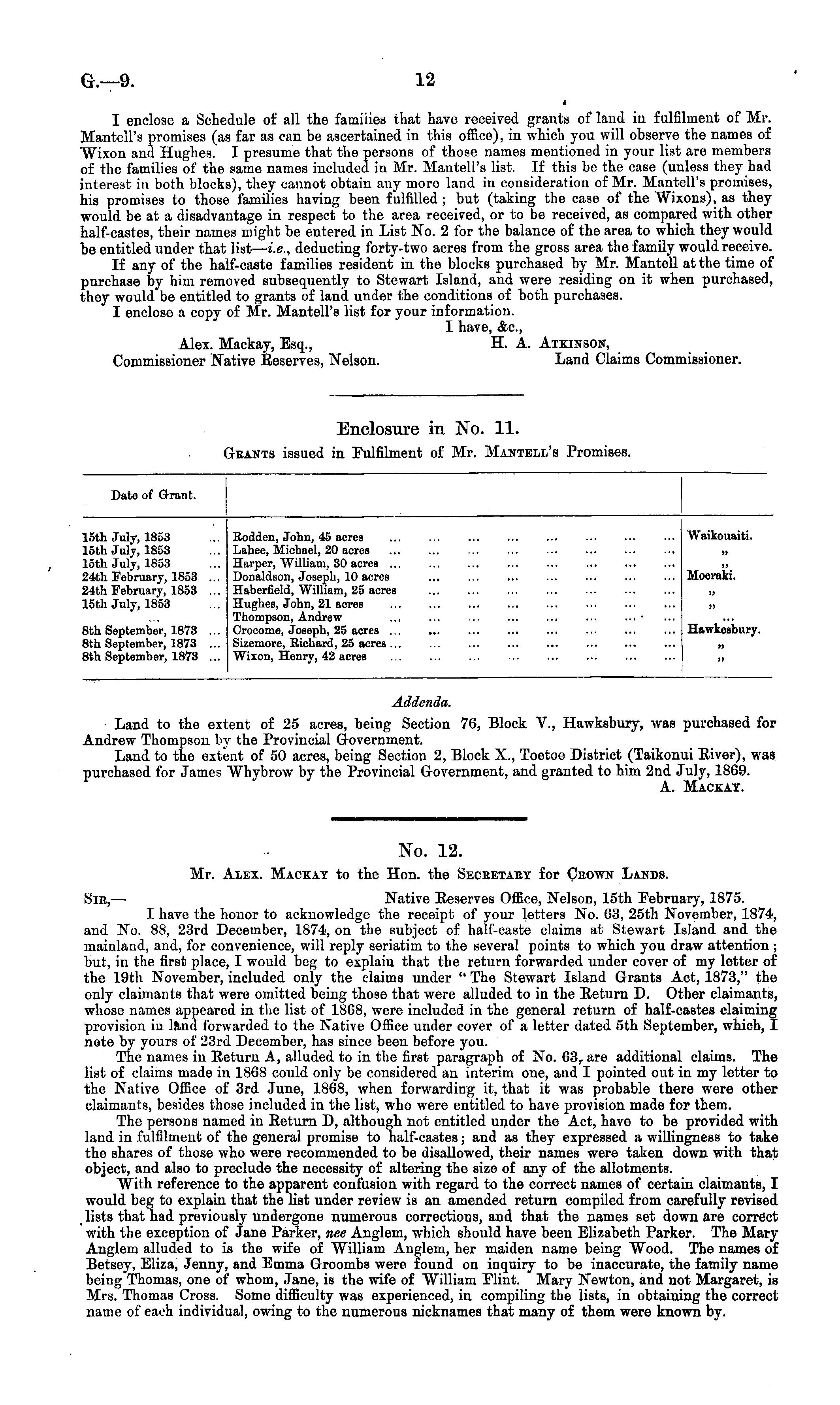 No. 12. Mr. Alex. Mackat to the Hon. the Seceetaet for Ceown Lands. Sir, — Native Beserves Office, Nelson, 15th February, 1875. I have the honor to acknowledge the receipt of your letters No. 63, 25th November, 1874, and No. 88, 23rd December, 1874, on the subject of half-caste claims at Stewart Island and the mainland, and, for convenience, will reply seriatim to the several points to which you draw attention ; but, in the first place, I would beg to explain that the return forwarded under cover of my letter of the 19th November, included only the claims under " The Stewart Island Grants Act, 1873," the only claimants that were omitted being those that were alluded to in the Return D. Other claimants, whose names appeared in the list of 1868, were included in the general return of half-castes claiming provision in l&nd forwarded to the Native Office under cover of a letter dated sth September, which, I note by yours of 23rd December, has since been before you. The names in Return A, alluded to in the first paragraph of No. 63 r are additional claims. The list of claims made in 1868 could only be considered an interim one, and I pointed out in my letter to the Native Office of 3rd June, 1868, when forwarding it, that it was probable there were other claimants, besides those included in the list, who were entitled to have provision made for them. The persons named in Return D, although not entitled under the Act, have to be provided with land in fulfilment of the general promise to half-castes; and as they expressed a willingness to take the shares of those who were recommended to be disallowed, their names were taken down with that object, and also to preclude the necessity of altering the size of any of the allotments. With reference to the apparent confusion with regard to the correct names of certain claimants, I would beg to explain that the list under review is an amended return compiled from carefully revised lists that had previously undergone numerous corrections, and that the names set down are correct with the exception of Jane Parker, nee Anglem, which should have been Elizabeth Parker. The Mary Anglem alluded to is the wife of William Anglem, her maiden name being Wood. The names of Betsey, Eliza, Jenny, and Emma Groombs were found on inquiry to be inaccurate, the family name being Thomas, one of whom, Jane, is the wife of William Elint. Mary Newton, and not Margaret, is Mrs. Thomas Cross. Some difficulty was experienced, in compiling the lists, in obtaining the correct name of each individual, owing to the numerous nicknames that many of them were known by.