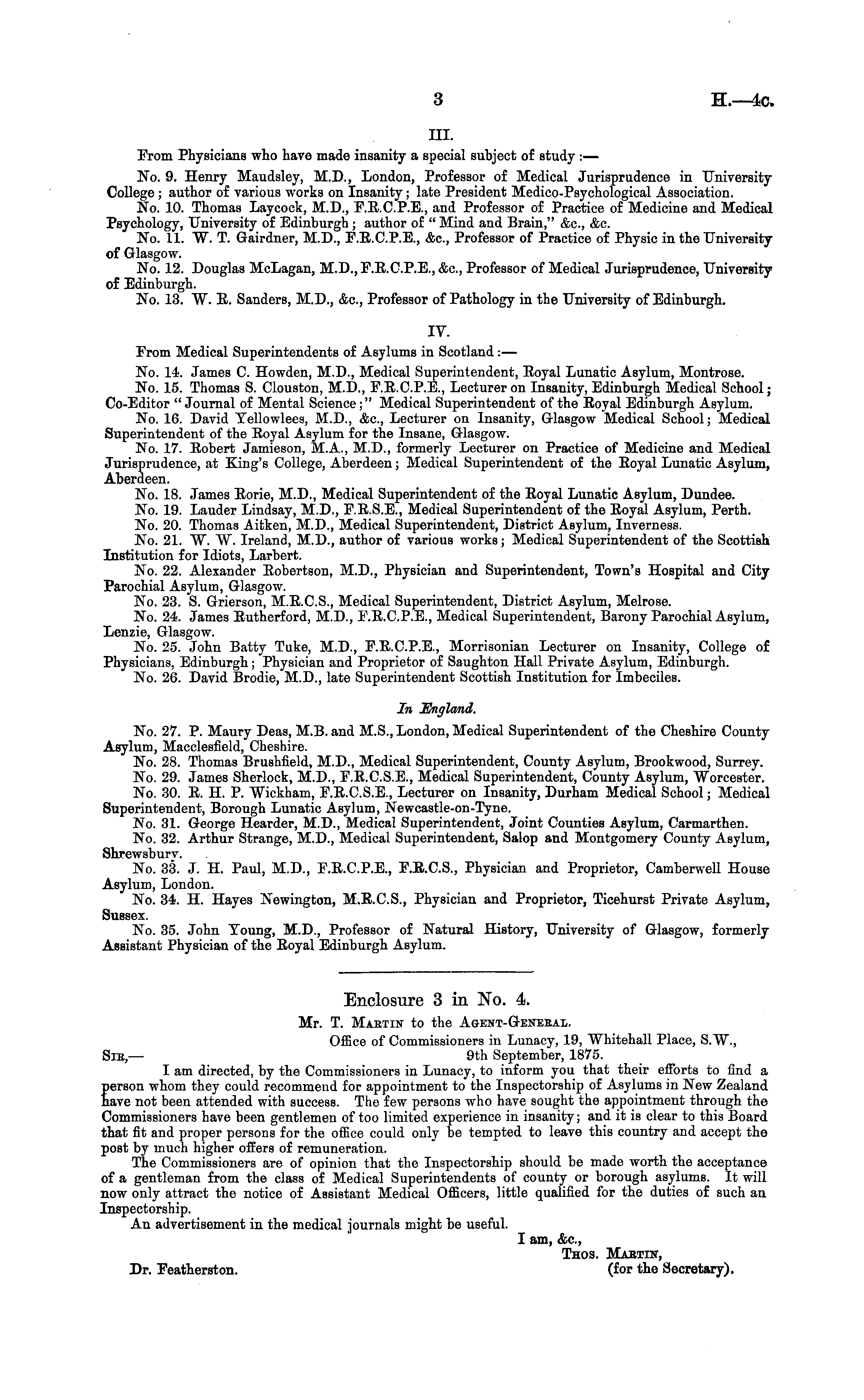 Enclosure 3 in No. 4. Mr. T. Mabtist to the Agent-Genebal. Office of Commissioners in Lunacy, 19, Whitehall Place, S.W., Sic,— 9th September, 1875. I am directed, by the Commissioners in Lunacy, to inform you that their efforts to find a person whom they could recommend for appointment to the Inspectorship of Asylums in New Zealand have not been attended with success. The few persons who have sought the appointment through the Commissioners have been gentlemen of too limited experience in insanity; and it is clear to this Board that fit and proper persons for the office could only be tempted to leave this country and accept the post by much higher offers of remuneration. The Commissioners are of opinion that the Inspectorship should be made worth the acceptance of a gentleman from the class of Medical Superintendents of county or borough asylums. It will now only attract the notice of Assistant Medical Officers, little qualified for the duties of such aa Inspectorship. An advertisement in the medical journals might be useful. I am, &c, Thos. Maetdc, Dr. Featherston. (for the Secretary).