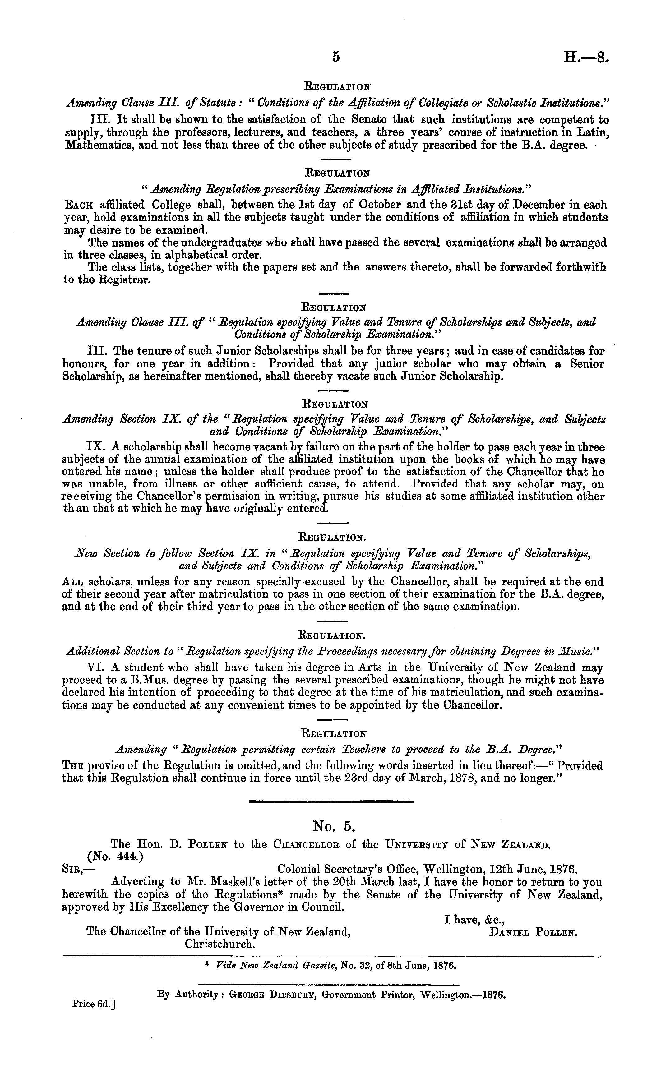 No. 5. The Hon. D. Pollen to the Chancellob of the Univeesity of New Zealand. (No. 444.) Sir, — Colonial Secretary's Office, Wellington, 12th June, 1876. Adverting to Mr. Maskell's letter of the 20th March last, I have the honor to return to you herewith the copies of the Eegulations* made by the Senate of the University of New Zealand, approved by His Excellency the Governor in Council. I have, &c, The Chancellor of the University of New Zealand, Daniel Pollen. Christchurch. * Vide New Zealand Gazette, No. 32, of Bth June, 1876.