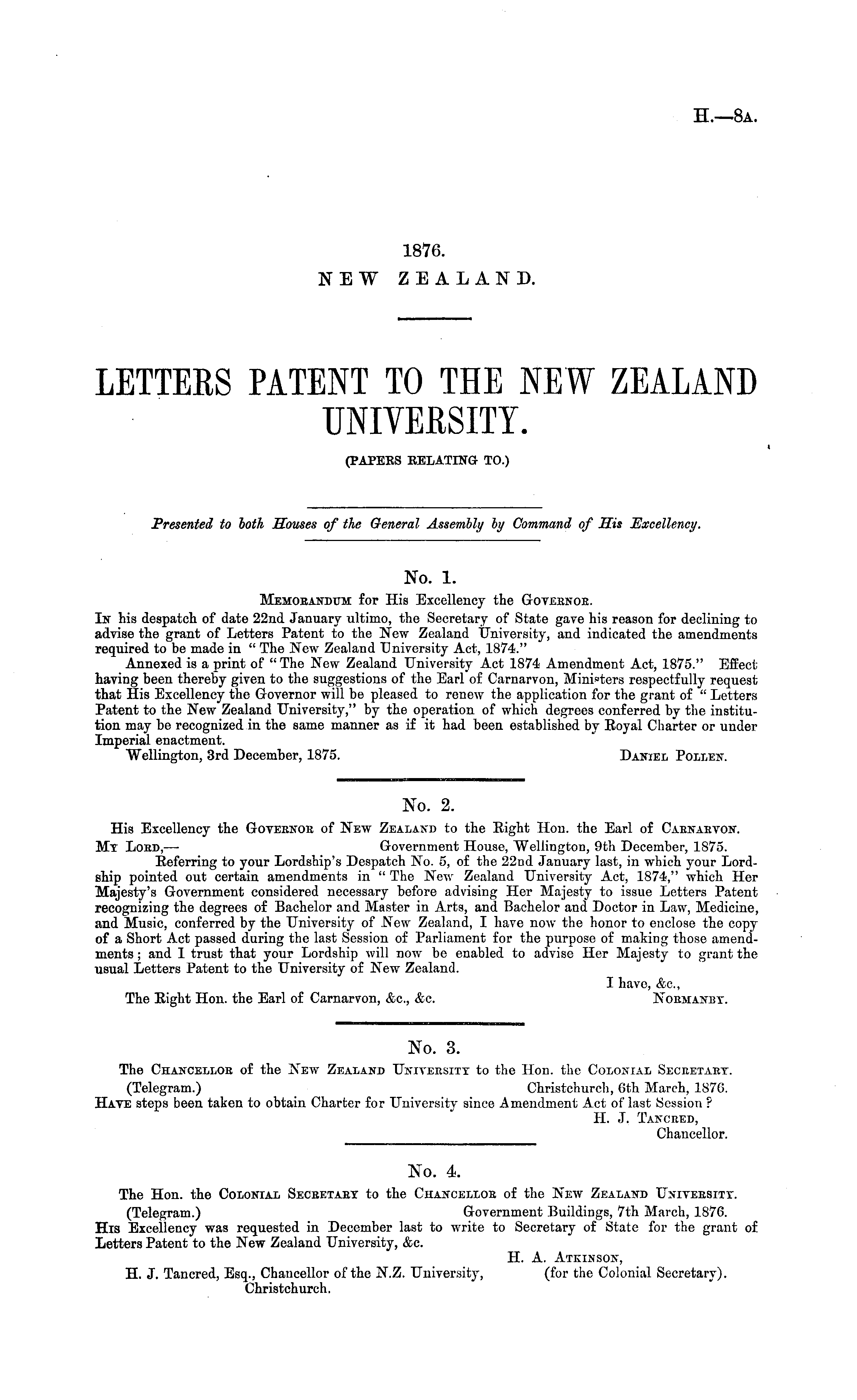 No. 3. The Chancellob of the New Zealand Univeesitt to the Hon. the Colonial Secketaet. (Telegram.) Christehurch, 6th March, 1876. Hate steps been taken to obtain Charter for University since Amendment Act of last Session ? H. J. Tanceed, Chancellor.