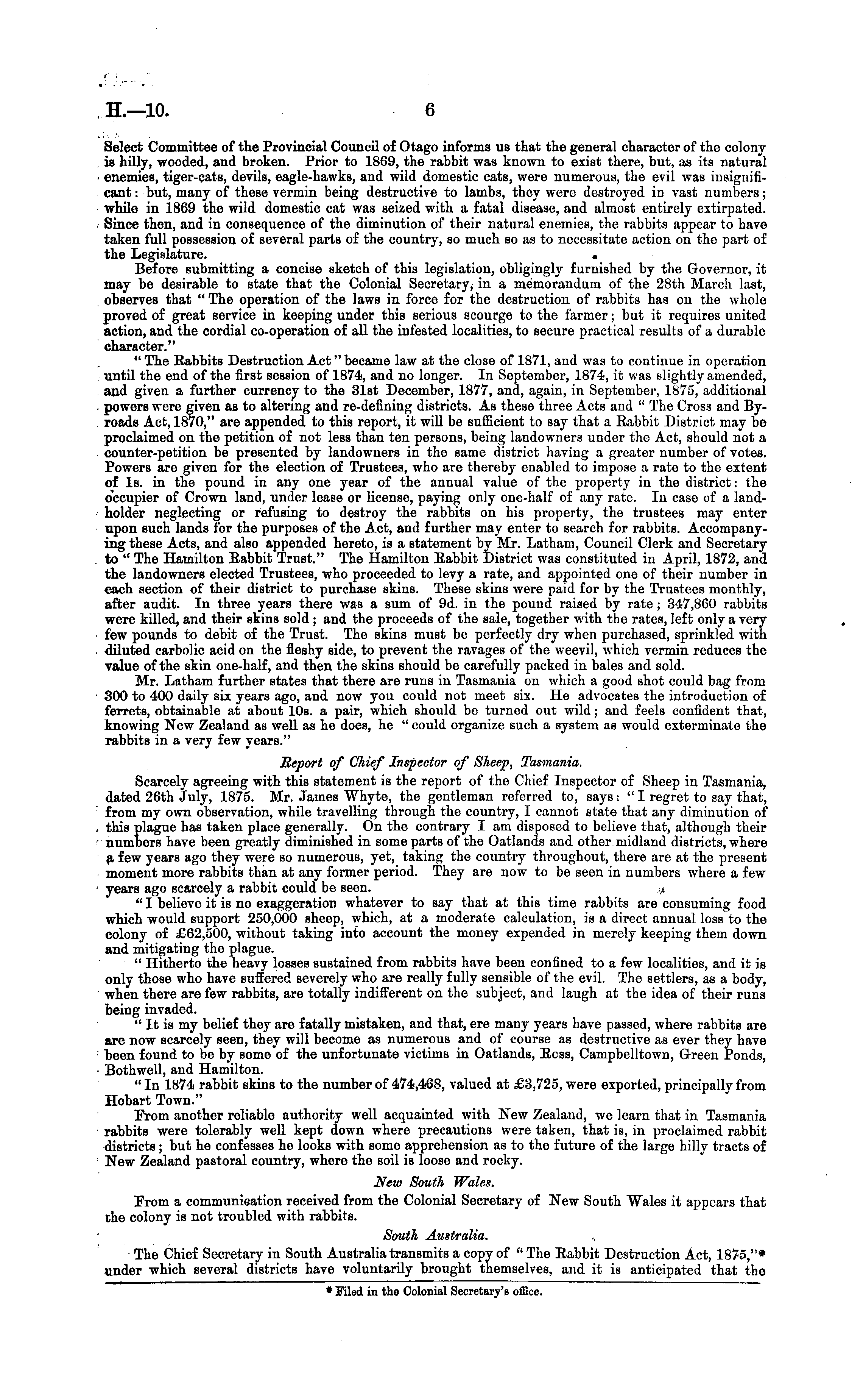 Select Committee of the Provincial Council of Otago informs us that the general character of the colonyis hilly, wooded, and broken. Prior to 1869, the rabbit was known to exist there, but, as its natural enemies, tiger-cats, devils, eagle-hawks, and wild domestic cats, were numerous, the evil was insignificant : but, many of these vermin being destructive to lambs, they were destroyed in vast numbers; while in 1869 the wild domestic cat was seized with a fatal disease, and almost entirely extirpated. Since then, and in consequence of the diminution of their natural enemies, the rabbits appear to have taken full possession of several parts of the country, so much so as to necessitate action on the part of the Legislature. « Before submitting a concise sketch of this legislation, obligingly furnished by the Governor, it may be desirable to state that the Colonial Secretary, in a memorandum of the 28th March last, observes that " The operation of the laws in force for the destruction of rabbits has ou the whole proved of great service in keeping under this serious scourge to the farmer; but it requires united action, and the cordial co-operation of all the infested localities, to secure practical results of a durable character." " The Rabbits Destruction Act" became law at the close of 1871, and was to continue in operation until the end of the first session of 1874, and no longer. In September, 1874, it was slightly amended, and given a further currency to the 31st December, 1877, and, again, in September, 1875, additional powers were given as to altering and re-defining districts. As these three Acts and " The Cross and Byroads Act, 1870," are appended to this report, it will be sufficient to say that a llabbit District may be proclaimed on the petition of not less than ten persons, being landowners under the Act, should not a counter-petition be presented by landowners in the same district having a greater number of votes. Powers are given for the election of Trustees, who are thereby enabled to impose a rate to the extent of Is. in the pound in any one year of the annual value of the property in the district: the occupier of Crown land, under lease or license, paying only one-half of any rate. In case of a landholder neglecting or refusing to destroy the rabbits on his property, the trustees may enter upon such lands for the purposes of the Act, and further may enter to search for rabbits. Accompanying these Acts, and also appended hereto, is a statement by Mr. Latham, Council Clerk and Secretary to " The Hamilton Rabbit Trust." The Hamilton Eabbit District was constituted in April, 1872, and the landowners elected Trustees, who proceeded to levy a rate, and appointed one of their number in each section of their district to purchase skins. These skins were paid for by the Trustees monthly, after audit. In three years there was a sum of 9d. in the pound raised by rate ; 347,860 rabbits were killed, and their skins sold ; and the proceeds of the sale, together with the rates, left only a very few pounds to debit of the Trust. The skins must be perfectly dry when purchased, sprinkled with diluted carbolic acid on the fleshy side, to prevent the ravages of the weevil, which vermin reduces the value of the skin one-half, and then the skins should be carefully packed in bales and sold. Mr. Latham further states that there are runs in Tasmania on which a good shot could bag from 300 to 400 daily six years ago, and now you could not meet six. He advocates the introduction of ferrets, obtainable at about 10s. a pair, which should be turned out wild; and feels confident that, knowing New Zealand as well as he does, he " could organize such a system as would exterminate the rabbits in a very few years." Report of Chief Inspector of Sheep, Tasmania. Scarcely agreeing with this statement is the report of the Chief Inspector of Sheep in Tasmania, dated 26th July, 1875. Mr. James Whyte, the gentleman referred to, says :" I regret to say that, from my own observation, while travelling through the country, I cannot state that any diminution of this plague has taken place generally. On the contrary I am disposed to believe that, although their numbers have been greatly diminished in some parts of the Oatlands and other midland districts, where a few years ago they were so numerous, yet, taking the country throughout, there arc at the present moment more rabbits than at any former period. They are now to be seen in numbers where a few years ago scarcely a rabbit could be seen. " I believe it is no exaggeration whatever to say that at this time rabbits are consuming food which would support 250,000 sheep, which, at a moderate calculation, is a direct annual loss to the colony of £62,500, without taking into account the money expended in merely keeping them down and mitigating the plague. " Hitherto the heavy losses sustained from rabbits have been confined to a few localities, and it is only those who have suffered severely who are really fully sensible of the evil. The settlers, as a body, when there are few rabbits, are totally indifferent on the subject, and laugh at the idea of their runs being invaded. " It is my belief they are fatally mistaken, and that, ere many years have passed, where rabbits are are now scarcely seen, they will become as numerous and of course as destructive as ever they have been found to be by some of the unfortunate victims in Oatlands, Eoss, Campbelltown, Green Ponds, Bothwell, and Hamilton. " In 1874 rabbit skins to the number of 474,468, valued at £3.725, were exported, principally from Hobart Town." Prom another reliable authority well acquainted with New Zealand, we learn that in Tasmania rabbits were tolerably well kept down where precautions were taken, that is, in proclaimed rabbit districts; but he confesses he looks with some apprehension as to the future of the large hilly tracts of New Zealand pastoral country, where the soil is loose and rocky. New South Wale