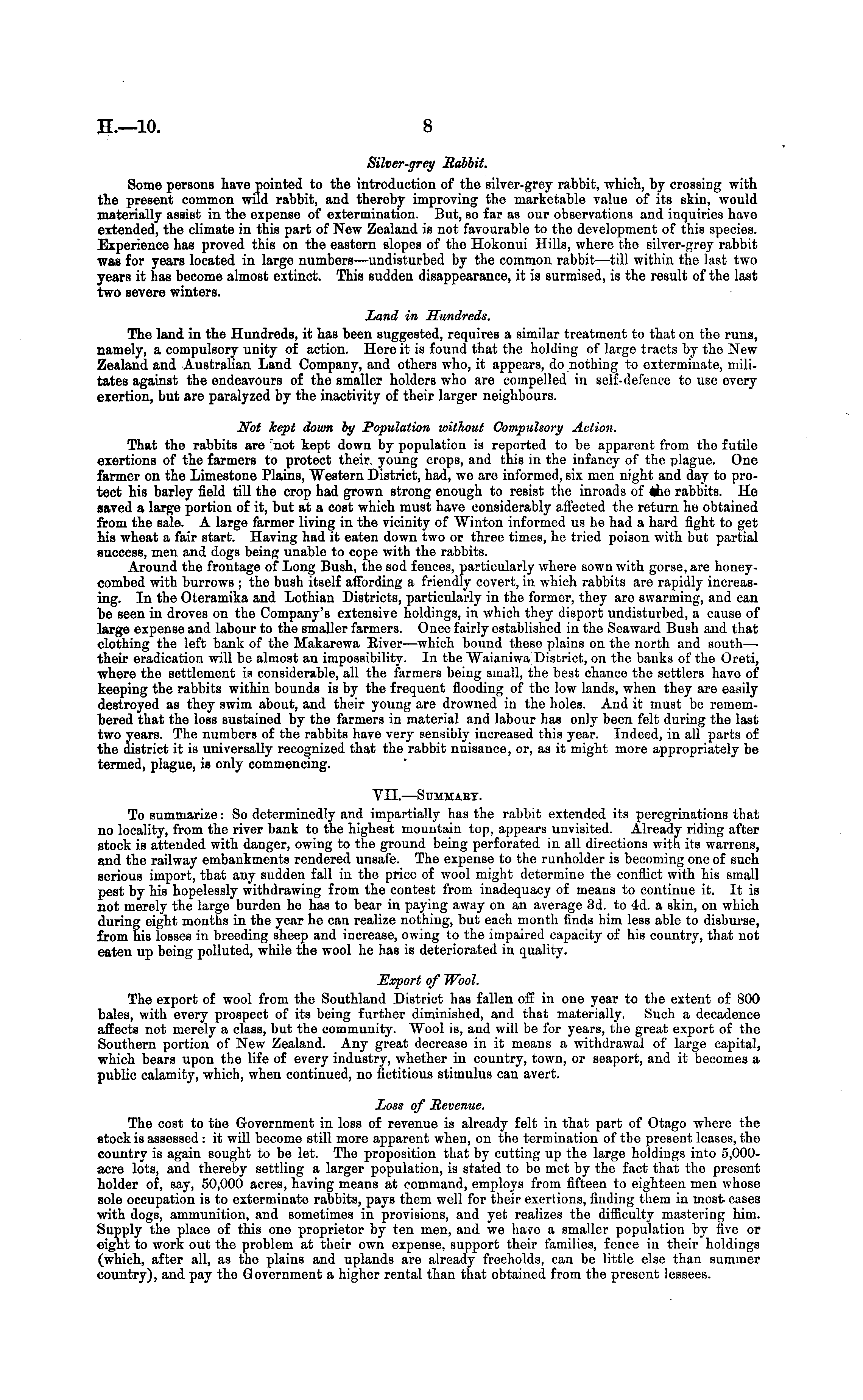 Silver-grey Babbit. Some persons have pointed to the introduction of the silver-grey rabbit, which, by crossing with the present common wild rabbit, and thereby improving the marketable value of its skin, would materially assist in the expense of extermination. But, so far as our observations and inquiries have extended, the climate in this part of New Zealand is not favourable to the development of this species. Experience has proved this on the eastern slopes of the Hokonui Hills, where the silver-grey rabbit was for years located in large numbers —undisturbed by the common rabbit—till within the last two years it has become almost extinct. This sudden disappearance, it is surmised, is the result of the last two severe winters. Land in Hundreds. The land in the Hundreds, it has been suggested, requires a similar treatment to that on the runs, namely, a compulsory unity of action. Here it is found that the holding of large tracts by the New Zealand and Australian Land Company, and others who, it appears, do nothing to exterminate, militates against the endeavours of the smaller holders who are compelled in self-defence to use every exertion, but are paralyzed by the inactivity of their larger neighbours. N"ot kept down by Population without Compulsory Action. That the rabbits are not kept down by population is reported to be apparent from the futile exertions of the farmers to protect their, young crops, and this in the infancy of the plague. One farmer on the Limestone Plains, Western District, had, we are informed, six men night and day to protect his barley field till the crop had grown strong enough to resist the inroads of ihe rabbits. He saved a large portion of it, but at a cost which must have considerably affected the return he obtained from the sale. A large farmer living in the vicinity of Winton informed us he had a hard fight to get his wheat a fair start. Having had it eaten down two or three times, he tried poison with but partial success, men and dogs being unable to cope with the rabbits. Around the frontage of Long Bush, the sod fences, particularly where sown with gorse, are honeycombed with burrows ; the bush itself affording a friendly covert, in which rabbits are rapidly increasing. In the Oteramika and Lothian Districts, particularly in the former, they are swarming, and can be seen in droves on the Company's extensive holdings, in which they disport undisturbed, a cause of large expense and labour to the smaller farmers. Once fairly established in the Seaward Bush and that clothing the left bank of the Makarewa Eiver —which bound these plains on the north and south — their eradication will bo almost an impossibility. In the Waianiwa District, on the banks of the Oreti, where the settlement is considerable, all the farmers being small, the best chance the settlers have of keeping the rabbits within bounds is by the frequent flooding of the low lands, when they are easily destroyed as they swim about, and their young are drowned in the holes. And it must be remembered that the loss sustained by the farmers in material and labour has only been felt during the last two years. The numbers of the rabbits have very sensibly increased this year. Indeed, in all parts of the district it is universally recognized that the rabbit nuisance, or, as it might more appropriately be termed, plague, is only commencing. VII.—SuiIMAEY. To summarize: So determinedly and impartially has the rabbit extended its peregi'inations that no locality, from the river bank to the highest mountain top, appears unvisited. Already riding after stock is attended with danger, owing to the ground being perforated in all directions with its warrens, and the railway embankments rendered unsafe. The expense to the runholder is becoming one of such serious import, that any sudden fall in the price of wool might determine the conflict with his small pest by his hopelessly withdrawing from the contest from inadequacy of means to continue it. It is not merely the large burden he has to bear in paying away on an average 3d. to 4d. a skin, on which during eight months in the year he can realize nothing, but each month finds him less able to disburse, from his losses in breeding sheep and increase, owing to the impaired capacity of his country, that not eaten up being polluted, while the wool he has is deteriorated in quality. Export of Wool. The export of wool from the Southland District has fallen off in one year to the extent of 800 bales, with every prospect of its being further diminished, and that materially. Such a decadence affects not merely a class, but the community. Wool is, and will be for years, the great export of the Southern portion of New Zealand. Any great decrease in it means a withdrawal of large capital, which bears upon the life of every industry, whether in country, town, or seaport, and it becomes a public calamity, which, when continued, no fictitious stimulus can avert. Loss of Revenue. The cost to the Government in loss of revenue is already felt in that part of Otago where the stock is assessed : it will become still more apparent when, on the termination of the present leases, the country is again sought to be let. The proposition that by cutting up the large holdings into 5,000--acre lots, and thereby settling a larger population, is stated to be met by the fact that the present holder of, say, 50,000 acres, having means at command, employs from fifteen to eighteen men whose sole occupation is to exterminate rabbits, pays them well for their exertions, finding them in most cases with dogs, ammunition, and sometimes in provisions, and yet realizes the difficulty mastering him. Supply the place of this one proprietor by ten men, and we have a smaller population by five or eight to work out the problem at their own expense, support their families, fence in their holdings (which, after all, as the plains and uplands are already freeholds, can be little else than summer count
