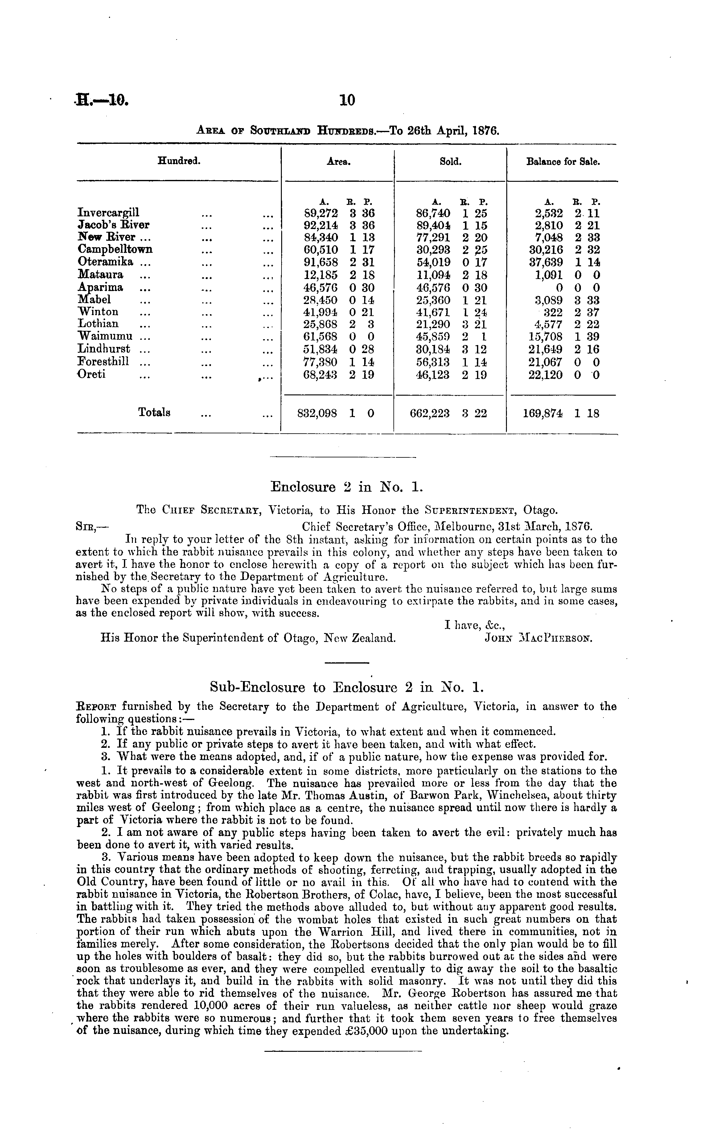 Enclosure 2 in No. 1. The Chief Secretary, Victoria, to His Honor the Superintendest, Otago. Snt,— Chief Secretary's Office, Melbourne, 31st March, 1876. In reply to your letter of the Bth instant, asking for information on certain points as to the extent to which the rabbit nuisance prevails in this colony, and whether any steps have been taken to avert it, I have the honor to enclose herewith a copy of a report on the subject which has been furnished by the. Secretary to the Department of Agriculture. No steps of a public nature have yet been taken to avert the nuisance referred to, but large sums have been expended by private individuals in endeavouring to extirpate the rabbits, and in some cases, as the enclosed report will show, with success. I have, &c, His Honor the Superintendent of Otago, New Zealand. Johx MacPhebson. Sub-Enclosure to Enclosure 2 in No. 1. Report furnished by the Secretary to the Department of Agriculture, Victoria, in answer to the following questions:— 1. If the rabbit nuisance prevails in Victoria, to what extent and when it commenced. 2. If any public or private steps to avert it have been taken, and with what effect. 3. "What were the means adopted, and, if of a public nature, how the expense was provided for. 1. It prevails to a considerable extent in some districts, more particularly on the stations to the west and north-west of Geelong. The nuisance has prevailed more or less from the day that the rabbit was first introduced by the late Mr. Thomas Austin, of Barwon Park, Winchelsea, about thirty miles west of Geelong ; from which place as a centre, the nuisance spread until now there is hardly a part of Victoria where the rabbit is not to be found. 2. lam not aware of any public steps having been taken to avert the evil: privately much has been done to avert it, with varied results. 3. Various means have been adopted to keep down the nuisance, but the rabbit breeds so rapidly in this country that the ordinary methods of shooting, ferreting, and trapping, usually adopted in the Old Country, have been found of little or no avail in this. Of all who have had to contend with the rabbit nuisance in Victoria, the Robertson Brothers, of Colac, have, I believe, been the most successful in battling with it. They tried the methods above alluded to, but without any apparent good results. The rabbits had taken possession of the wombat holes that existed in such great numbers on that portion of their run which abuts upon the WarrioD Hill, and lived there in communities, not in families merely. After some consideration, the Robertsons decided that the only plan would be to fill up the holes with boulders of basalt: they did so, but the rabbits burrowed out ac the sides and were soon as troublesome as ever, and they were compelled eventually to dig away the soil to the basaltic rock that underlays it, and build in the rabbits with solid masonry. It was not until they did this that they were able to rid themselves of the nuisance. Mr. George Robertson has assured me that the rabbits rendered 10,000 acres of their run valueless, as neither cattle nor sheep would graze where the rabbits were so numerous; and further that it took them seven years to free themselves of the nuisance, during which time they expended £35,000 upon the undertaking.