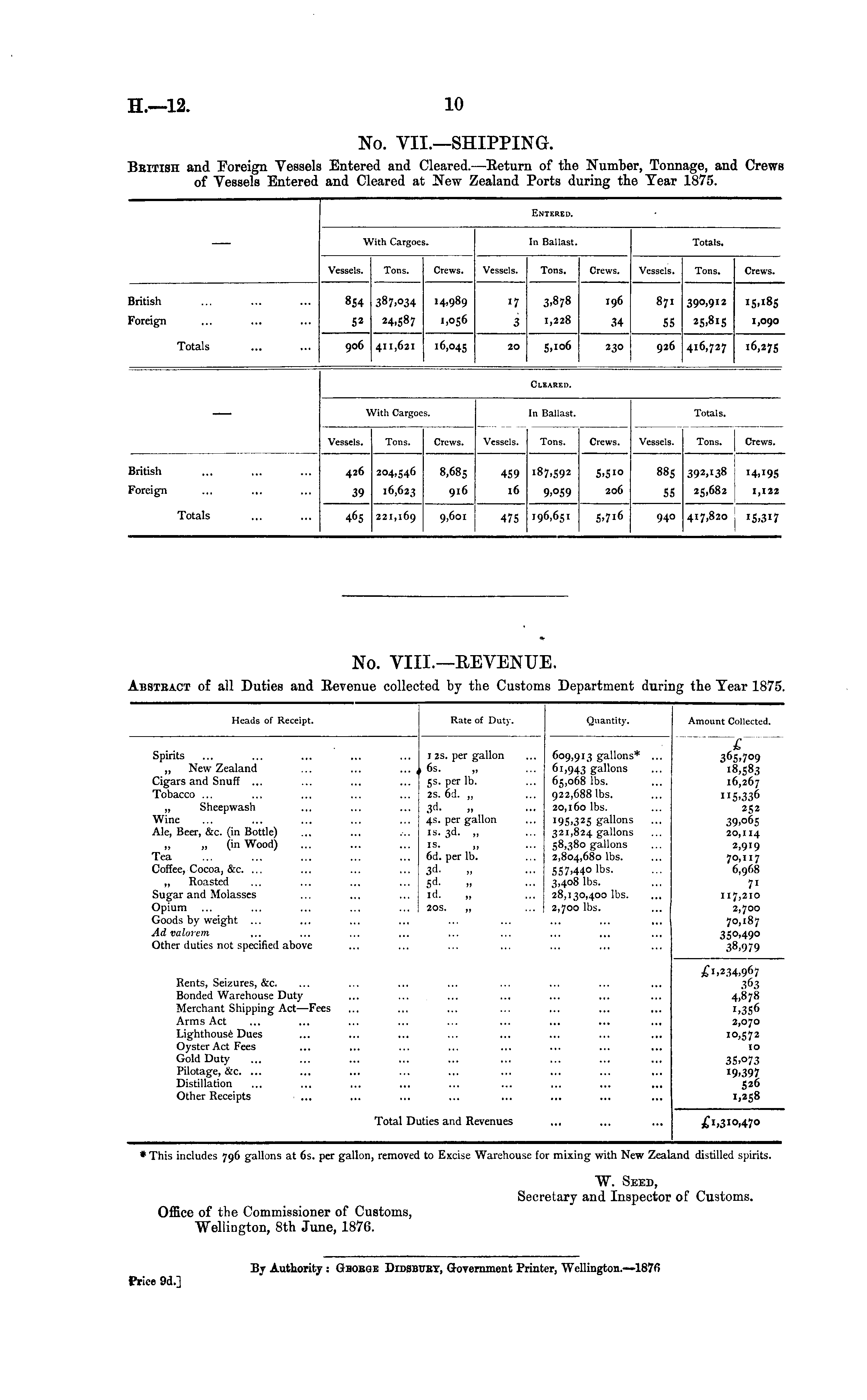 No. VII.—SHIPPING. BRITISH and Foreign Vessels Entered and Cleared. —Return of the Number, Tonnage, and Crews of Vessels Entered and Cleared at New Zealand Ports during the Year 1875.