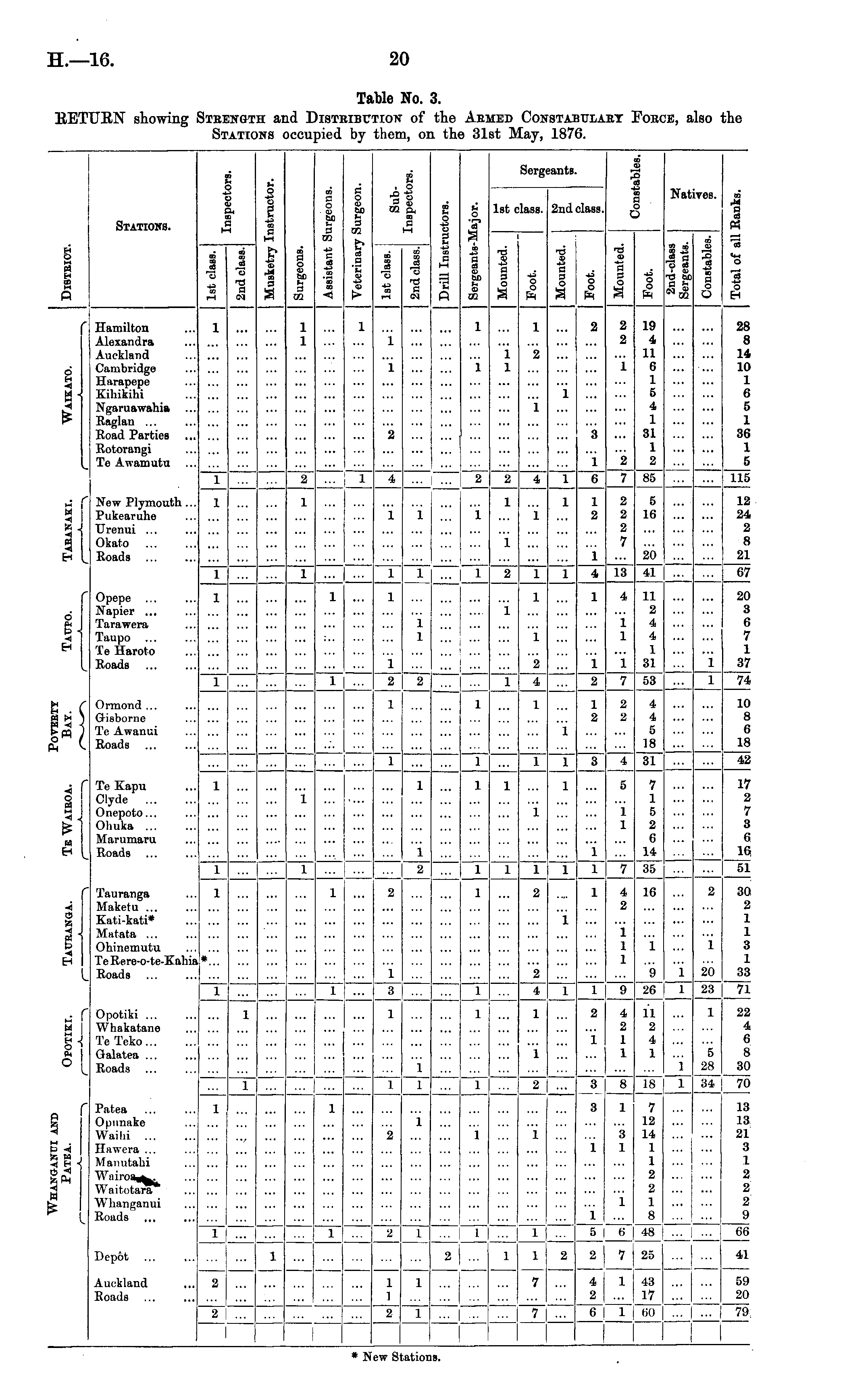 Table No. 3. RETURN showing STRENGTH and DISTRIBUTION of the ARMED CONSTABULARY FORCE, also the STATIONS occupied by them, on the 31st May, 1876.