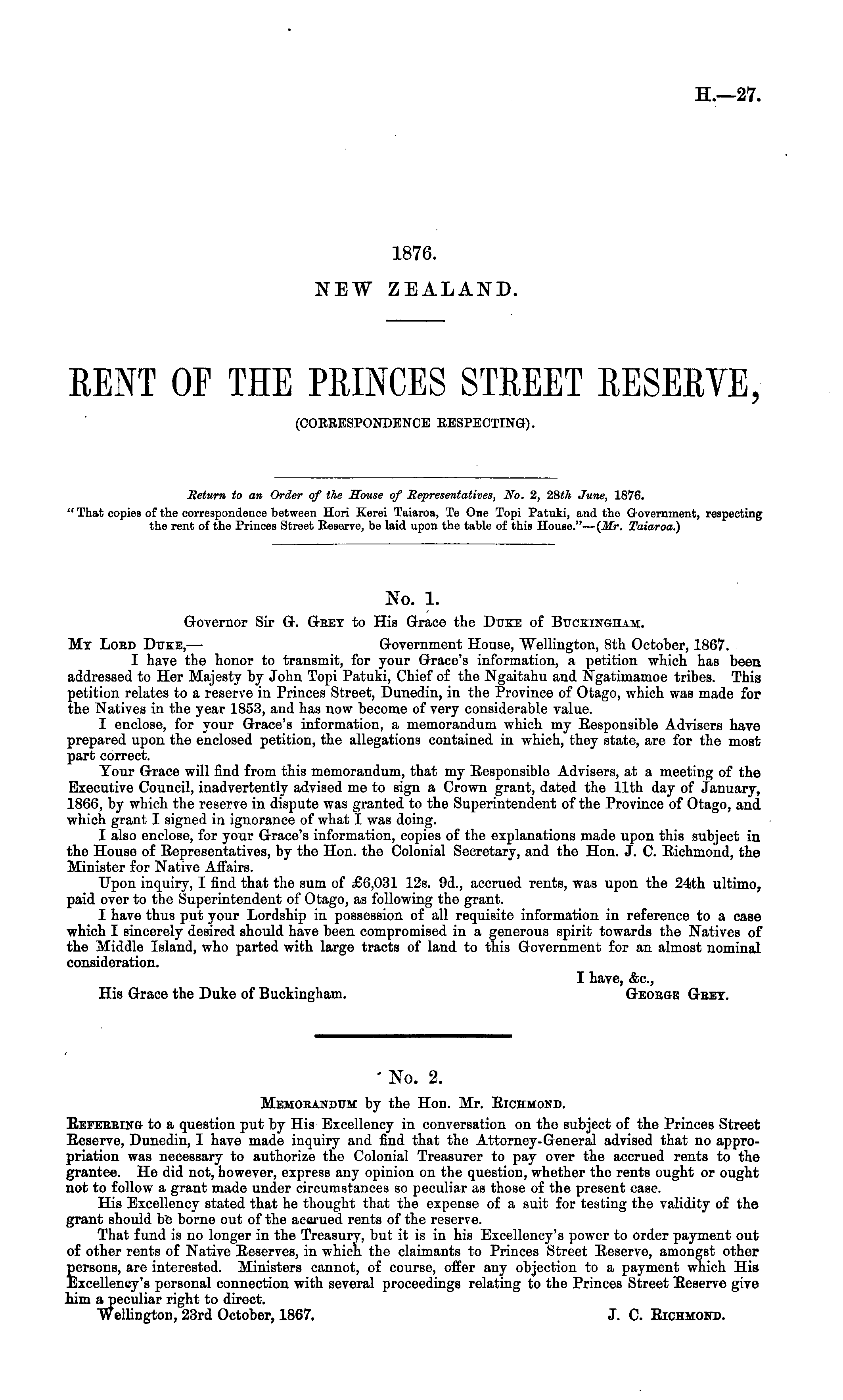 No. 1. Governor Sir G. Grey to His Grace the Duke of Buckingham. Mt Lord Duke, — Government House, Wellington, Bth October, 1867. I have the honor to transmit, for your Grace's information, a petition which has been addressed to Her Majesty by John Topi Patuki, Chief of the Ngaitahu and Ngatirnamoe tribes. This petition relates to a reserve in Princes Street, Dunedin, in the Province of Otago, which was made for the Natives in the year 1853, and has now become of very considerable value. I enclose, for your Grace's information, a memorandum which my Responsible Advisers have prepared upon the enclosed petition, the allegations contained in which, they state, are for the most part correct. Your Grace will find from this memorandum, that my Responsible Advisers, at a meeting of the Executive Council, inadvertently advised me to sign a Crown grant, dated the 11th day of January, 1860, by which the reserve in dispute was granted to the Superintendent of the Province of Otago, and which grant I signed in ignorance of what I was doing. I also enclose, for your Grace's information, copies of the explanations made upon this subject in the House of Representatives, by the Hon. the Colonial Secretary, and the Hon. J. C. Richmond, the Minister for Native Affairs. Upon inquiry, I find that the sum of £6,031 12s. 9d., accrued rents, was upon the 24th ultimo, paid over to the Superintendent of Otago, as following the grant. I have thus put your Lordship in possession of all requisite information in reference to a case which I sincerely desired should have been compromised in a generous spirit towards the Natives of the Middle Island, who parted with large tracts of land to this Government for an almost nominal consideration. I have, &c, His Grace the Duke of Buckingham. George Geet.