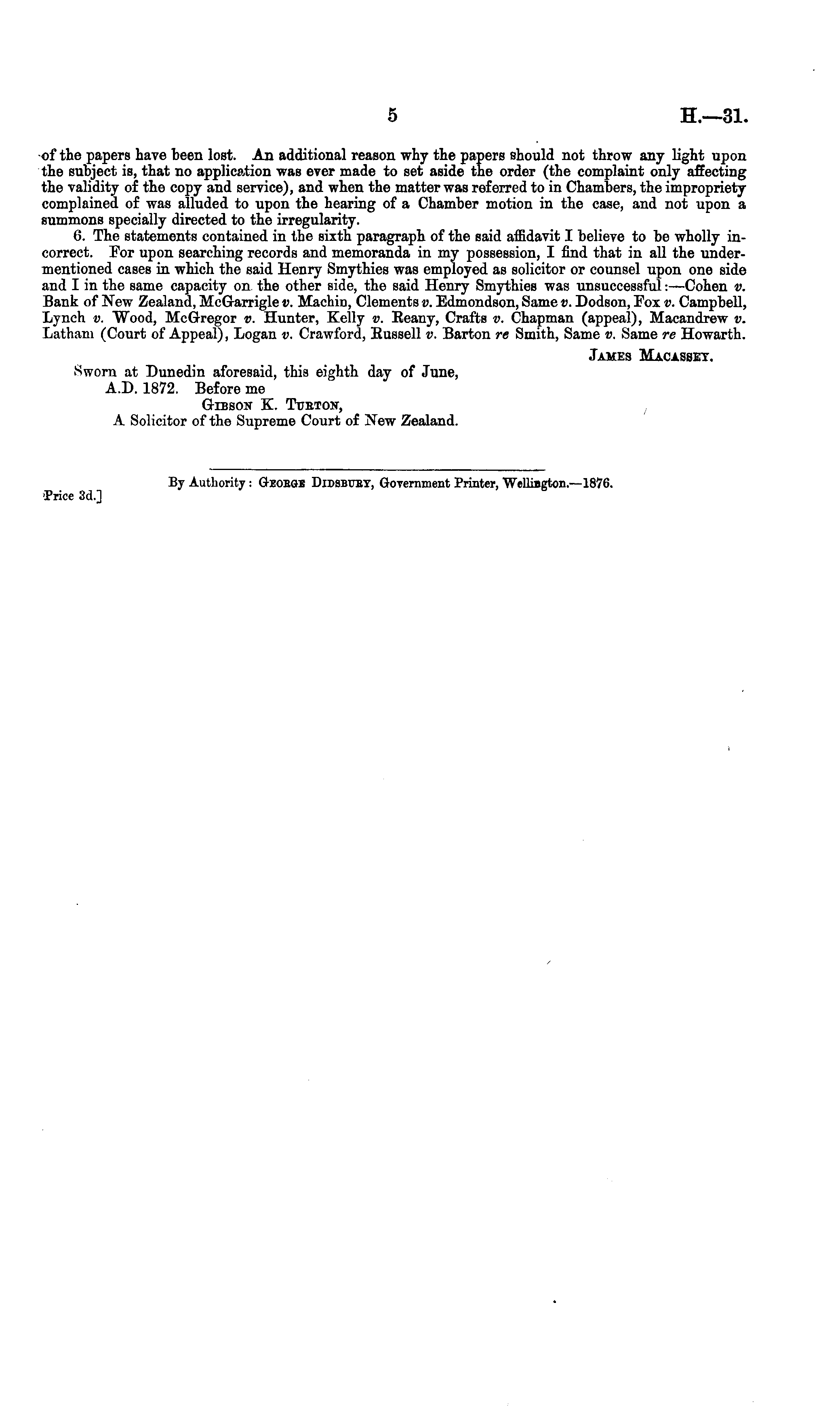 of the papers have been lost. An additional reason why the papers should not throw any light upon the subject is, that no application was ever made to set aside the order (the complaint only affecting the validity of the copy and service), and when the matter was referred to in Chambers, the impropriety complained of was alluded to upon the hearing of a Chamber motion in the case, and not upon a summons specially directed to the irregularity. 6. The statements contained in the sixth paragraph of the said affidavit I believe to be wholly incorrect. For upon searching records and memoranda in my possession, I find that in all the undermentioned cases in which the said Henry Smythies was employed as solicitor or counsel upon one side and I in the same capacity on the other side, the said Henry Smythies was unsuccessful: —Cohen v. Bank of New Zealand, McGarrigle v. Machin, Clements v. Edmondson, Same v. Dodson, Fox v. Campbell, Lynch v. "Wood, McGregor v. Hunter, Kelly v. Eeany, Crafts v. Chapman (appeal), Macandrew v. Latham (Court of Appeal), Logan v. Crawford, Eussell v. Barton re Smith, Same v. Same re Howarth. James Macasset. Sworn at Dunedin aforesaid, this eighth day of June, A.D. 1872. Before me Gibson K. TcaTON, A Solicitor of the Supreme Court of New Zealand.