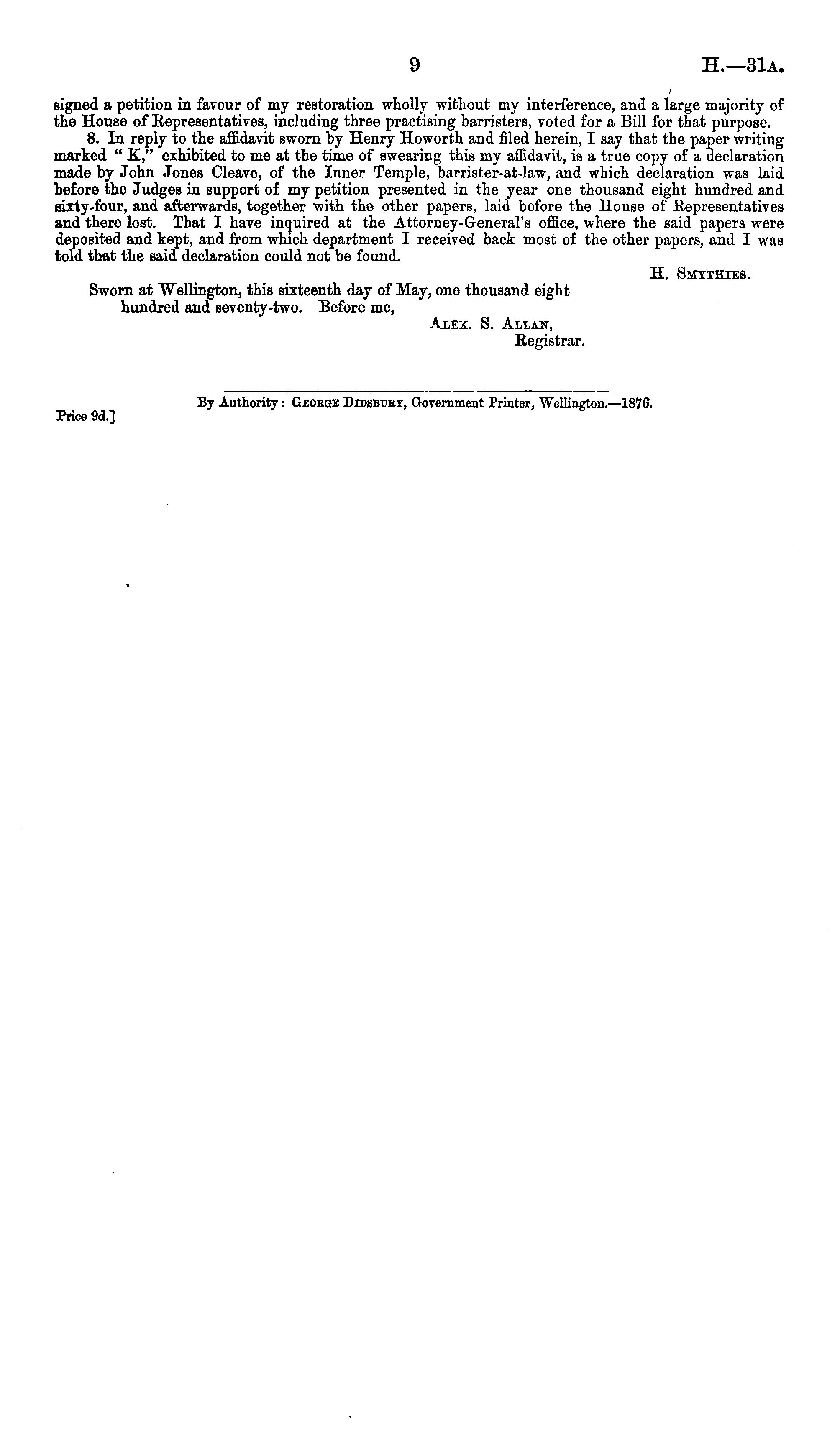 signed a petition in favour of my restoration wholly without my interference, and a large majority of the House of Representatives, including three practising barristers, voted for a Bill for that purpose. 8. In reply to the affidavit sworn by Henry Howorth and filed herein, I say that the paper writing marked " X," exhibited to me at the time of swearing this my affidavit, is a true copy of a declaration made by John Jones Cleave, of the Inner Temple, barrister-at-law, and which declaration was laid before the Judges in support of my petition presented in the year one thousand eight hundred and sixty-four, and afterwards, together with the other papers, laid before the House of Representatives and there lost. That I have inquired at the Attorney-General's office, where the said papers were deposited and kept, and from which department I received back most of the other papers, and I was told that the said declaration could not be found. H. Sutthies. Sworn at Wellington, this sixteenth day of May, one thousand eight hundred and seventy-two. Before me, Alex. S. Allan, Registrar.